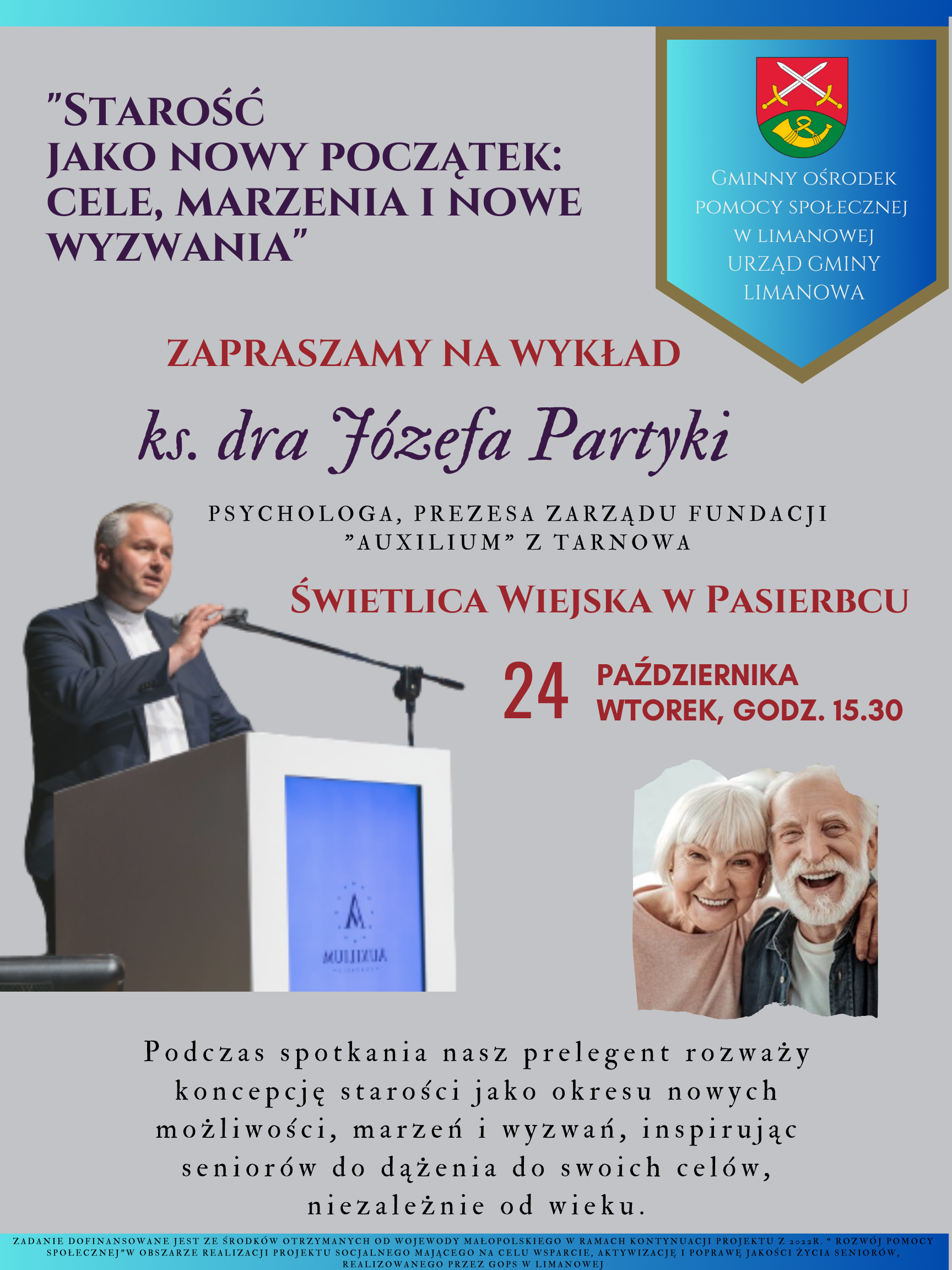 W imieniu organizatora zapraszamy na wykład ks. Józefa Partyki pn. "Starość jako nowy początek: cele,marzenia i nowe wyzwania" który odbędzie się 24 października tj. wtorek,godz.15.30 w świetlicy wiejskiej w Pasierbcu.