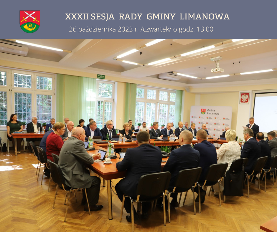 Wszystkich mieszkańców Gminy Limanowa serdecznie zapraszam do uczestniczenia w XXXII sesji Rady Gminy Limanowa,która odbędzie się w dniu 26 października 2023 r. /czwartek/ o godz. 13.00 w sali konferencyjnej Urzędu Gminy Limanowa.