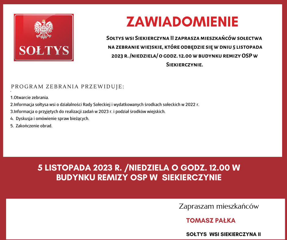 Sołtys wsi Siekierczyna II zaprasza mieszkańców sołectwa na zebranie wiejskie, które odbędzie się w dniu 5 listopada 2023 r. /niedziela/ o godz. 12:00 w budynku  Remizy OSP w Siekierczynie.