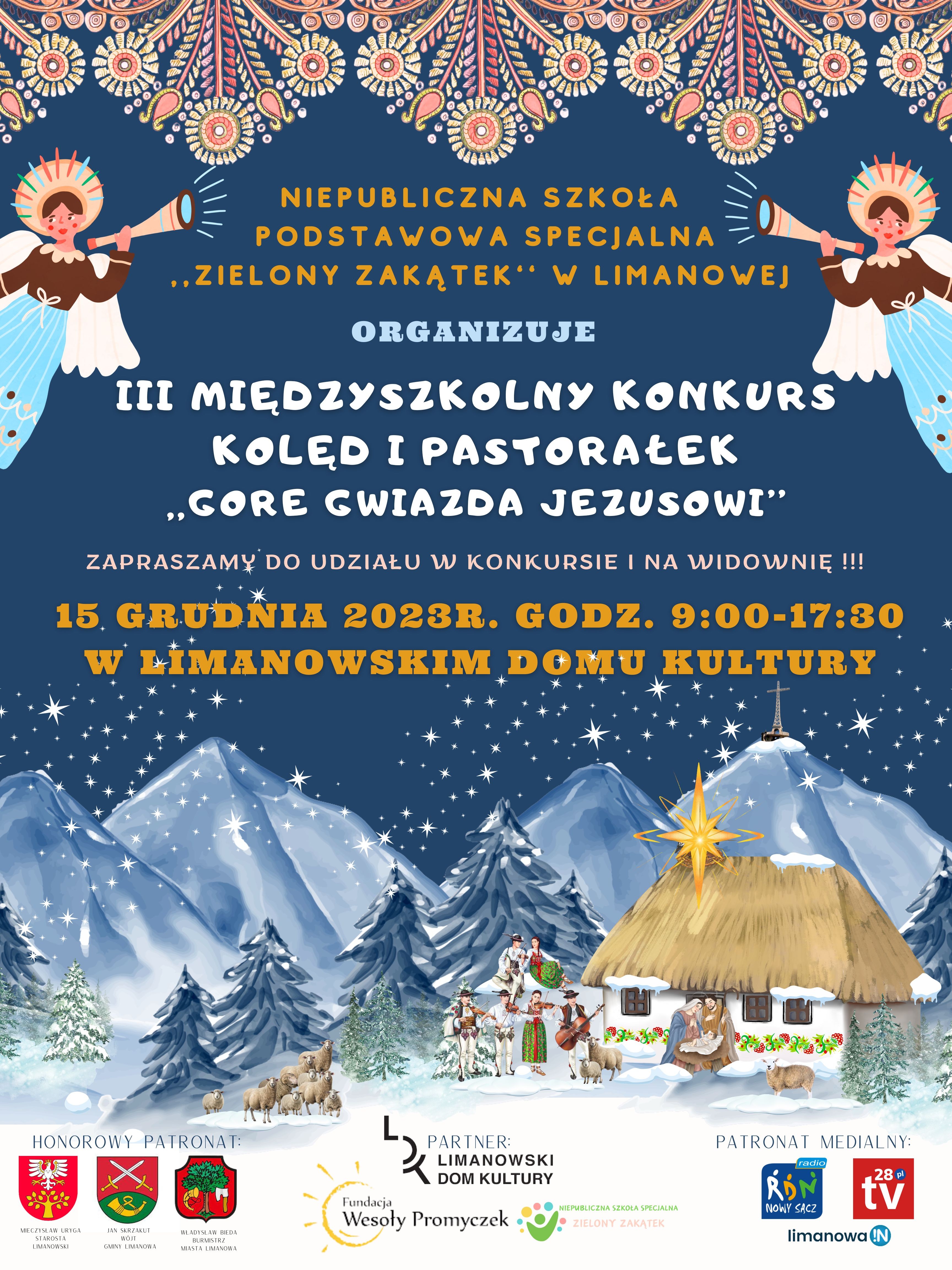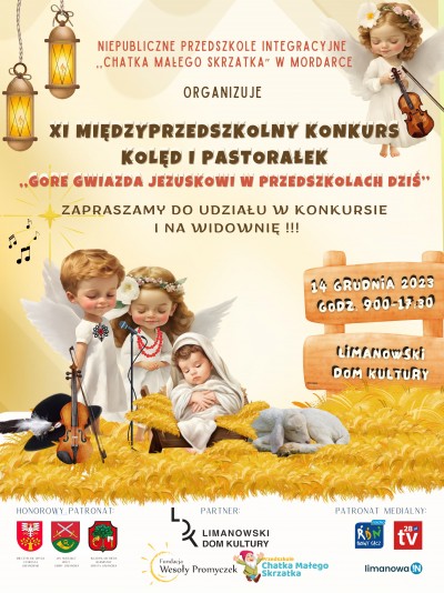 Niepubliczne Przedszkole Integracyjne " Chataka Małego Skrzatka" w Mordarce organizuje XI Międzyszkolny Konkurs Kolęd i Pastorałek "Gore Gwiazda Jezuskowi w przedszkolach i dziś" który odbędzie się 14 grudnia 2023 roku w Limanowskim Domu Kultury w godzinach od 9.00 do 17.30. Zapraszamy również na III Międzyszkolny Konkurs Kolęd i Pastorałek pod hasłem: "Gore Gwiazda Jezusowi"- 15 grudnia 2023 roku w Limanowskim Domu Kultury w godzinach od 9.00 do 17.30.