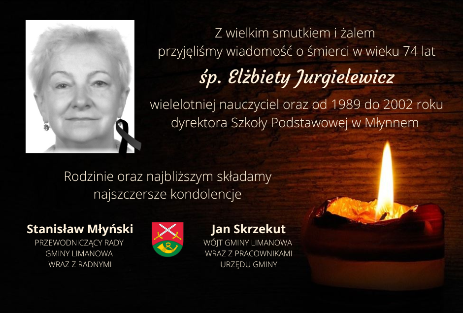 Z ogromnym smutkiem i żalem przyjęliśmy informację o śmierci, w wieku 74 lat, wieleletniej nauczyciel oraz dyrektora Szkoły Podstawowej w Młynnem śp. Elżbiety Jurgielewicz. Rodzinie oraz bliskim składamy najszczersze kondolencje.