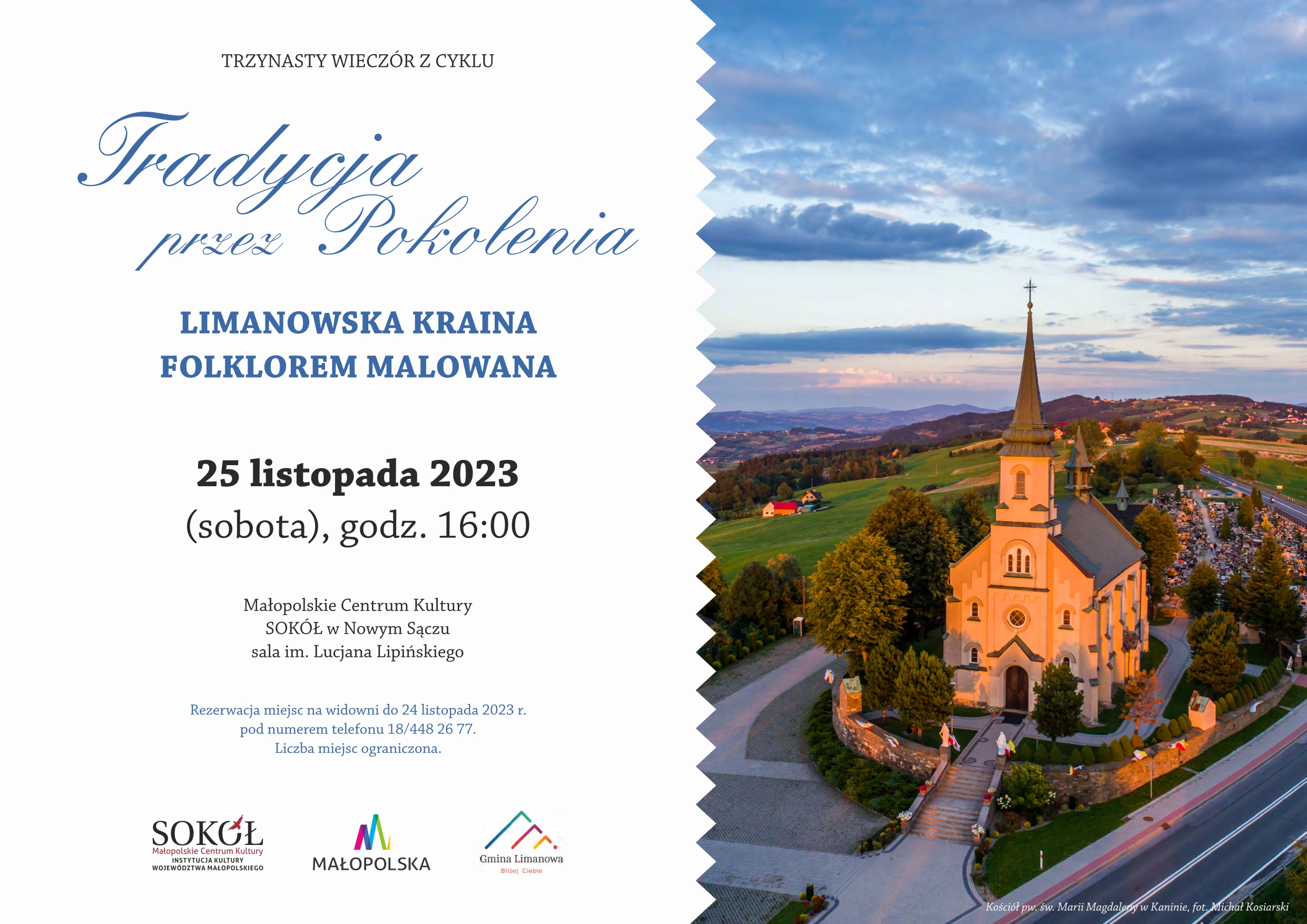 Serdecznie zapraszamy na kolejne spotkanie z cyklu TRADYCJA PRZEZ POKOLENIA, które odbędzie się 25 listopada o godz. 16:00 w sali im. L. Lipińskiego w Małopolskim Centrum Kultury SOKÓŁ w Nowym Sączu. Trzynasty wieczór cyklu będzie okazją do zapoznania się z dorobkiem kulturalnym gminy Limanowa.
