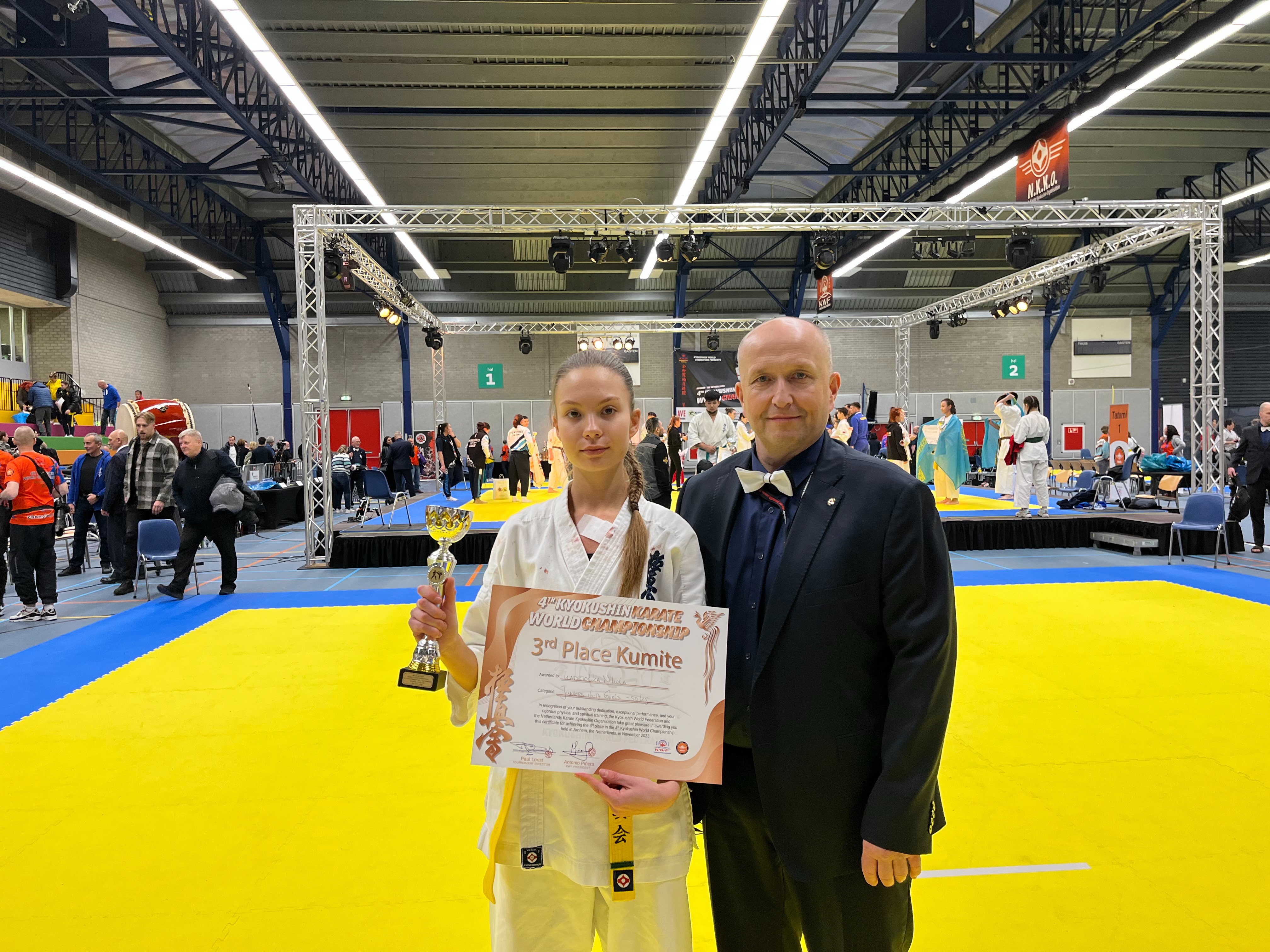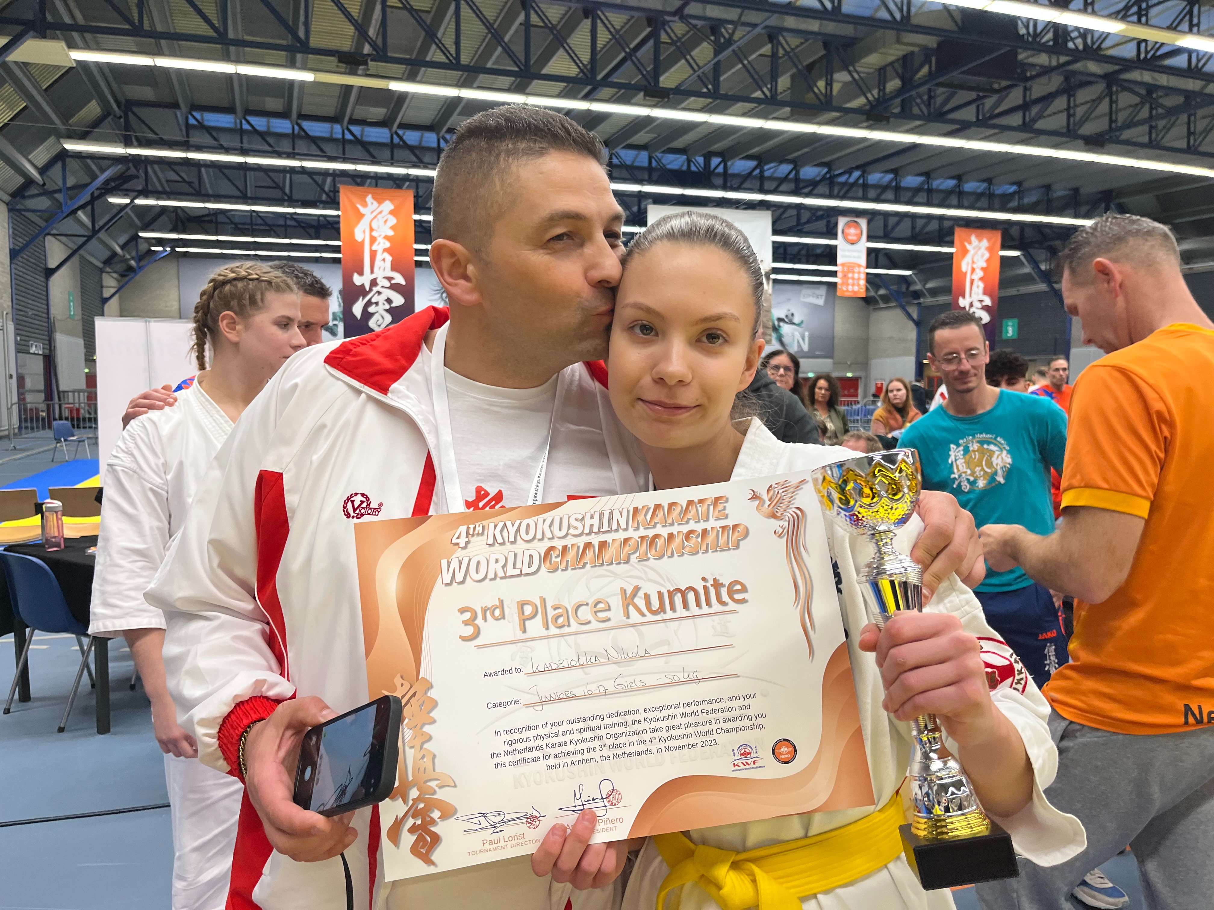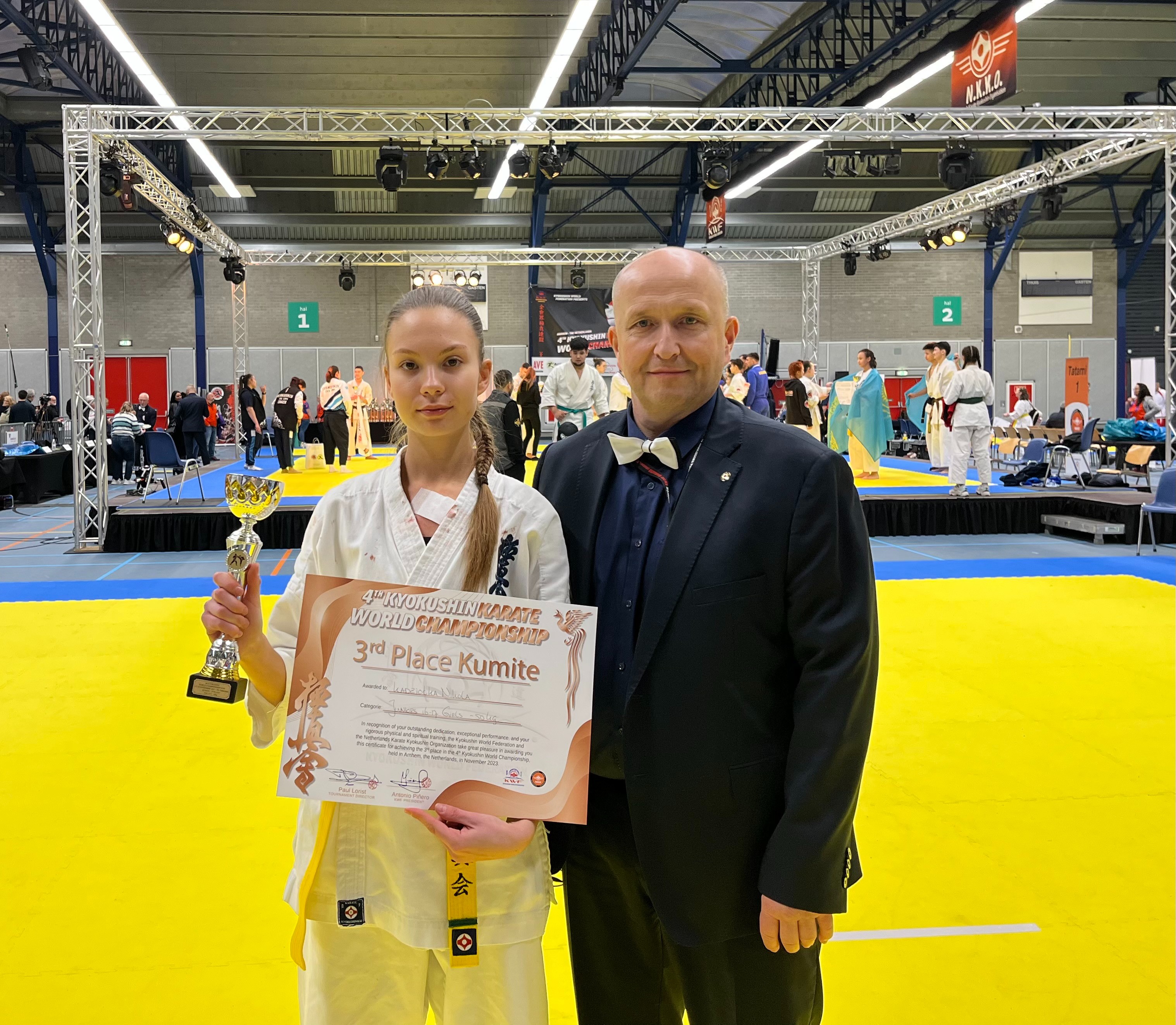 Z szóstki limanowskich karateka najwięcej szczęścia miała i największy sukces odniosła Nikola Kądziołka. W drodze na podium stoczyła dwa bardzo dobre i zacięte pojedynki. Po walce o wejście do finału, decyzją sędziów musiała uznać wygraną swojej rywalki - reprezentantki Szwecji. W efekcie końcowym Nikola Kądziołka wywalczyła brązowy medal Mistrzostw Świata Karate Kyokushin, w konkurencji kumite juniorek -50 kg. To ogromny sukces, za który Nikola zasługuje na równie duże uznanie i brawa!
