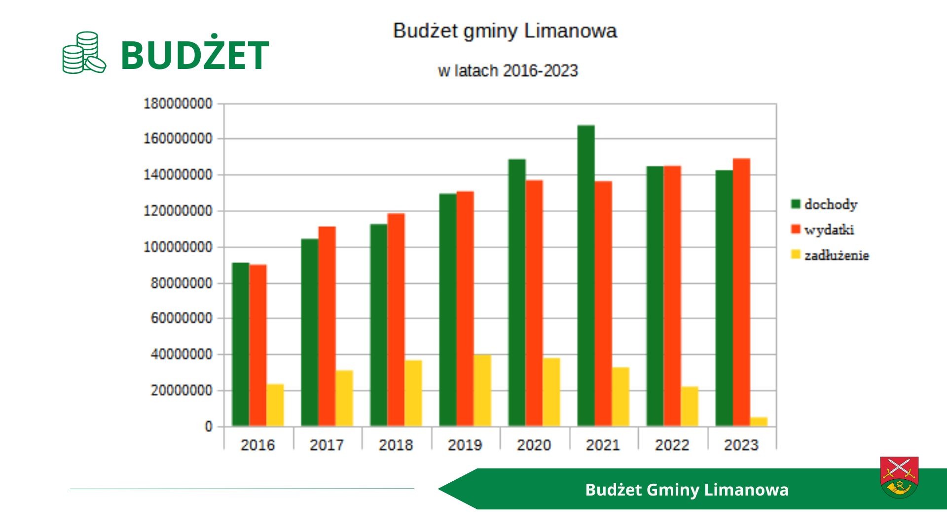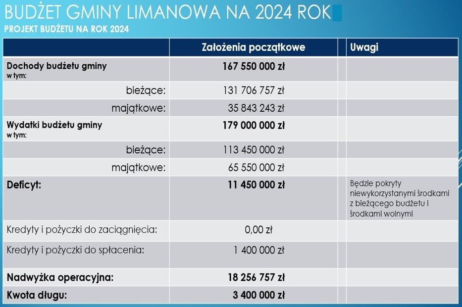 po stronie dochodów w wysokości 167 550 000 zł, a po stronie wydatków w wysokości 179 000 000 zł, z czego wydatki majątkowe stanowić będą 65 550 000 zł.