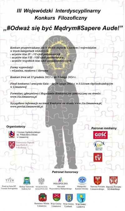 Organizatorem Interdyscyplinarnego Konkursu Filozoficznego „#Odważ się być Mądrym#Sapere Aude!” są: I Liceum Ogólnokształcące im. Wł. Orkana w Limanowej i Wydział Filozoficzny Uniwersytetu Papieskiego Jana Pawła II w Krakowie
