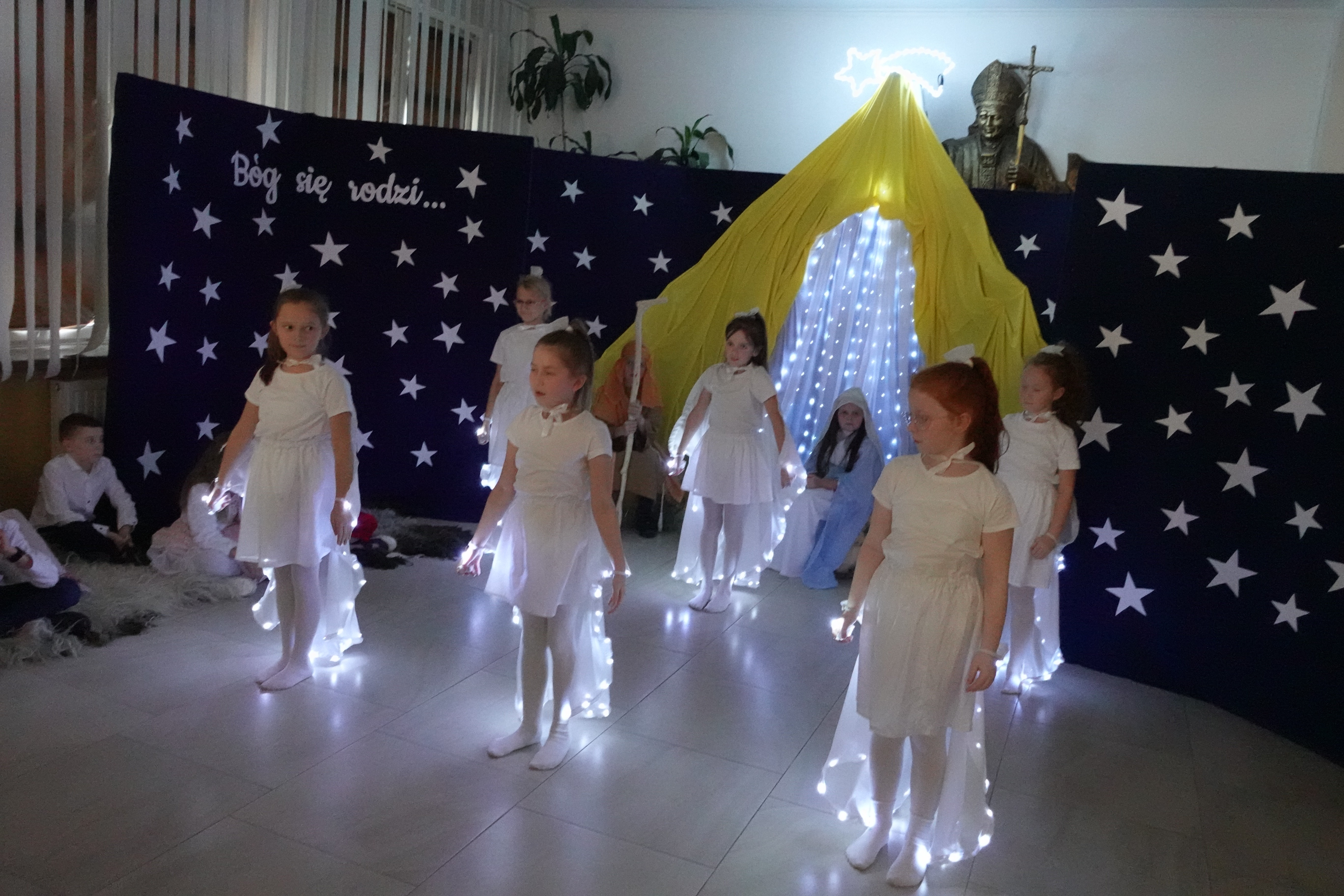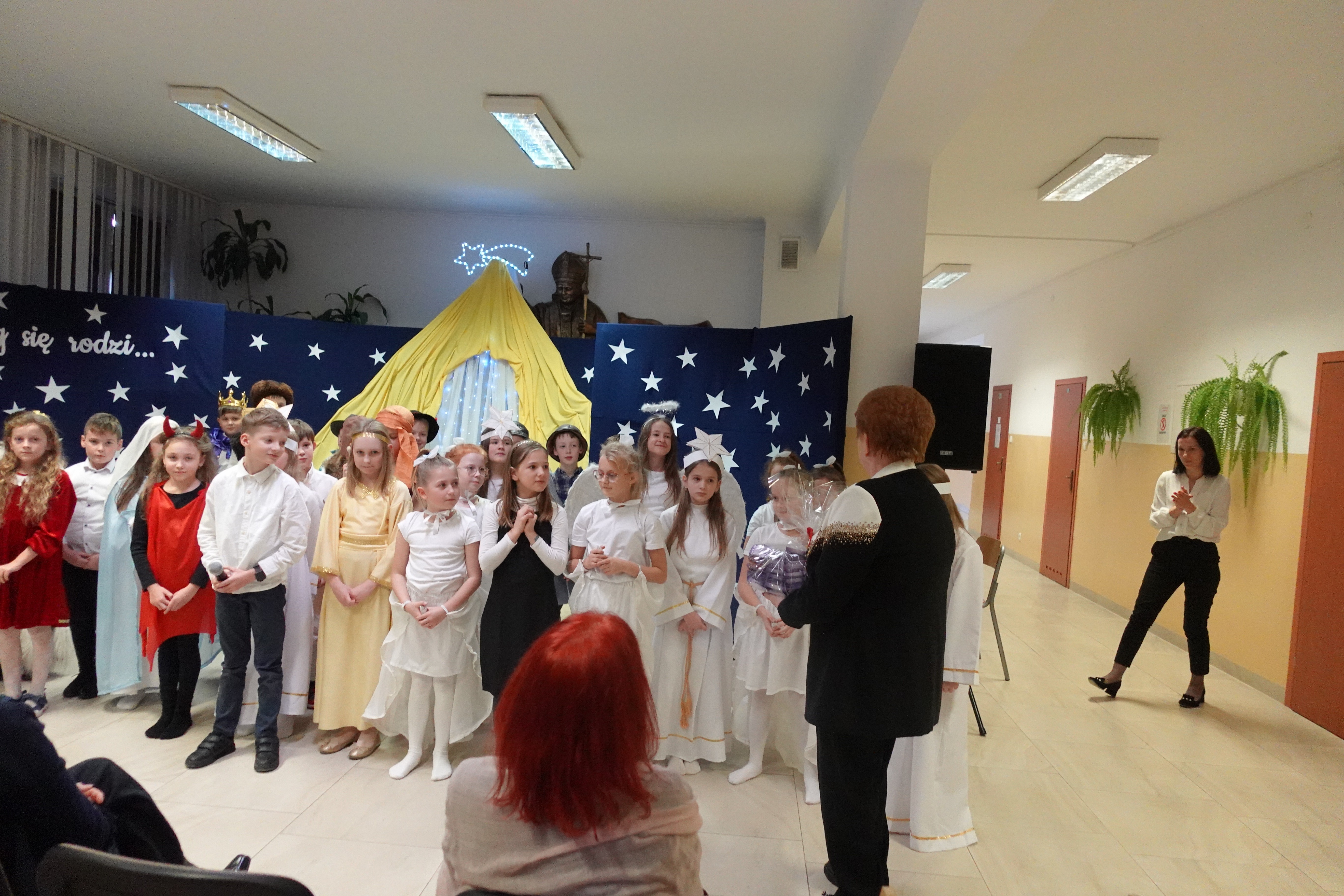 Przedstawienie w wykonaniu trzecioklasistów wprowadziło widzów w stan autentycznego i głębokiego przeżywania pamiątki Narodzenia Syna Bożego.Ciepłe, płynące prosto z serc teksty, wypowiadane z dziecięcą wrażliwością były rodzajem hołdu składanego Małemu Jezusowi. Aktorzy zaprezentowali historię narodzin Chrystusa, a zawarte w programie treści religijne przeplatane kolędami, pastorałkami oraz tańcem wytworzyły niepowtarzalny nastrój. Występujący uczniowie wykazali się dużym kunsztem aktorskim i muzycznym, wprowadzając widownię w cudowny świąteczny stan ducha.
