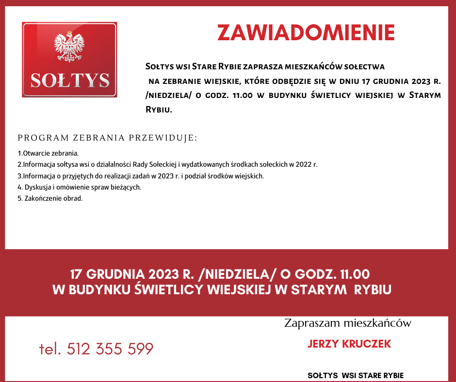Sołtys wsi Stare Rybie zaprasza mieszkańców sołectwa na zebranie wiejskie, które odbędzie się w dniu 17 grudnia 2023 r. /niedziela/ o godz. 11.00 w budynku świetlicy wiejskiej w Starym Rybiu.