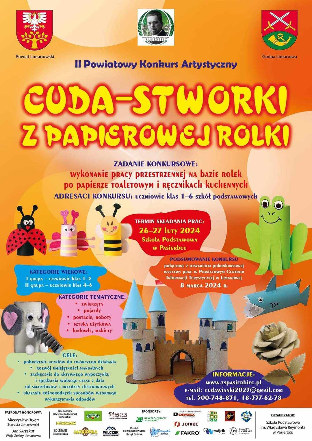 Rusza II edycja Powiatowego Konkursu Artystycznego dla uczniów klas 1-6! Rusza II edycja Powiatowego Konkursu Artystycznego pod hasłem CUDA- STWORKI Z PAPIEROWEJ ROLKI organizowanego przez Szkołę Podstawową w Pasierbcu pod honorowym patronatem STAROSTY LIMANOWSKIEGO - Pana Mieczysława Urygi oraz WÓJTA GMINY LIMANOWA -Pana Jana Skrzekuta. Konkurs skierowany jest, podobnie jak w roku poprzednim, do uczniów klas 1-6 szkół podstawowych z całego powiatu limanowskiego. Zadanie konkursowe polega na wykonaniu pracy przestrzennej na bazie rolek po papierze toaletowym i ręcznikach kuchennych. Cele konkursu to m.in. pobudzenie uczniów do twórczego działania, zachęcenie dzieci do aktywnego wypoczynku i spędzania wolnego czasu z dala od smartfonów i urządzeń elektronicznych, a także ukazanie różnorodnych sposobów wtórnego wykorzystania odpadów. Szczegółowe informacje na stronie [email protected]. Zachęcamy do udziału!