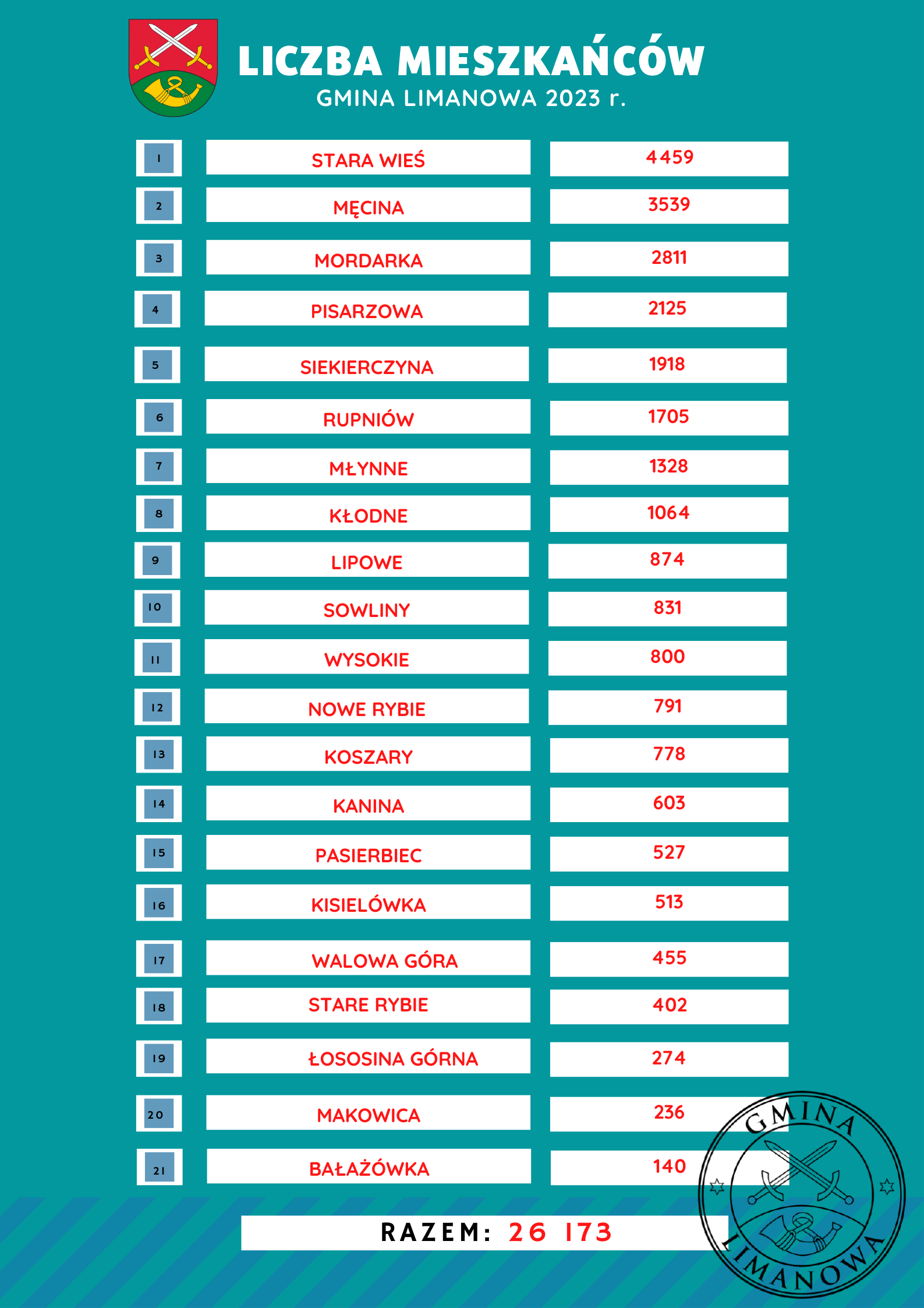 Na dzień 31 grudnia 2023 r. Gmina Limanowa liczyła 26 173 mieszkańców zameldowanych na pobyt stały i czasowy.
