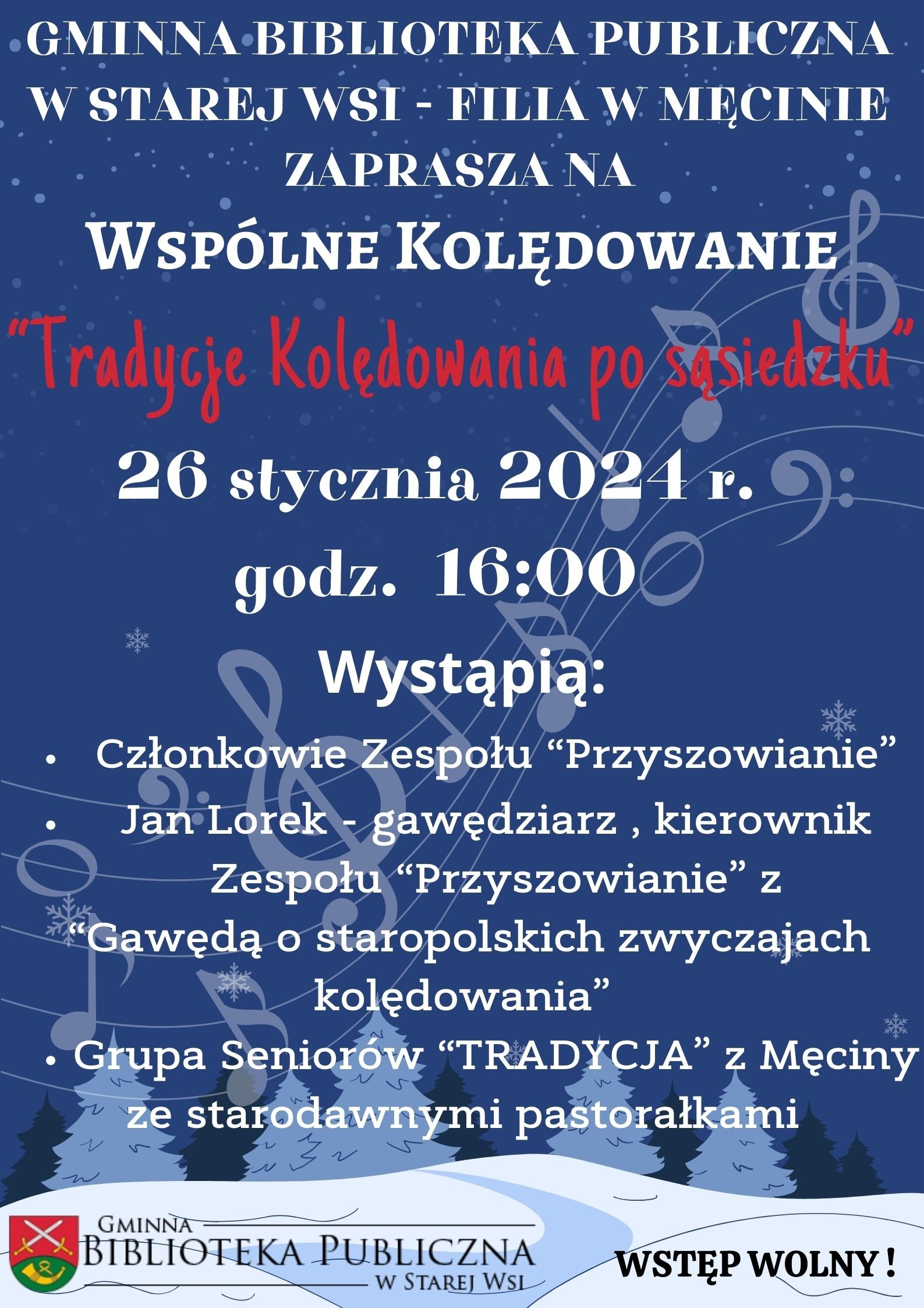 Gminna Biblioteka Publiczna w Starej Wsi - Filia w Męcinie serdecznie zaprasza w dniu 26 stycznia (piątek) 2024 r. o godz. 16°° do Biblioteki Publicznej w Męcinie na wspólne kolędowanie „Tradycje kolędowania po sąsiedzku".