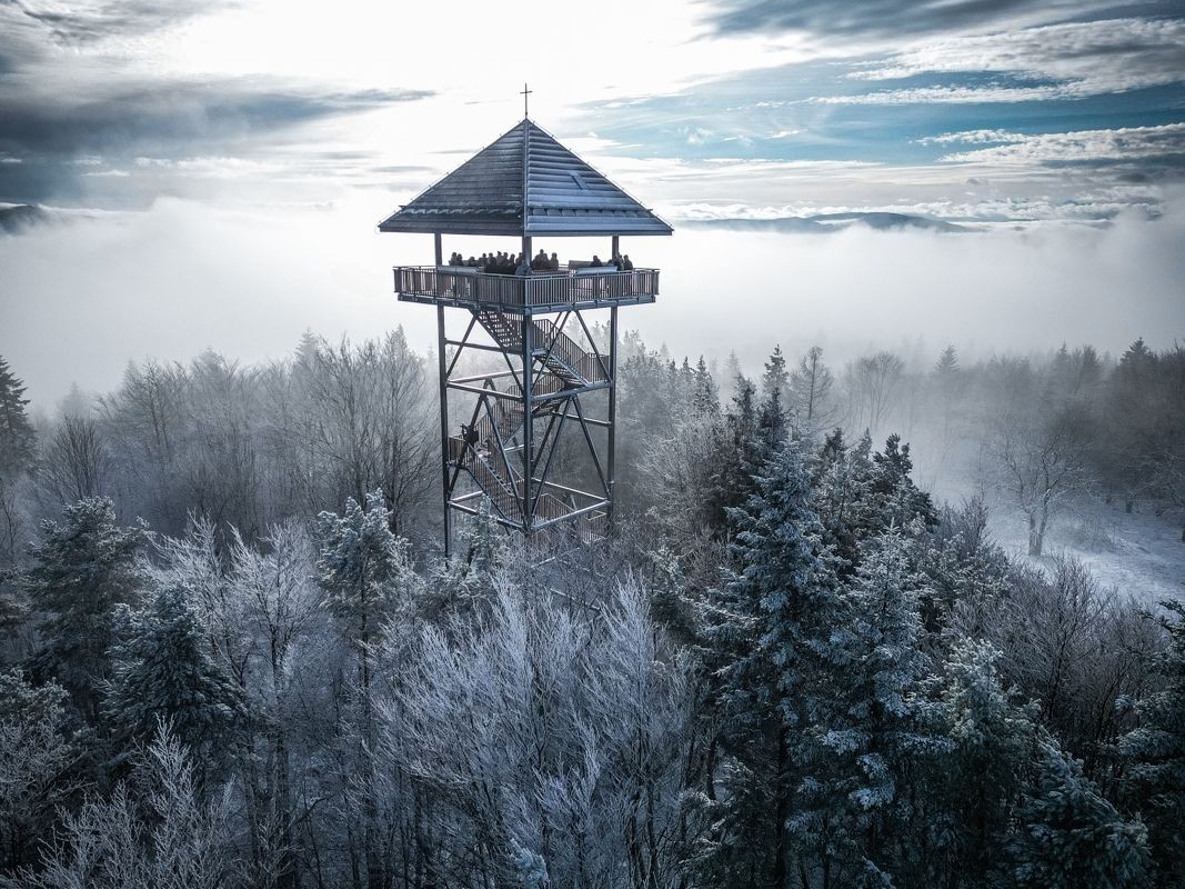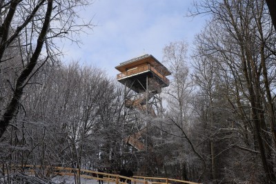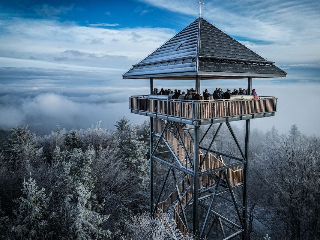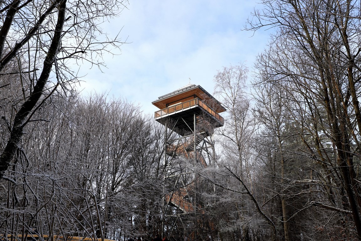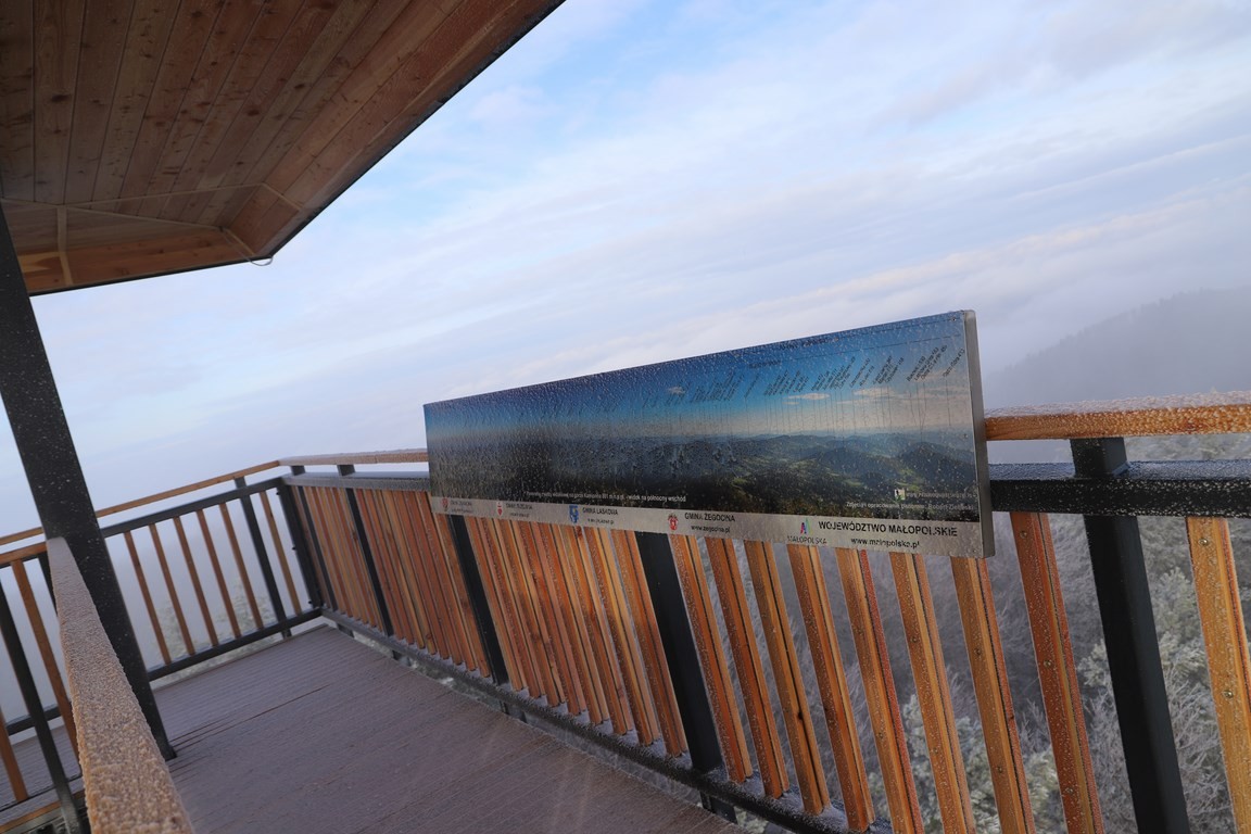 29-metrowa wieża zwieńczona zadaszonym tarasem o powierzchni 64 metrów kwadratowych umożliwia podziwianie krajobrazu, który dotąd przysłonięty był drzewami. Z tarasu rozpościera się pełna panorama, obejmująca Pogórze Wiśnickie, Pogórze Rożnowskie, Beskid Sądecki, Beskid Wyspowy, Gorce, Magurę Spiską, Tatry, Babią Górę z Pasmem Policy i Beskid Makowski, a nawet Kraków. Identyfikację poszczególnych punktów ułatwiają opisane i zamontowane na wieży tablice z panoramami widokowymi.