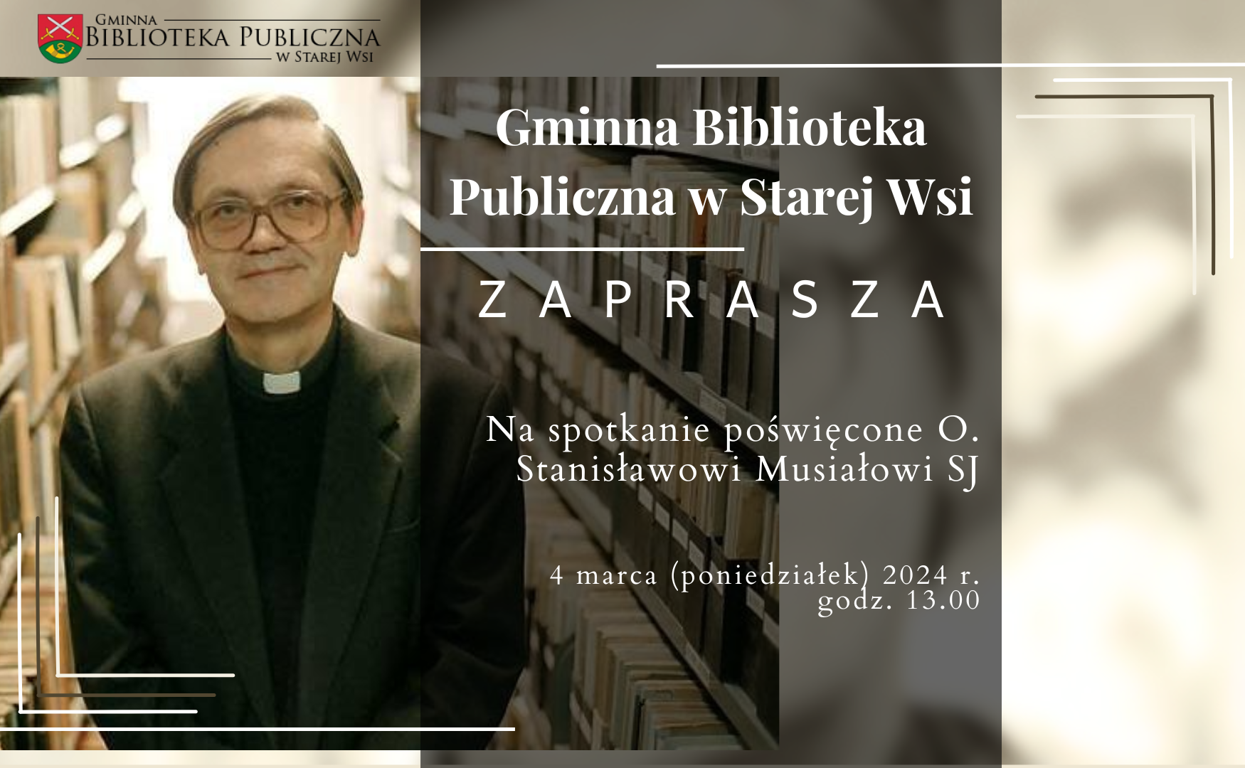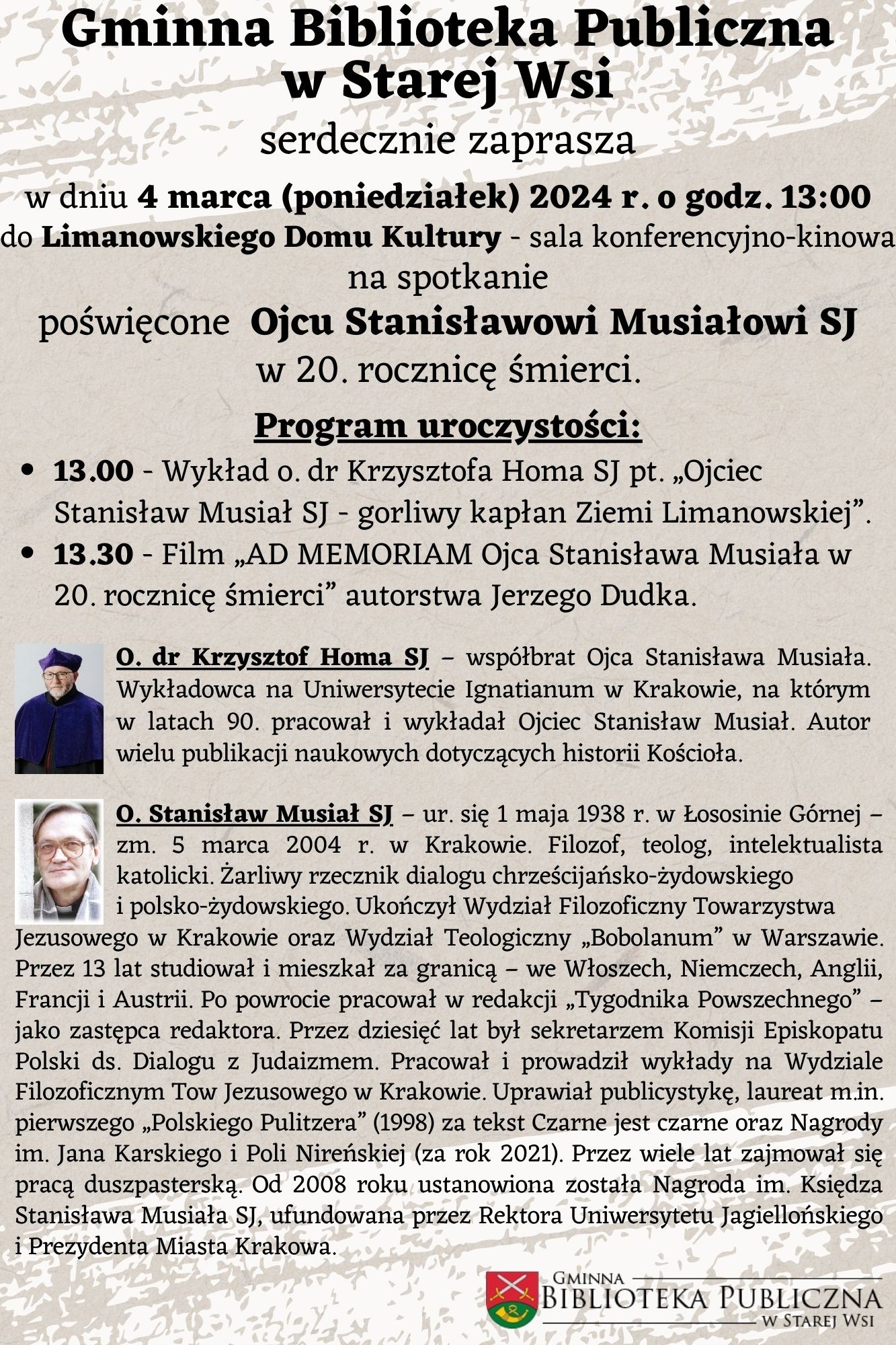 Gminna Biblioteka Publiczna w Starej Wsi serdecznie zaprasza w dniu 4 marca 2024 roku na godzinę 13.00 do Limanowskiego Domu Kultury - SALA KONFERENCYJNO-KINOWA na spotkanie poświęcone O. STANISŁAWOWI MUSIAŁOWI SJ w 20. rocznicę śmierci.