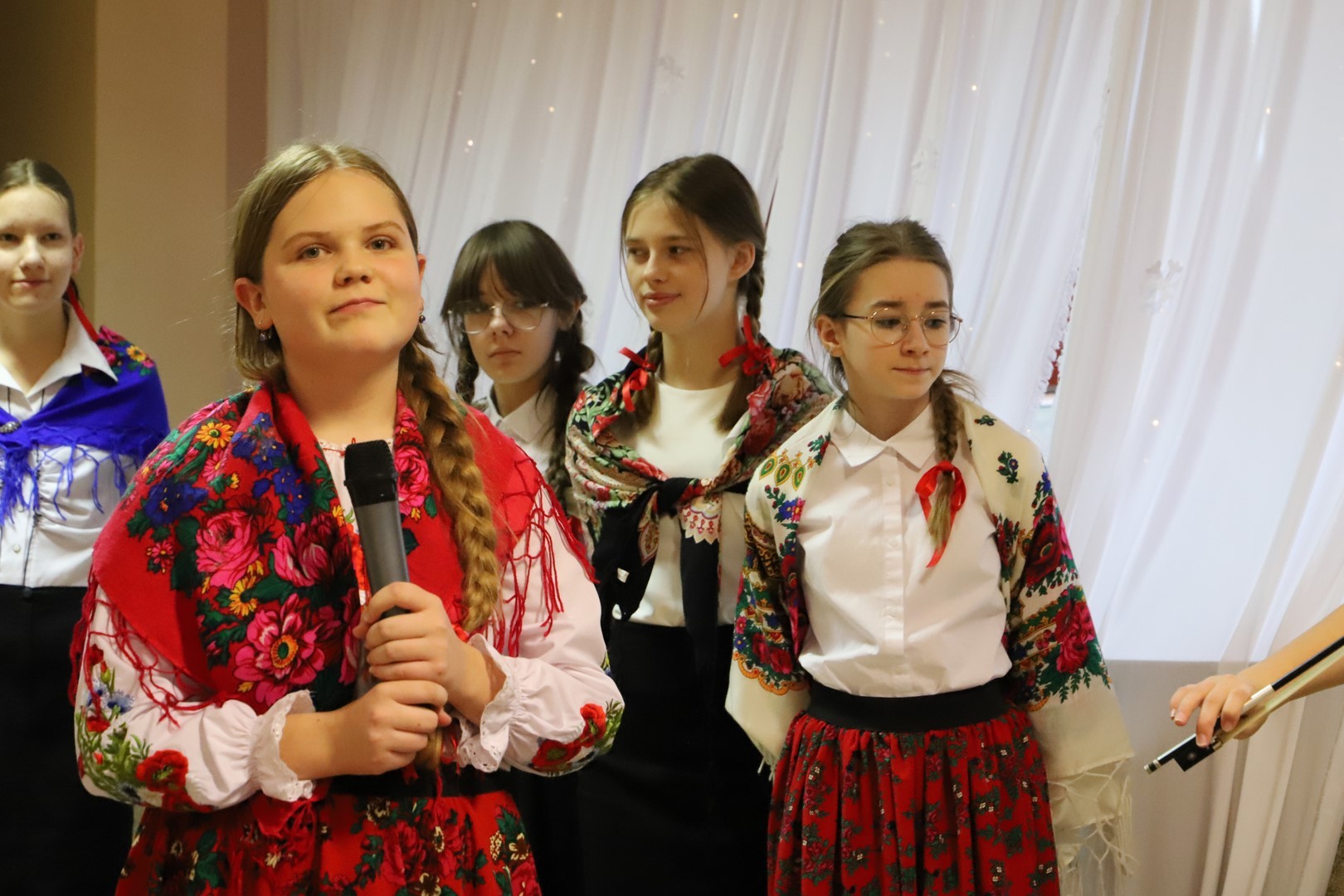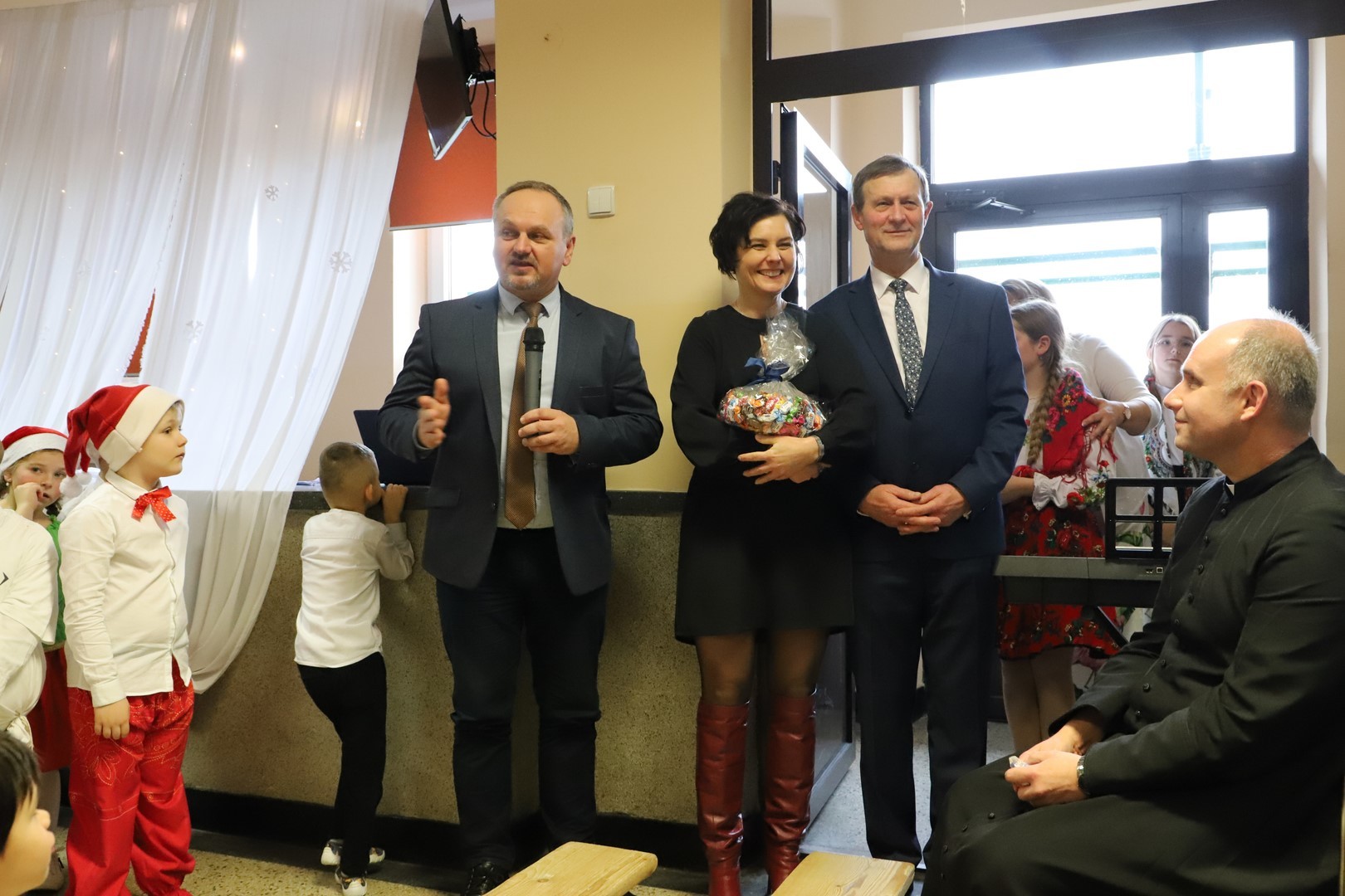 Po występie wiele miłych słów skierował do wszystkich zebranych Pan Wójt oraz Pan Dyrektor. Następnie rodzice zaprosili wszystkich gości na przygotowany przez nich poczęstunek, a babcie i dziadkowie otrzymali własnoręcznie przygotowane kwiaty i słodkie upominki. Na koniec uroczystości wszyscy goście wzięli udział we wspólnym kolędowaniu przy dźwiękach pięknych melodii w wykonaniu uczniów z klasy 5 i 7.