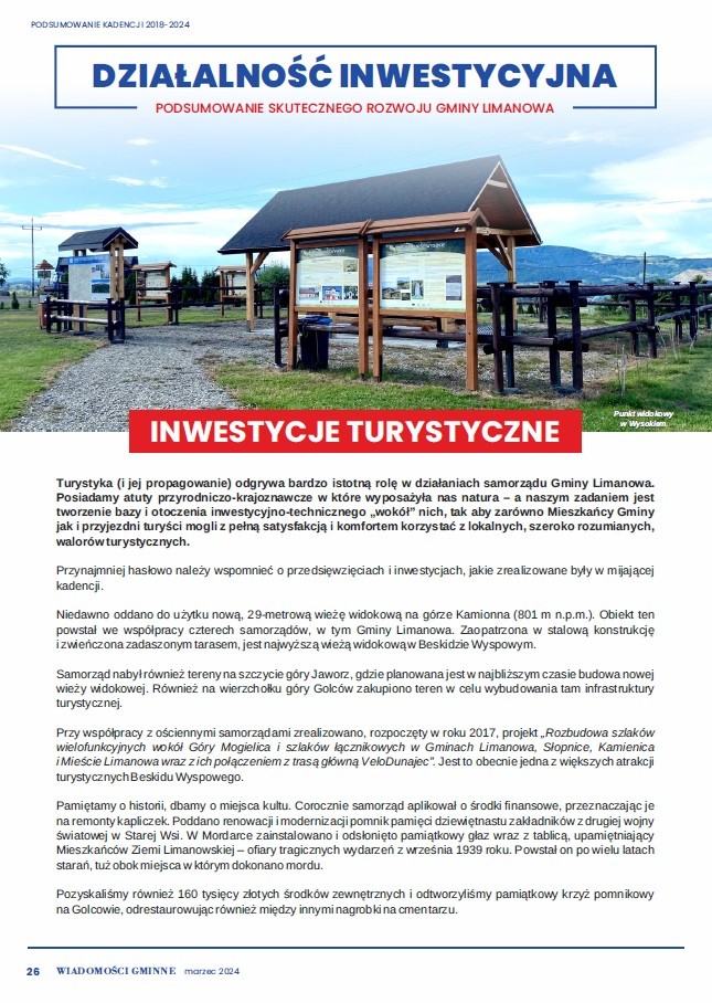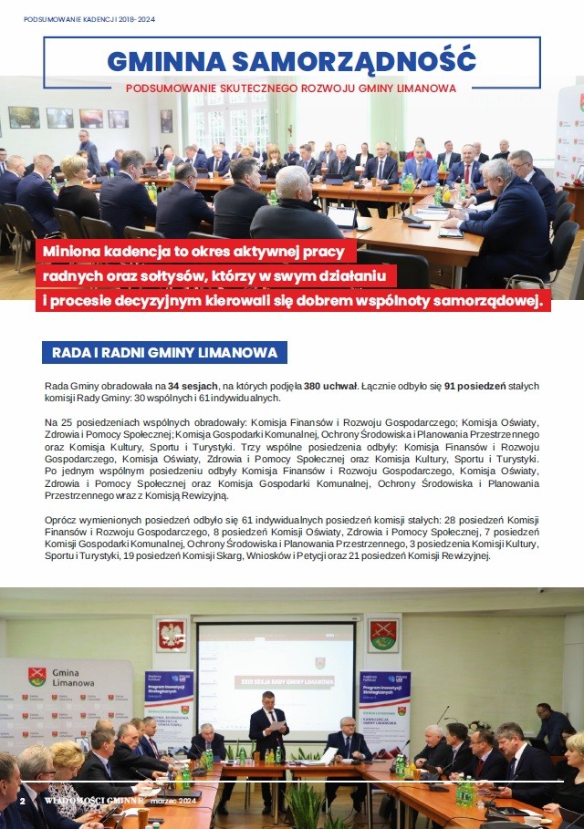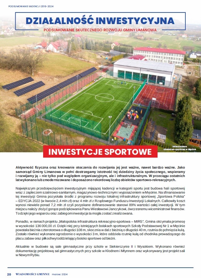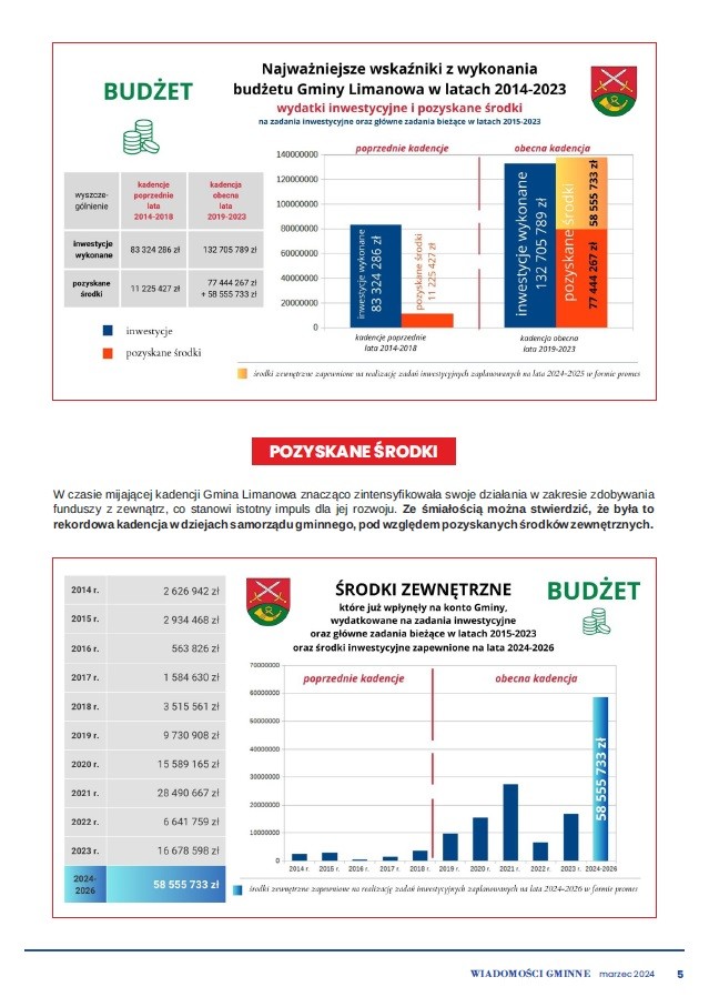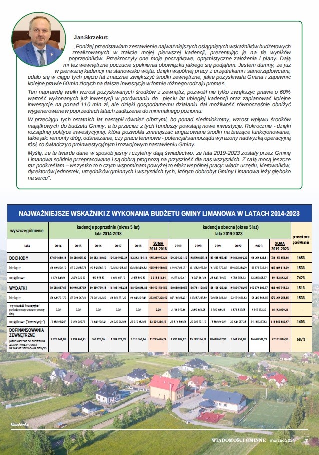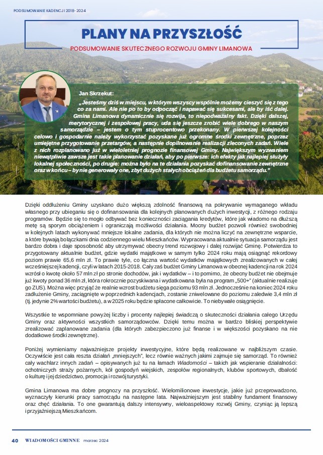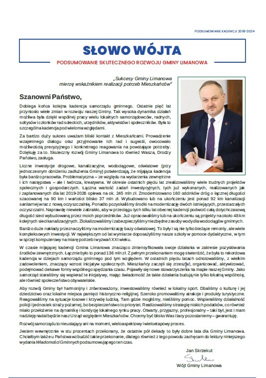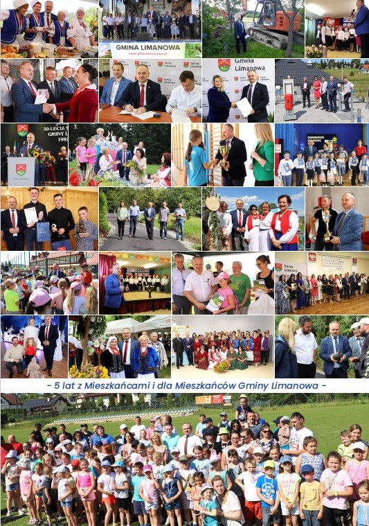 W czasie mijającej kadencji Gmina Limanowa znacząco zintensyfikowała swoje działania w zakresie pozyskiwania środków zewnętrznych. Łącznie było to ponad 136 mln zł. Z pełnym przekonaniem mogę stwierdzić, że była to rekordowa kadencja w dziejach samorządu gminnego pod tym względem. W ostatnich pięciu latach odnotowaliśmy, z wielkim zadowoleniem, znaczący wzrost inicjatyw społecznych. Mieszkańcy zaczęli się zrzeszać, organizować, aktywizować, podejmować ciekawe formy wspólnego spędzania czasu. Pojawiły się nowe stowarzyszenia na mapie naszej Gminy. Jako samorząd staraliśmy się wspierać te inicjatywy, mając świadomość że takie działania budują nie tylko lokalną wspólnotę, ale również społeczeństwo obywatelskie. Aby rozwój Gminy był harmonijny i zrównoważony, inwestowaliśmy również w lokalny sport. Dbaliśmy o kulturę i jej dziedzictwo oraz lokalne miejsca pamięci historyczno-religijnej. Szeroko promowaliśmy atrakcje i produkty turystyczne. Reagowaliśmy na sytuacje losowe i krzywdę ludzką. Tam gdzie mogliśmy, nieśliśmy pomoc.
