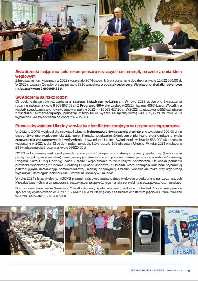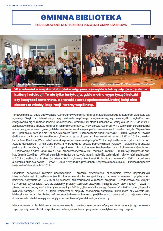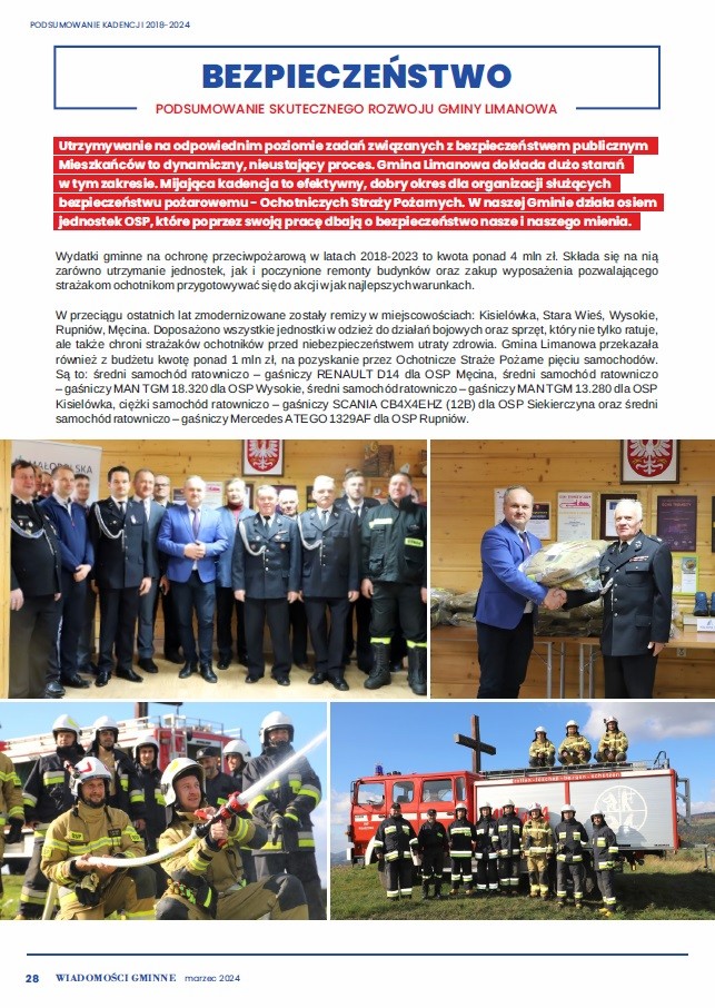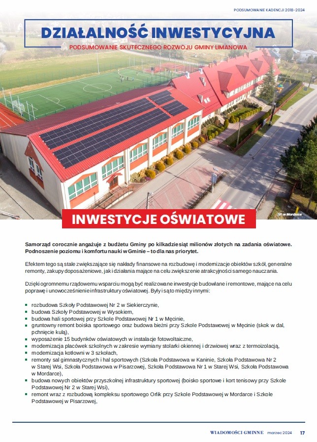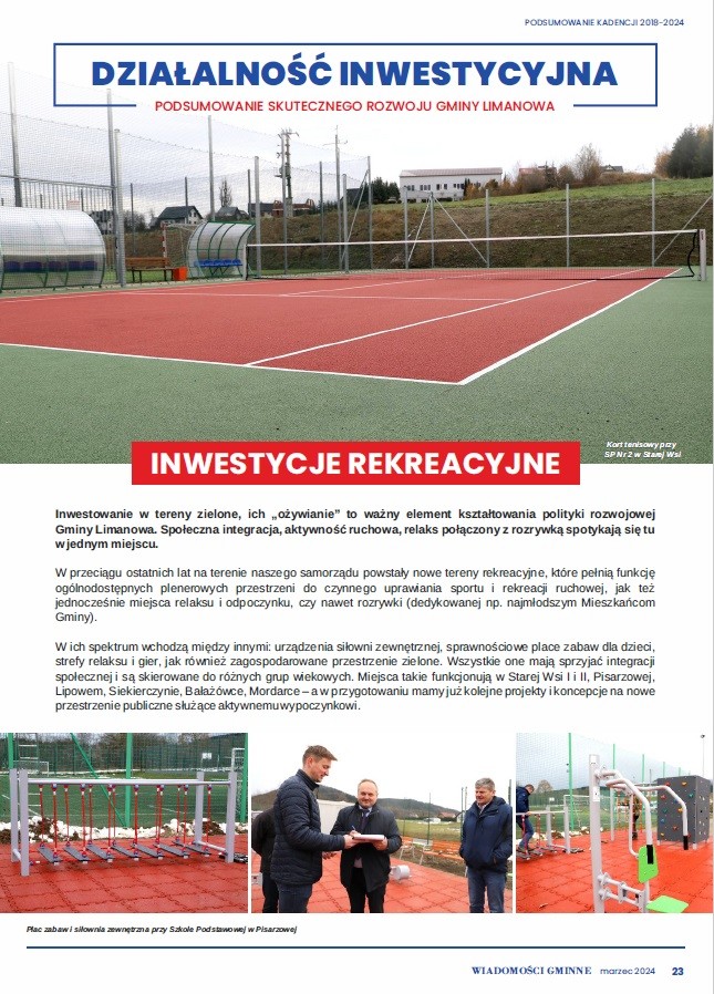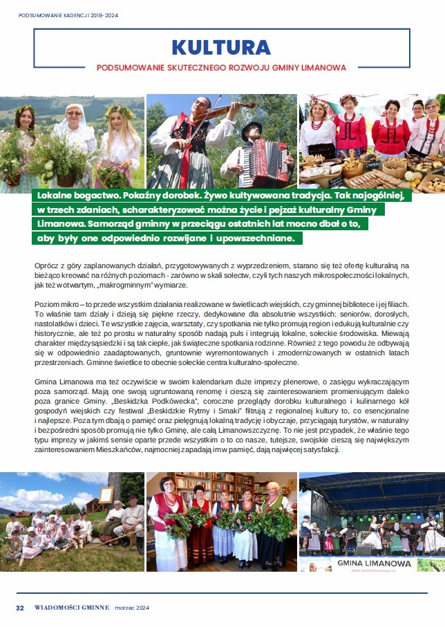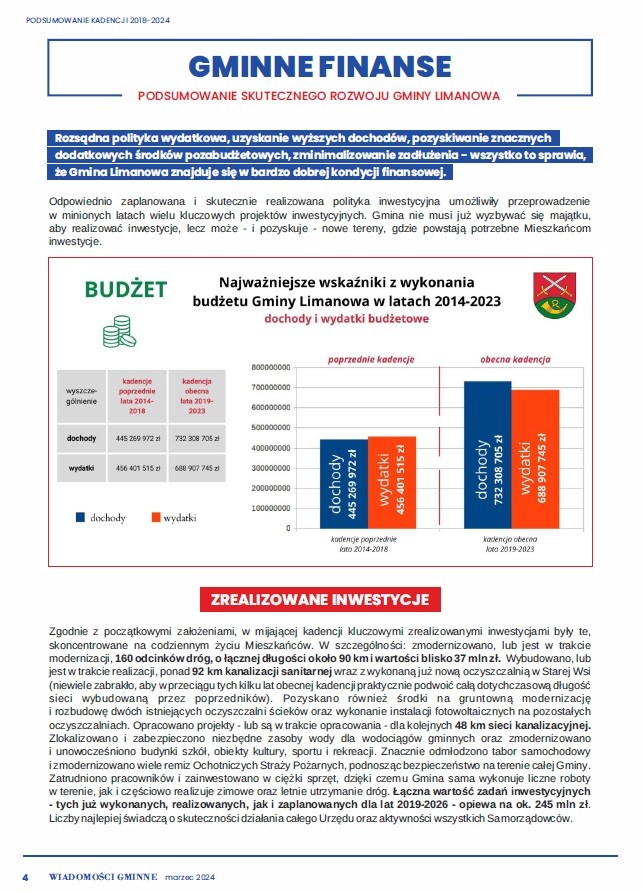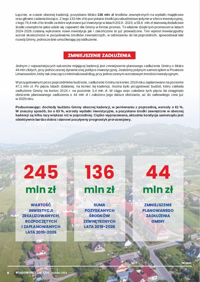 W czasie mijającej kadencji Gmina Limanowa znacząco zintensyfikowała swoje działania w zakresie pozyskiwania środków zewnętrznych. Łącznie było to ponad 136 mln zł. Z pełnym przekonaniem mogę stwierdzić, że była to rekordowa kadencja w dziejach samorządu gminnego pod tym względem. W ostatnich pięciu latach odnotowaliśmy, z wielkim zadowoleniem, znaczący wzrost inicjatyw społecznych. Mieszkańcy zaczęli się zrzeszać, organizować, aktywizować, podejmować ciekawe formy wspólnego spędzania czasu. Pojawiły się nowe stowarzyszenia na mapie naszej Gminy. Jako samorząd staraliśmy się wspierać te inicjatywy, mając świadomość że takie działania budują nie tylko lokalną wspólnotę, ale również społeczeństwo obywatelskie. Aby rozwój Gminy był harmonijny i zrównoważony, inwestowaliśmy również w lokalny sport. Dbaliśmy o kulturę i jej dziedzictwo oraz lokalne miejsca pamięci historyczno-religijnej. Szeroko promowaliśmy atrakcje i produkty turystyczne. Reagowaliśmy na sytuacje losowe i krzywdę ludzką. Tam gdzie mogliśmy, nieśliśmy pomoc.