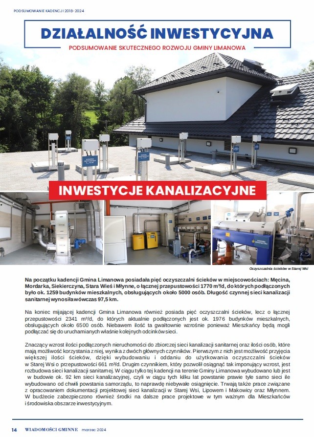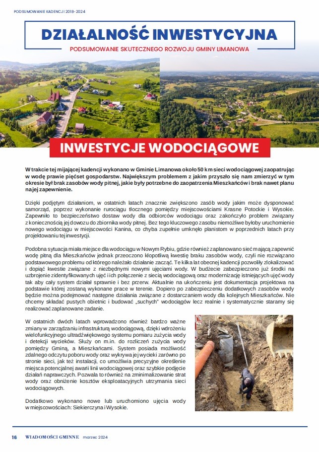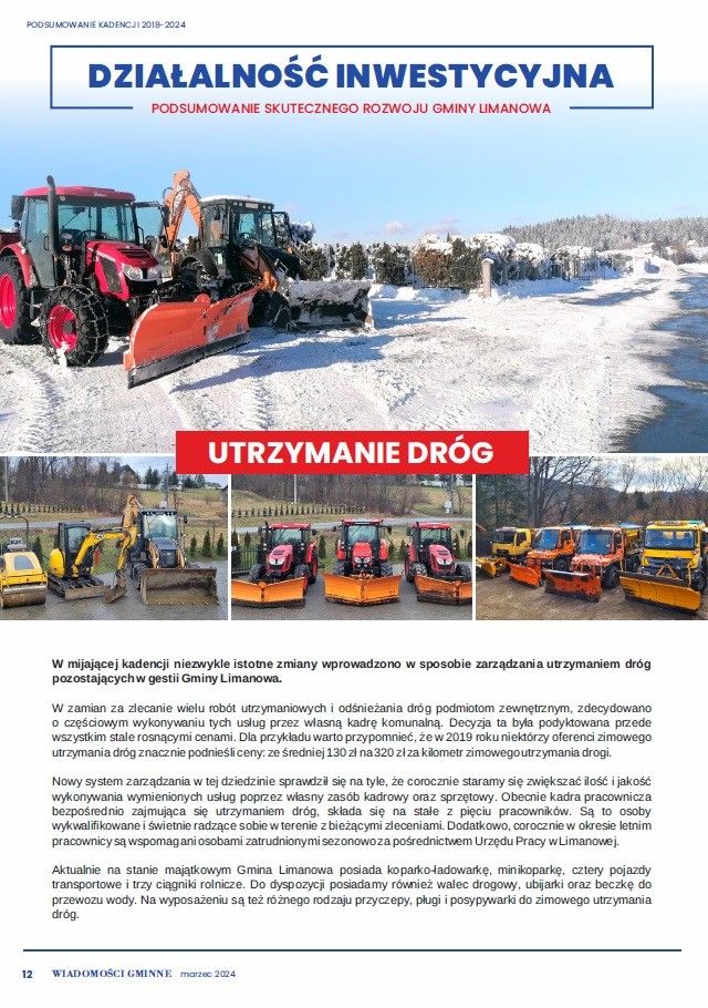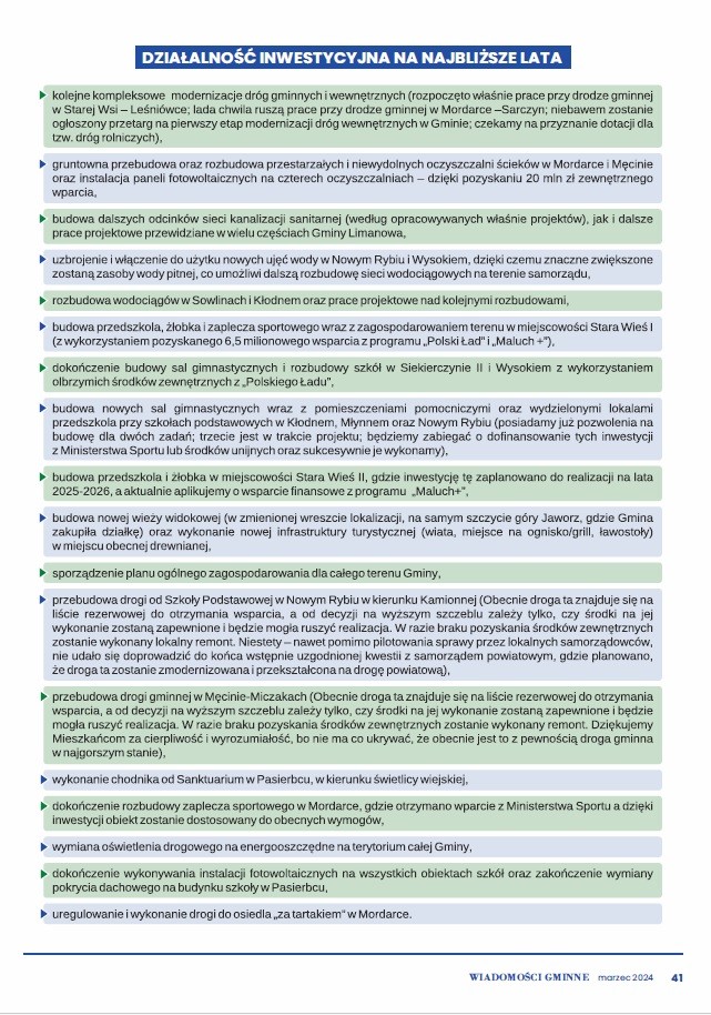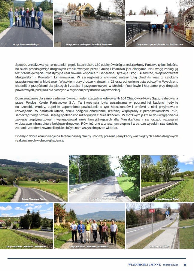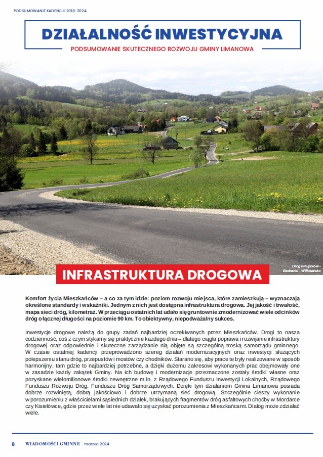 Za bardzo duży sukces uważam bliski kontakt z Mieszkańcami. Prowadzenie wzajemnego dialogu oraz przyjmowanie Ich rad i sugestii, owocowało możliwością precyzyjnego i konkretnego reagowania na powstające potrzeby. Dziękuję za to. Skuteczny rozwój Gminy Limanowa to również Wasza, Drodzy Państwo, zasługa. Liczne inwestycje drogowe, kanalizacyjne, wodociągowe, oświatowe (przy jednoczesnym obniżeniu zadłużenia Gminy) potwierdzają, że mijająca kadencja była bardzo pracowita. Problematyczna – ze względu na wydarzenia zewnętrzne i ich następstwa – ale i twórcza, kreatywna. W okresie ostatnich pięciu lat zrealizowaliśmy wiele trudnych projektów społecznych i gospodarczych. Łączna wartość zadań inwestycyjnych, tych już wykonanych, realizowanych jak i zaplanowanych dla lat 2019-2026 opiewa na ok. 245 mln zł. Zmodernizowano 160 odcinków dróg o łącznej długości szacowanej na 90 km i wartości blisko 37 mln zł.