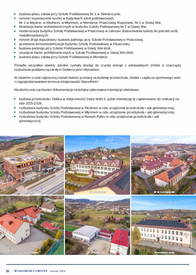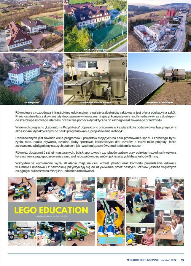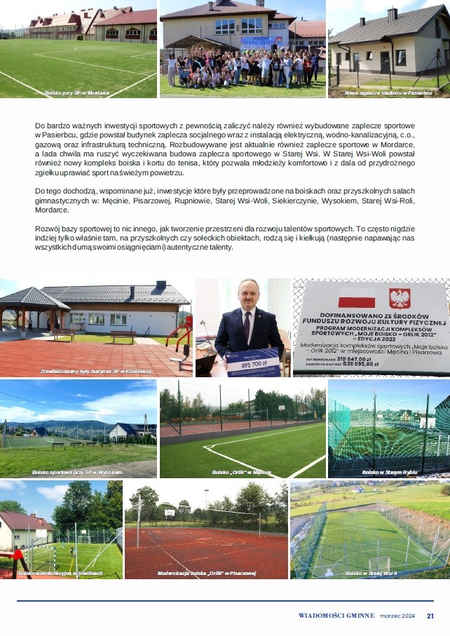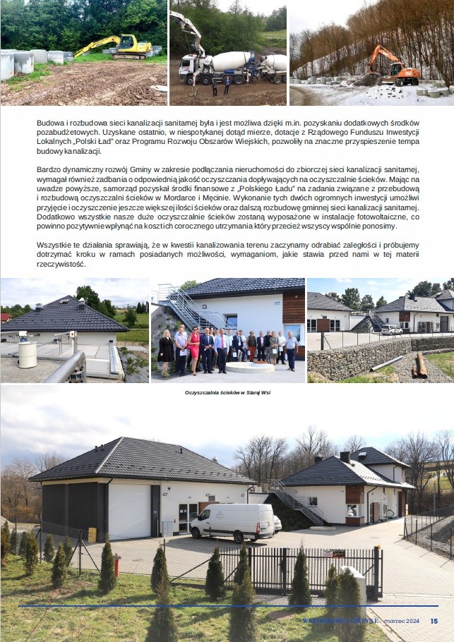 Wybudowano lub na ukończeniu jest ponad 92 km kanalizacji sanitarnej wraz z nową oczyszczalnią. Ponadto pozyskaliśmy środki na modernizację dwóch istniejących, przestarzałych oczyszczalni. Naprawdę niewiele zabrakło, aby w przeciągu tych kilku lat obecnej kadencji podwoić całą dotychczasową długość sieci wybudowaną przez moich poprzedników. Już opracowaliśmy lub na ukończeniu są projekty na około 48 km kolejnych sieci kanalizacyjnych. Zlokalizowaliśmy i zabezpieczyliśmy niezbędne zasoby wody dla wodociągów gminnych. Bardzo duże nakłady przeznaczyliśmy na modernizację bazy oświatowej. To były i są nie tylko bieżące remonty, ale wiele kompleksowych inwestycji. W największym od lat wymiarze doposażyliśmy nasze szkoły w pomoce dydaktyczne, w tym w sprzęt komputerowy na miarę potrzeb i wyzwań XXI wieku.