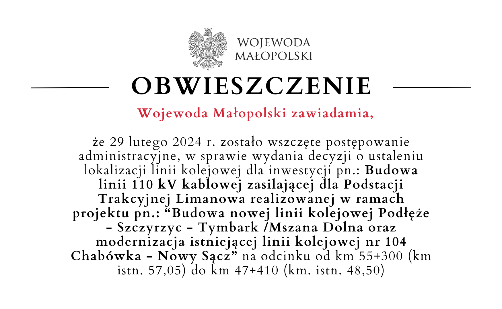 że 29 lutego 2024 r. zostało wszczęte postępowanie administracyjne, w sprawie wydania decyzji o ustaleniu lokalizacji linii kolejowej dla inwestycji pn.: Budowa linii 110 kV kablowej zasilającej dla Podstacji Trakcyjnej Limanowa realizowanej w ramach projektu pn.: “Budowa nowej linii kolejowej Podłęże - Szczyrzyc - Tymbark /Mszana Dolna oraz modernizacja istniejącej linii kolejowej nr 104 Chabówka - Nowy Sącz” na odcinku od km 55+300 (km istn. 57,05) do km 47+410 (km. istn. 48,50).