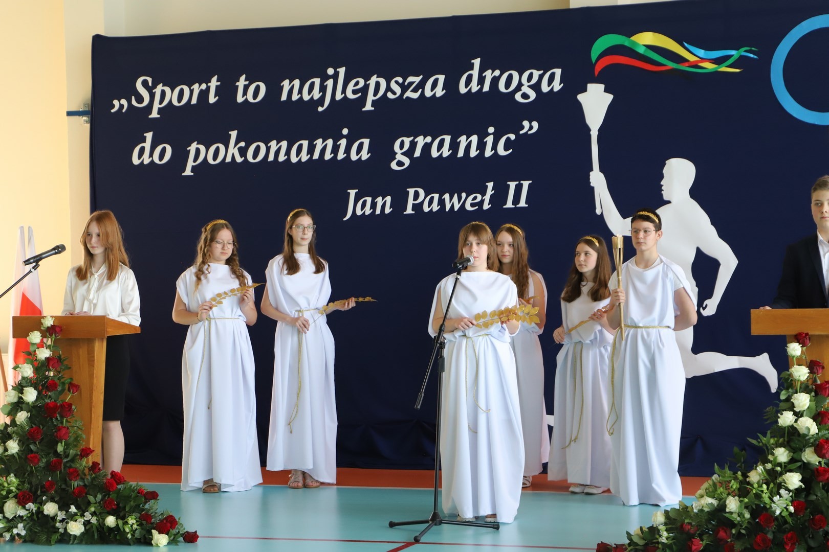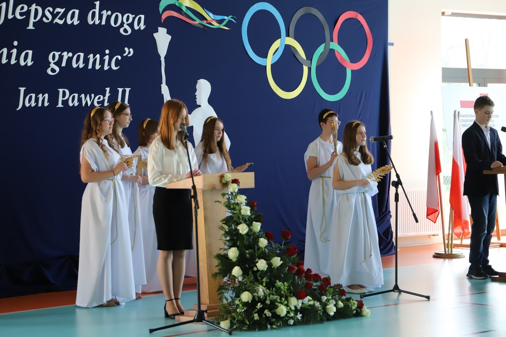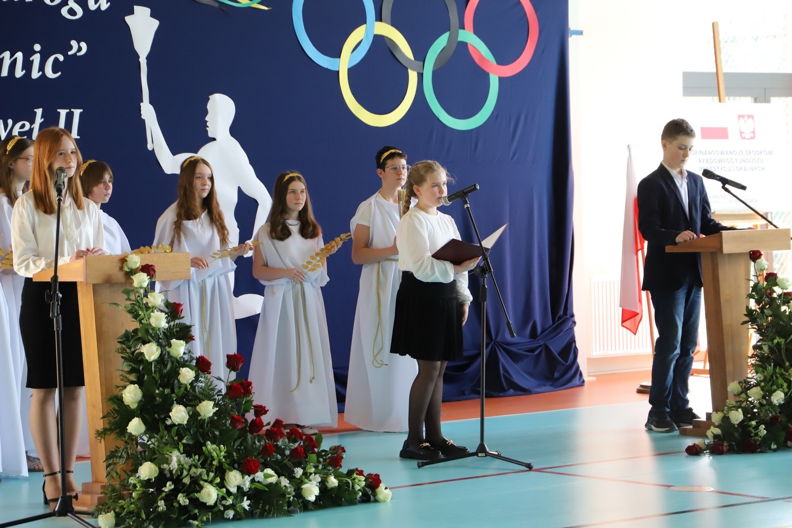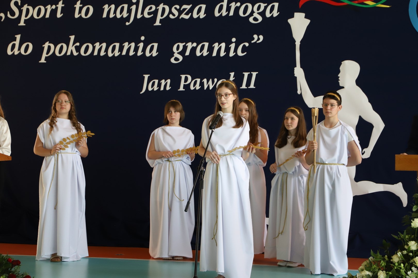 Uroczystość uświetnili również uczniowie, którzy swoim występem artystycznym nawiązali do idei olimpijskiej. Jako pierwsi pojawili się greccy bogowie, wzywając sportowców z całego globu do rywalizacji w zawodach, dodając im jednocześnie odwagi, męstwa oraz siły. Następnie na scenę wkroczyli przedstawiciele pięciu dyscyplin sportowych: hokeja, koszykówki, siatkówki, piłki nożnej oraz karate - uczniowie, którzy mogą poszczycić się licznymi sukcesami w zawodach sportowych na różnych szczeblach, reprezentując nie tylko szkołę, ale także kluby sportowe, w których są zrzeszeni. Jeden z nich, w imieniu wszystkich sportowców, złożył uroczystą obietnicę, że wszyscy zawodnicy będą godnie reprezentować swe drużyny podczas rywalizacji z poszanowaniem zasad fair play. Następnie krótko przedstawiono historię i symbolikę igrzysk, a dziewczęta zaprezentowały taniec z flagami w barwach olimpijskich. Podczas występu nie mogło zabraknąć również poezji. Jedna z uczennic wyrecytowała wiersz Kazimierza Wierzyńskiego, autora cyklu „Laur olimpijski”. Zaś finałowym punktem programu był taniec z elementami akrobatyki, nawiązujący do idei olimpijskiej poprzez swoją wymowę i symbolikę.