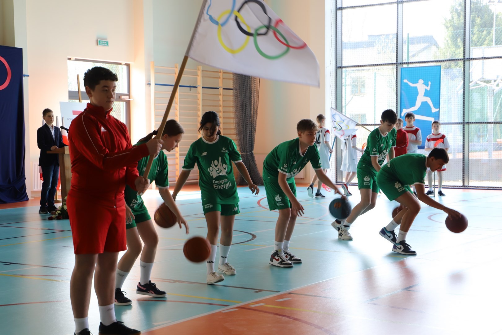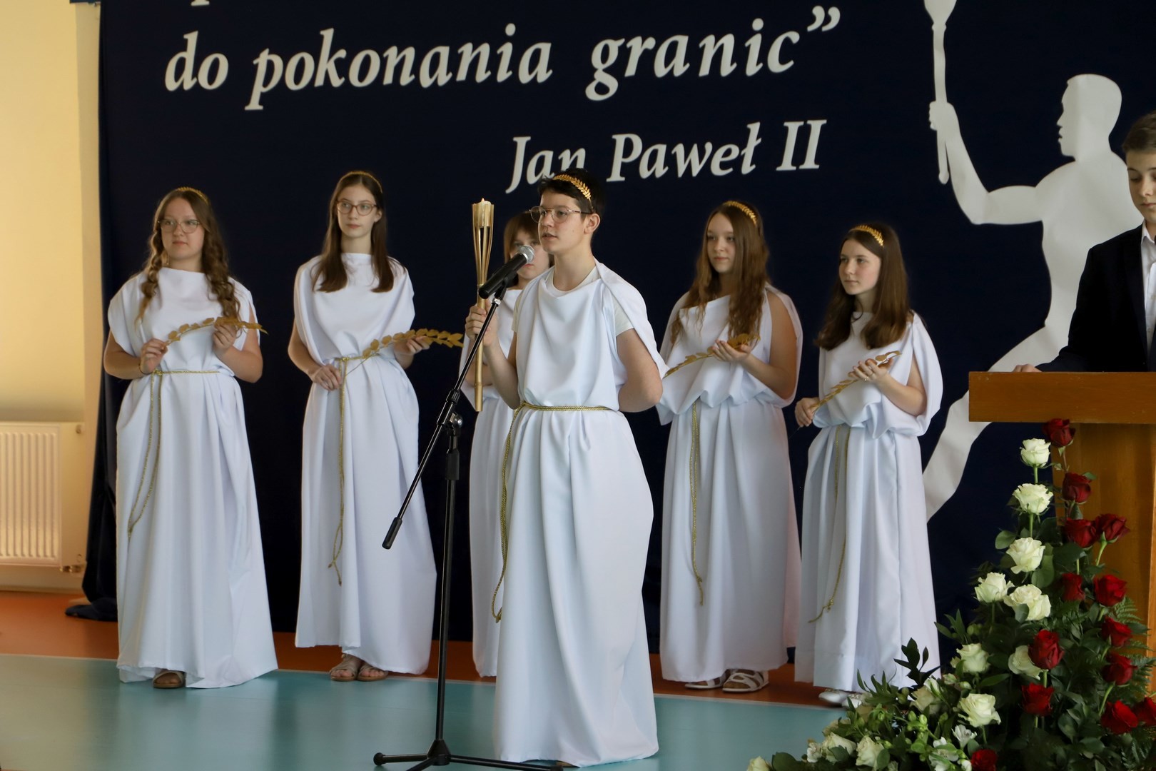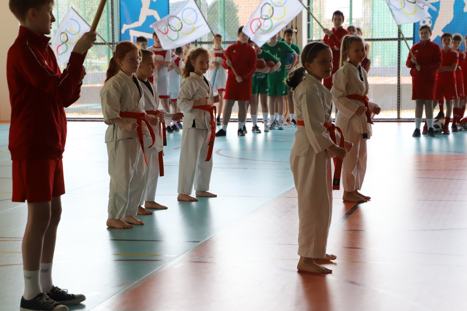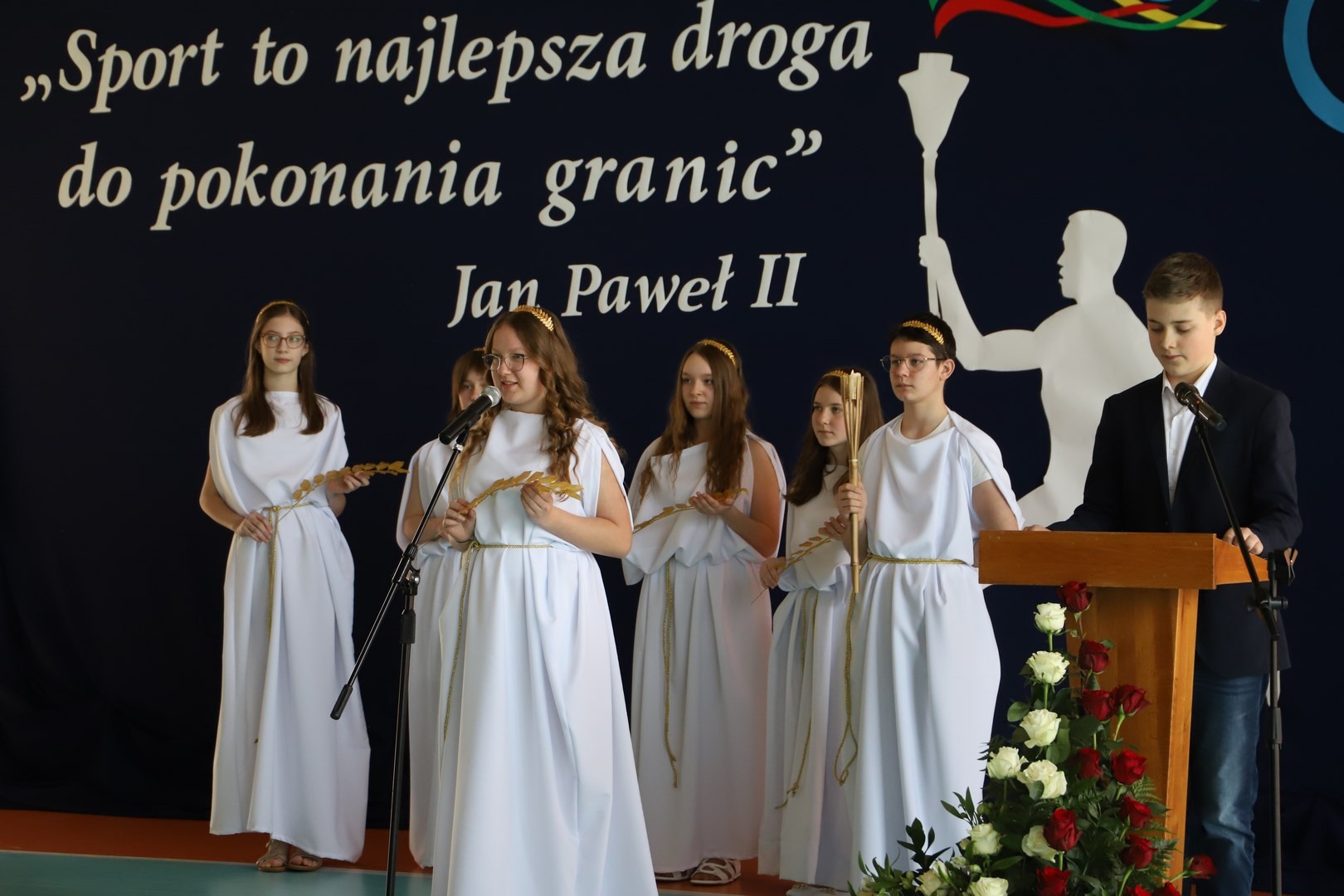 Uroczystość uświetnili również uczniowie, którzy swoim występem artystycznym nawiązali do idei olimpijskiej. Jako pierwsi pojawili się greccy bogowie, wzywając sportowców z całego globu do rywalizacji w zawodach, dodając im jednocześnie odwagi, męstwa oraz siły. Następnie na scenę wkroczyli przedstawiciele pięciu dyscyplin sportowych: hokeja, koszykówki, siatkówki, piłki nożnej oraz karate - uczniowie, którzy mogą poszczycić się licznymi sukcesami w zawodach sportowych na różnych szczeblach, reprezentując nie tylko szkołę, ale także kluby sportowe, w których są zrzeszeni. Jeden z nich, w imieniu wszystkich sportowców, złożył uroczystą obietnicę, że wszyscy zawodnicy będą godnie reprezentować swe drużyny podczas rywalizacji z poszanowaniem zasad fair play. Następnie krótko przedstawiono historię i symbolikę igrzysk, a dziewczęta zaprezentowały taniec z flagami w barwach olimpijskich. Podczas występu nie mogło zabraknąć również poezji. Jedna z uczennic wyrecytowała wiersz Kazimierza Wierzyńskiego, autora cyklu „Laur olimpijski”. Zaś finałowym punktem programu był taniec z elementami akrobatyki, nawiązujący do idei olimpijskiej poprzez swoją wymowę i symbolikę.