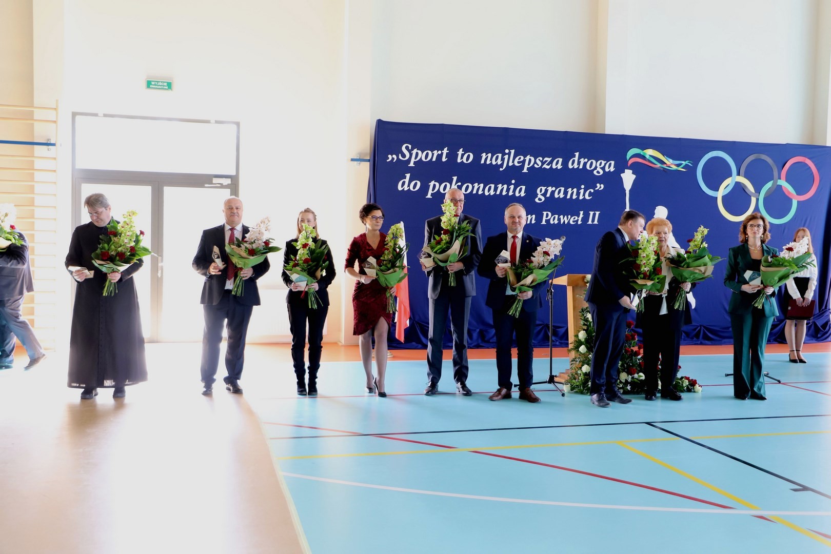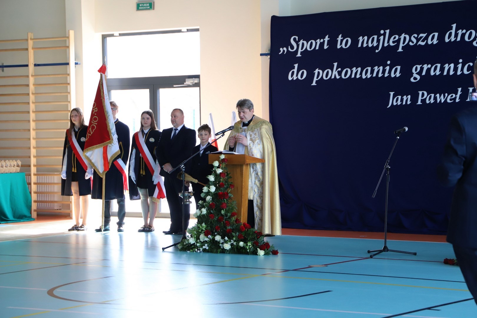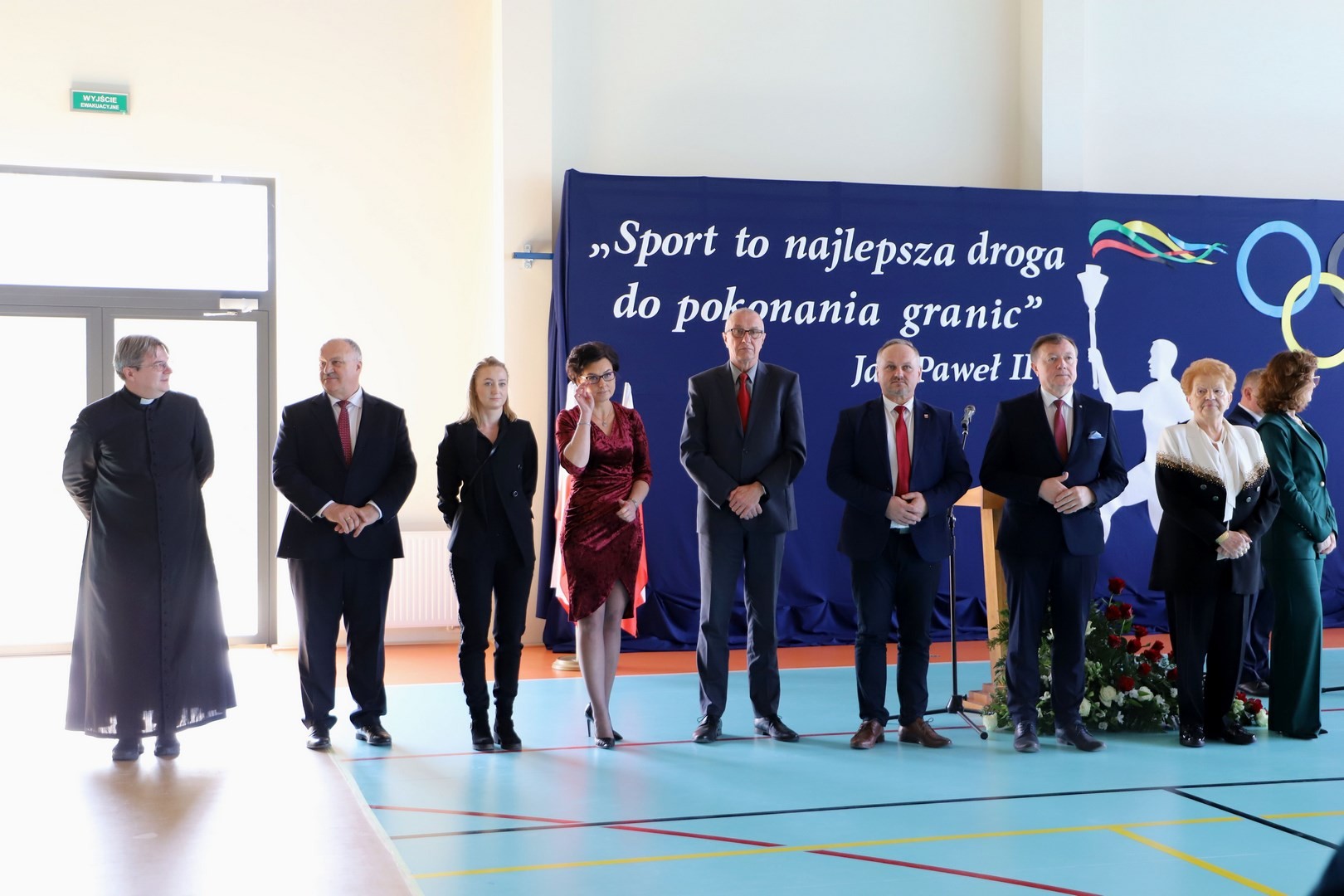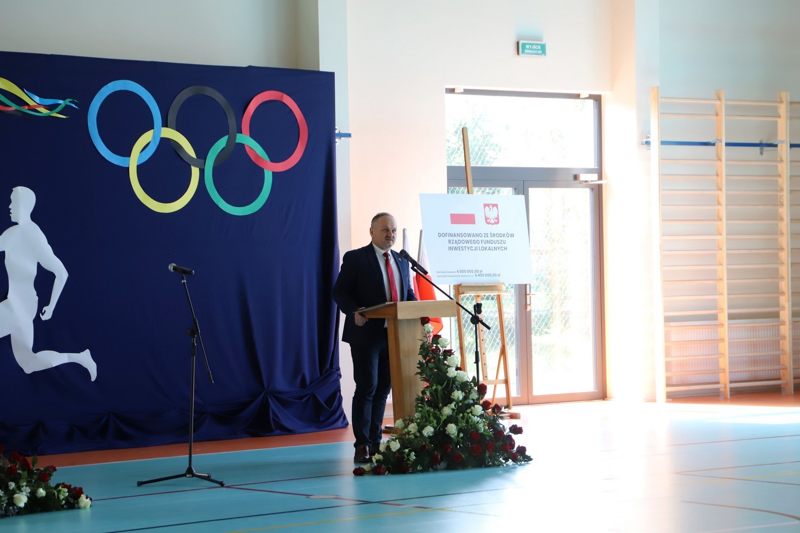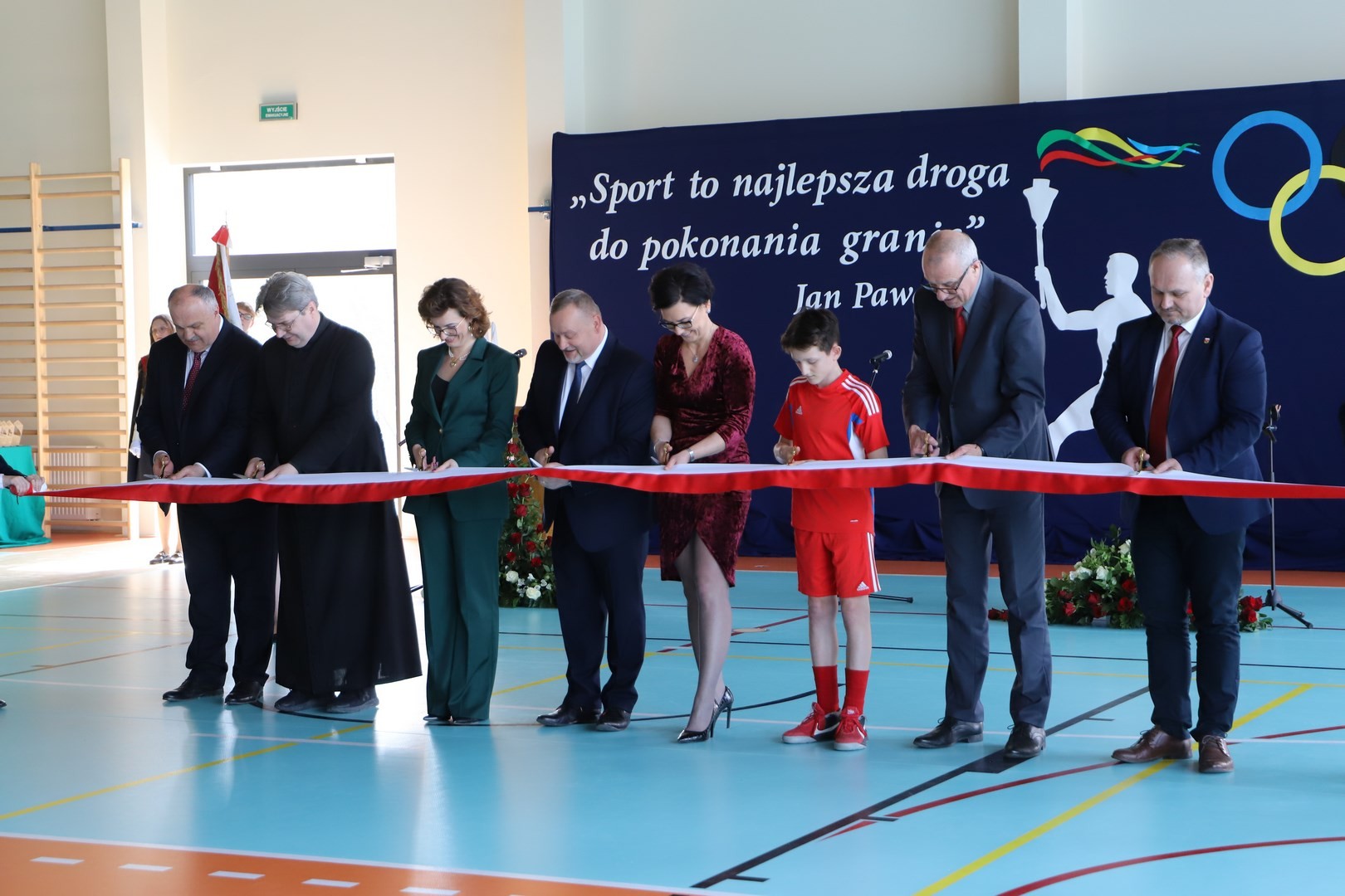 Następnie miało miejsce wprowadzenie pocztu sztandarowego i odśpiewanie hymnu państwowego przy akompaniamencie orkiestry. Stanowiło to preludium do kolejnego punktu uroczystości, jakim było symboliczne przecięcie wstęgi na znak oficjalnego oddania nowo wybudowanego obiektu do użytku publicznego. Ceremonia ta dopełniona została poprzez akt poświęcenia, którego dokonał ks. proboszcz Witold Machalski. W dalszej części programu imprezy głos zabrał Dyrektor Grzegorz Krzak, prezentując pokrótce historię zamysłu, planowania oraz powstawania inwestycji. Wyraził również nadzieję, że być może na tym obiekcie swoje pierwsze kroki będą stawiać przyszłe gwiazdy sportu, aby później odnosić sukcesy na arenie krajowej i międzynarodowej.