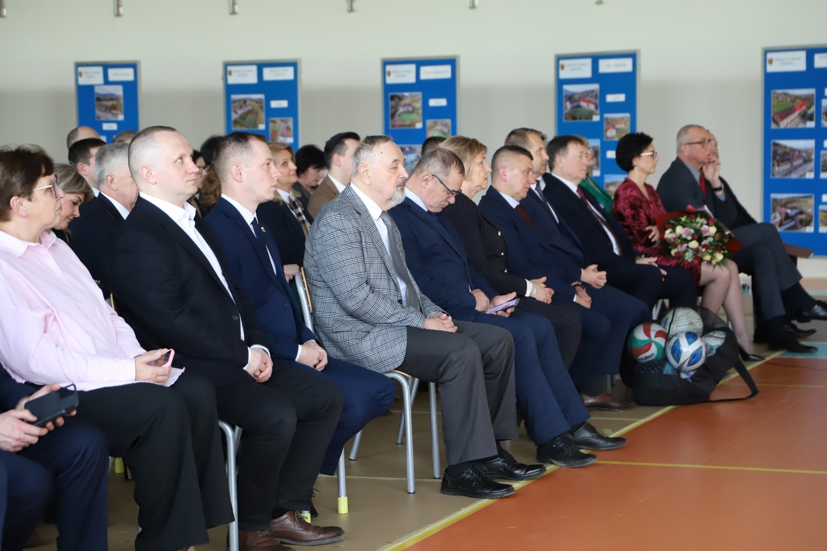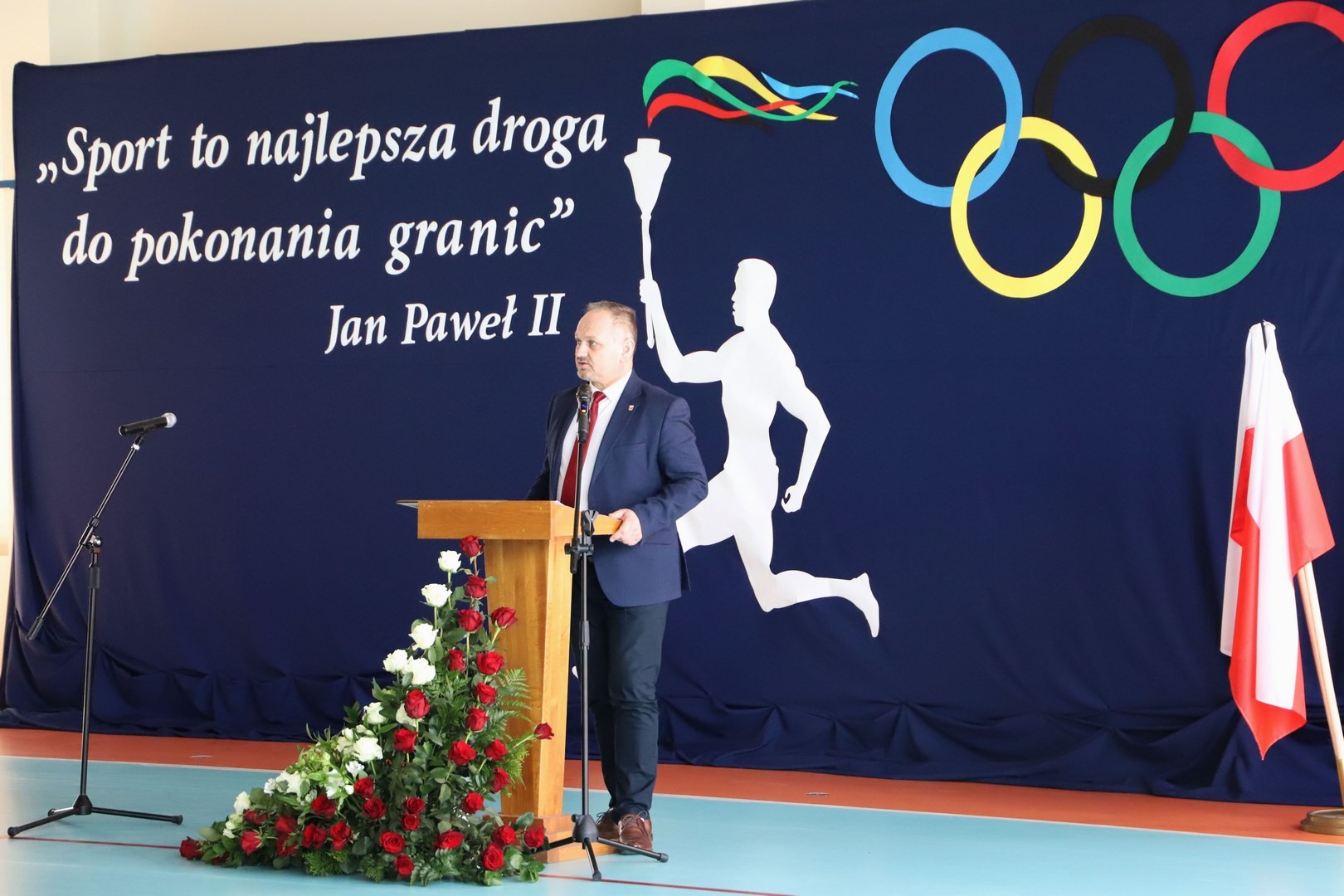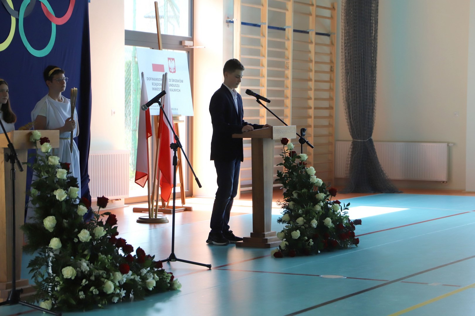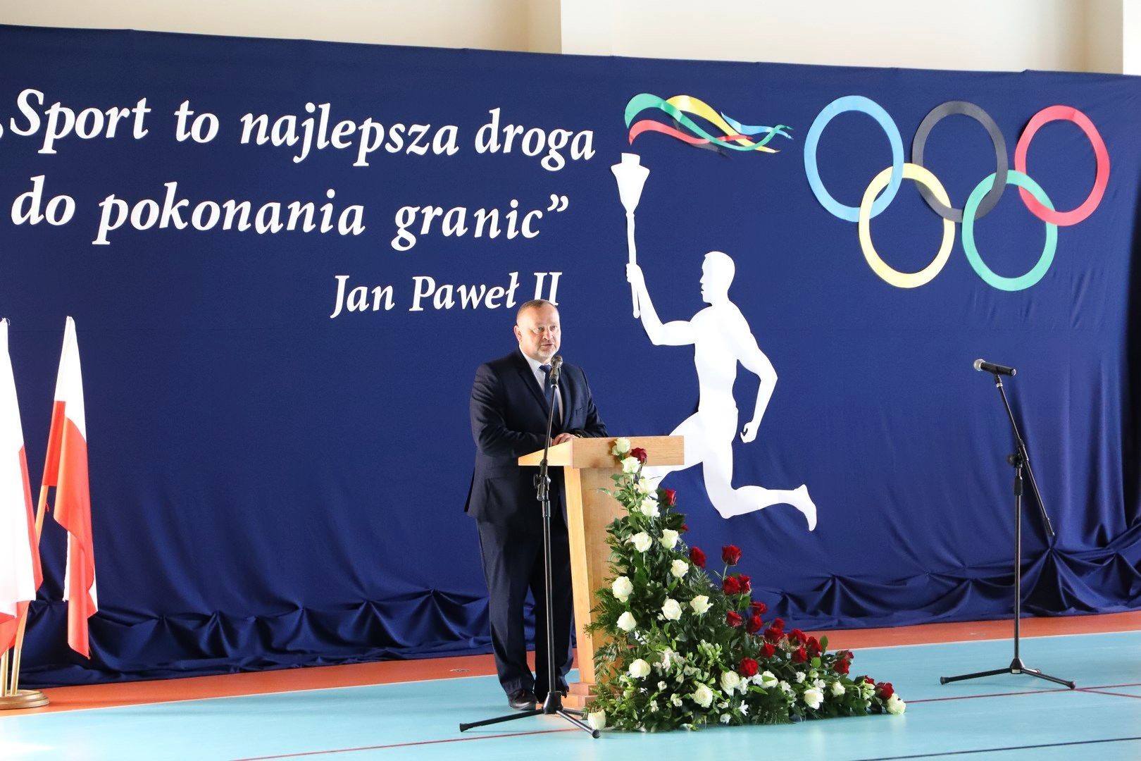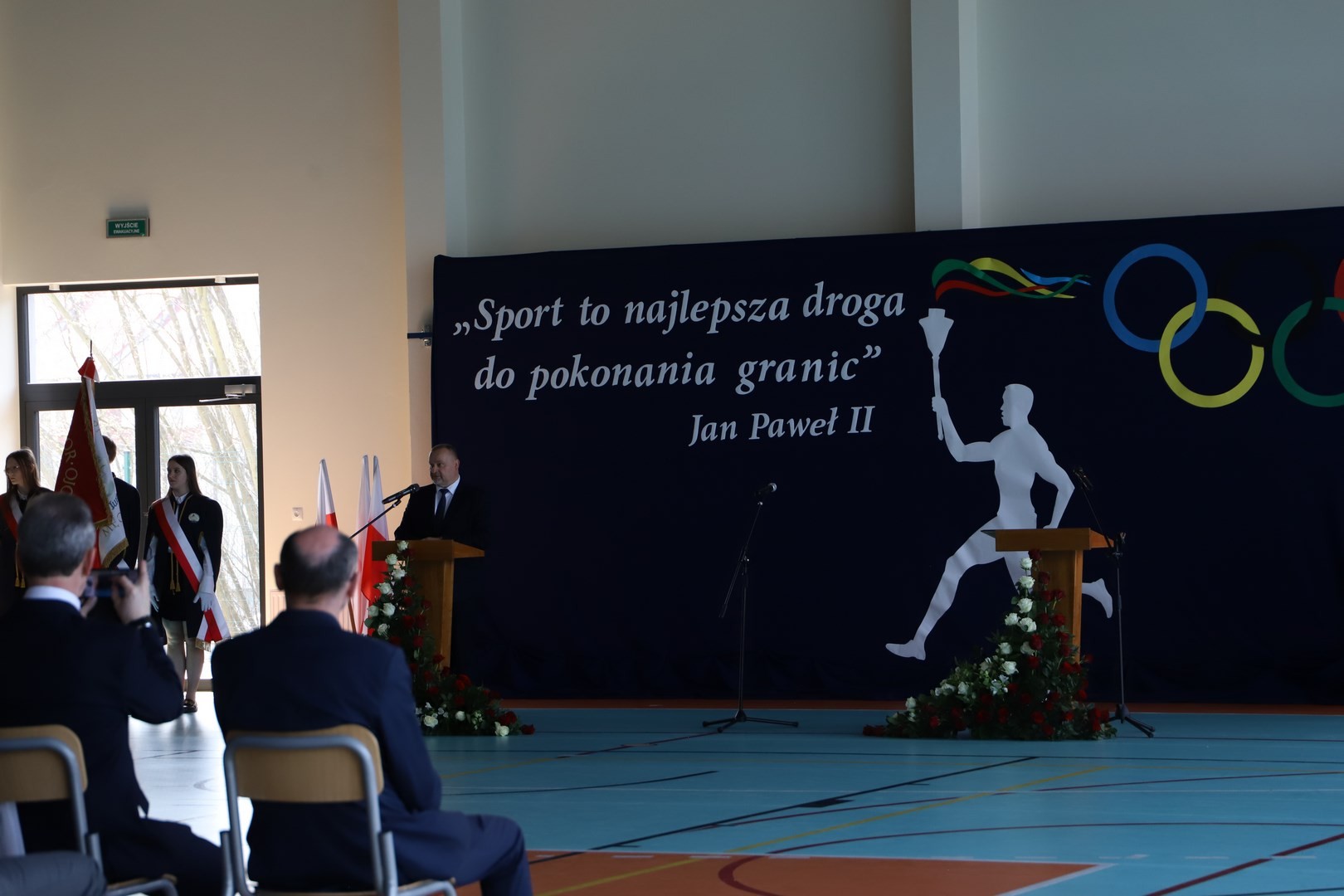 Następnie miało miejsce wprowadzenie pocztu sztandarowego i odśpiewanie hymnu państwowego przy akompaniamencie orkiestry. Stanowiło to preludium do kolejnego punktu uroczystości, jakim było symboliczne przecięcie wstęgi na znak oficjalnego oddania nowo wybudowanego obiektu do użytku publicznego. Ceremonia ta dopełniona została poprzez akt poświęcenia, którego dokonał ks. proboszcz Witold Machalski. W dalszej części programu imprezy głos zabrał Dyrektor Grzegorz Krzak, prezentując pokrótce historię zamysłu, planowania oraz powstawania inwestycji. Wyraził również nadzieję, że być może na tym obiekcie swoje pierwsze kroki będą stawiać przyszłe gwiazdy sportu, aby później odnosić sukcesy na arenie krajowej i międzynarodowej.