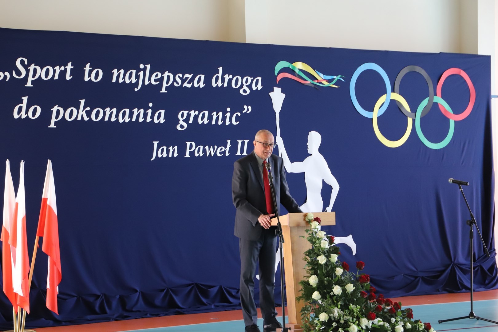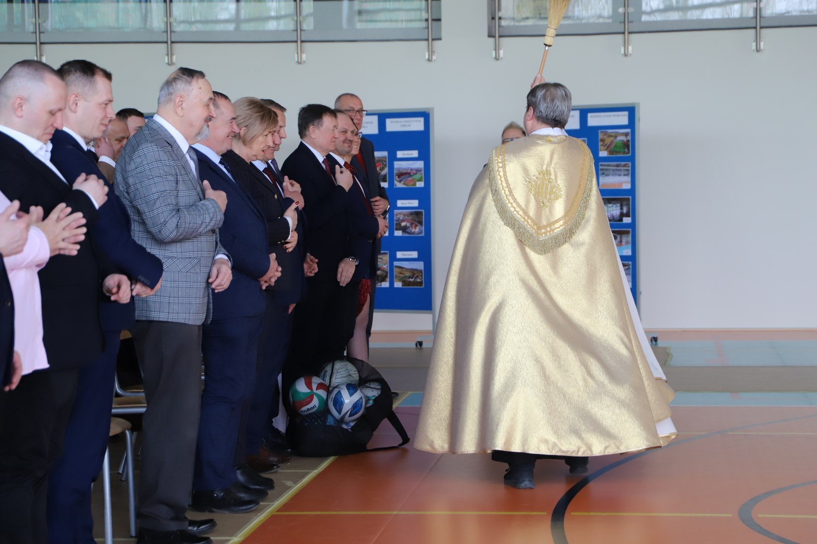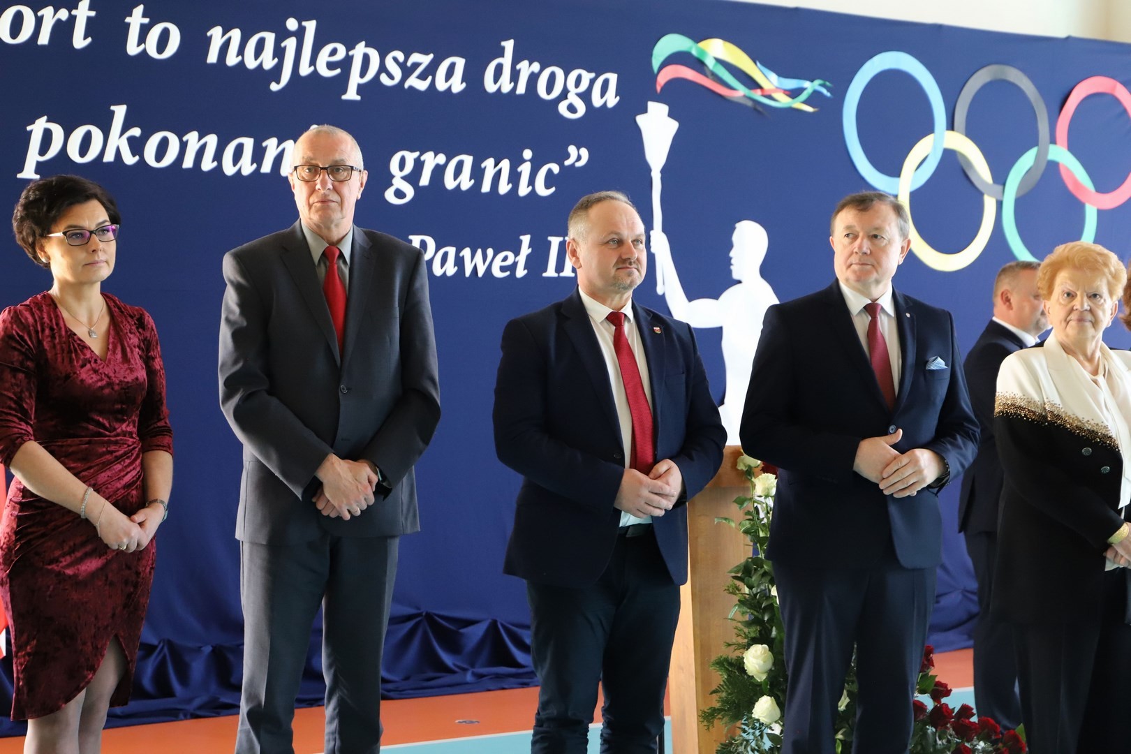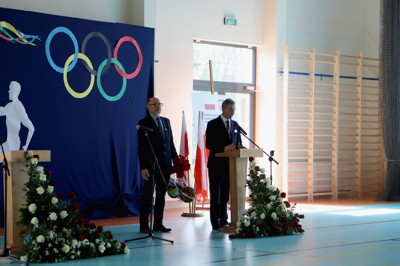 Następnie miało miejsce wprowadzenie pocztu sztandarowego i odśpiewanie hymnu państwowego przy akompaniamencie orkiestry. Stanowiło to preludium do kolejnego punktu uroczystości, jakim było symboliczne przecięcie wstęgi na znak oficjalnego oddania nowo wybudowanego obiektu do użytku publicznego. Ceremonia ta dopełniona została poprzez akt poświęcenia, którego dokonał ks. proboszcz Witold Machalski. W dalszej części programu imprezy głos zabrał Dyrektor Grzegorz Krzak, prezentując pokrótce historię zamysłu, planowania oraz powstawania inwestycji. Wyraził również nadzieję, że być może na tym obiekcie swoje pierwsze kroki będą stawiać przyszłe gwiazdy sportu, aby później odnosić sukcesy na arenie krajowej i międzynarodowej.