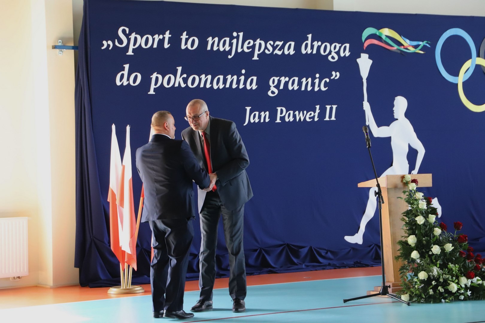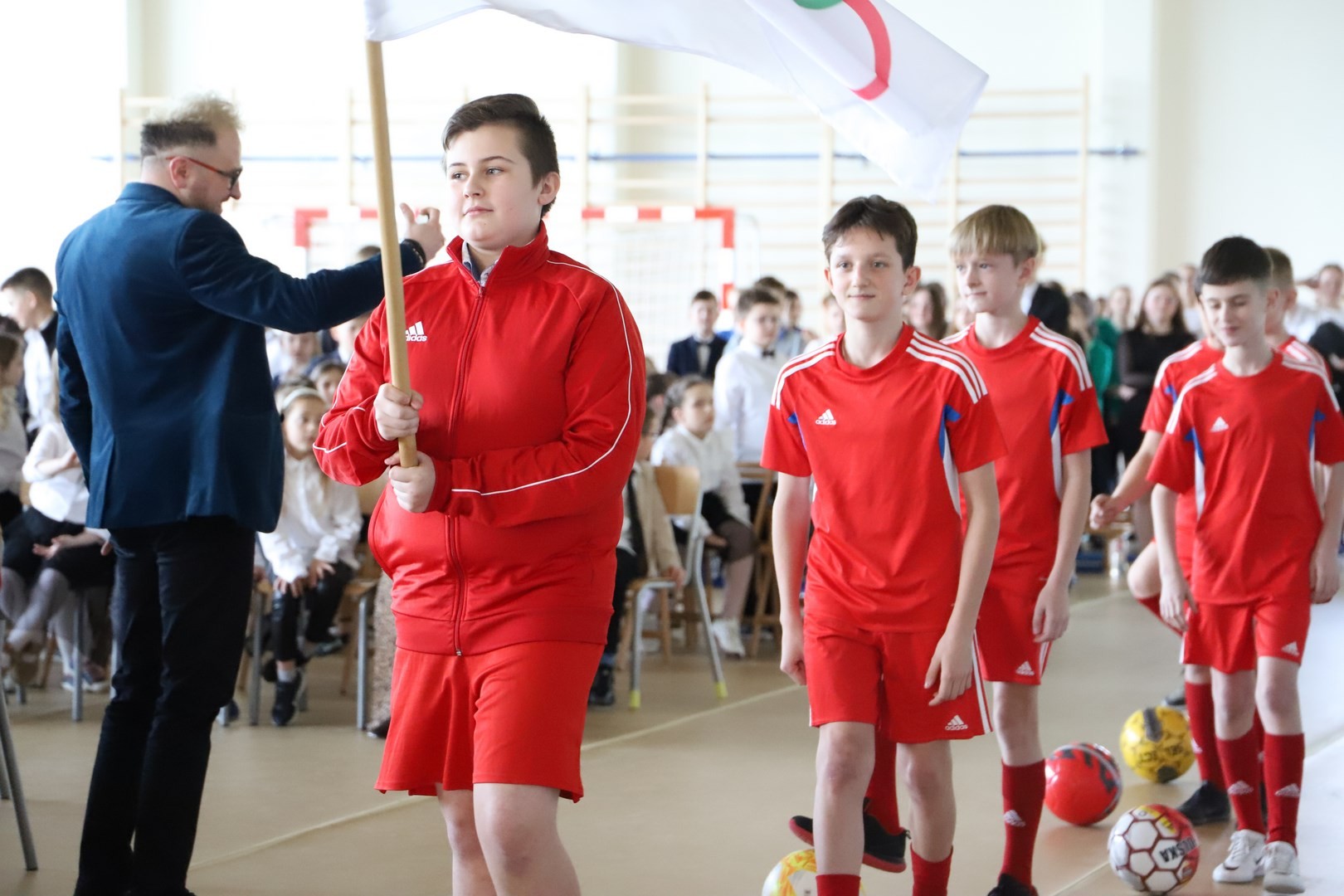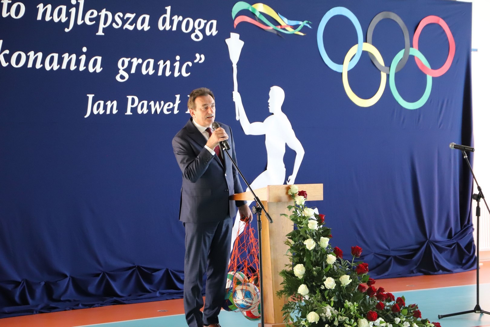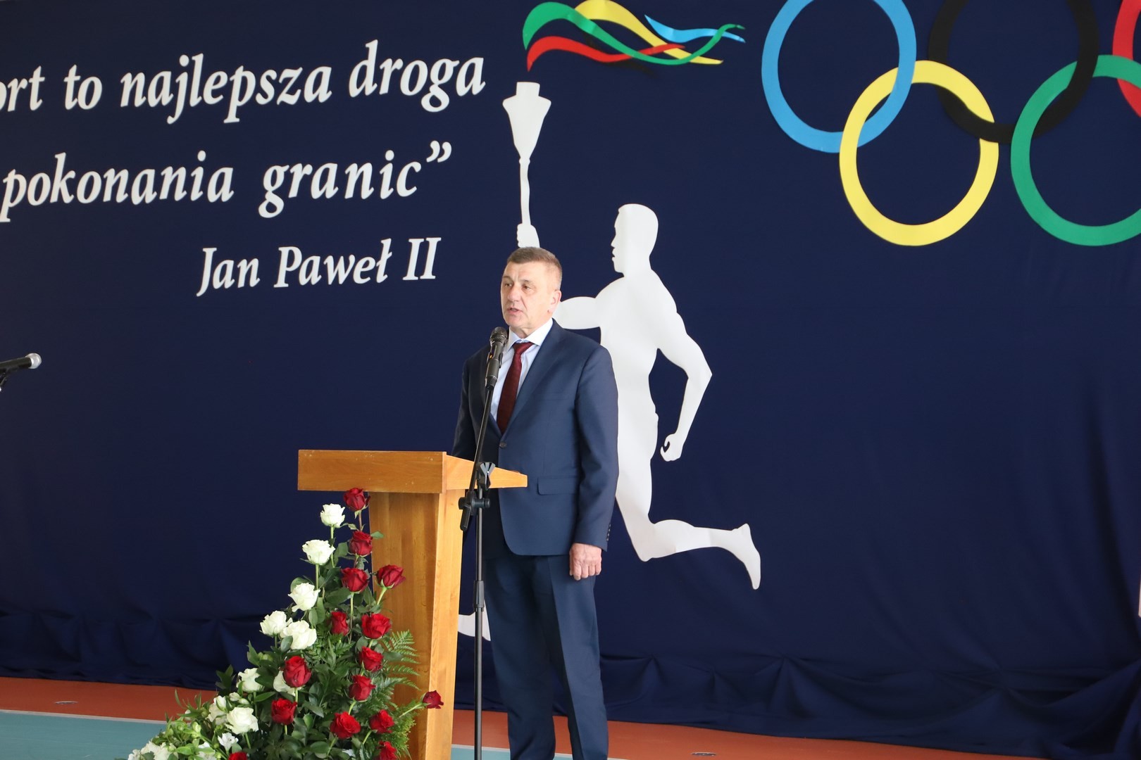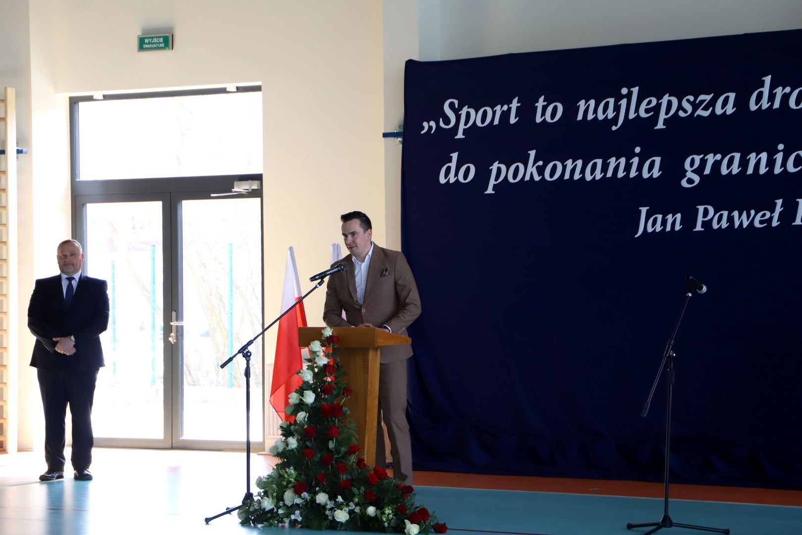 Następnie miało miejsce wprowadzenie pocztu sztandarowego i odśpiewanie hymnu państwowego przy akompaniamencie orkiestry. Stanowiło to preludium do kolejnego punktu uroczystości, jakim było symboliczne przecięcie wstęgi na znak oficjalnego oddania nowo wybudowanego obiektu do użytku publicznego. Ceremonia ta dopełniona została poprzez akt poświęcenia, którego dokonał ks. proboszcz Witold Machalski. W dalszej części programu imprezy głos zabrał Dyrektor Grzegorz Krzak, prezentując pokrótce historię zamysłu, planowania oraz powstawania inwestycji. Wyraził również nadzieję, że być może na tym obiekcie swoje pierwsze kroki będą stawiać przyszłe gwiazdy sportu, aby później odnosić sukcesy na arenie krajowej i międzynarodowej.