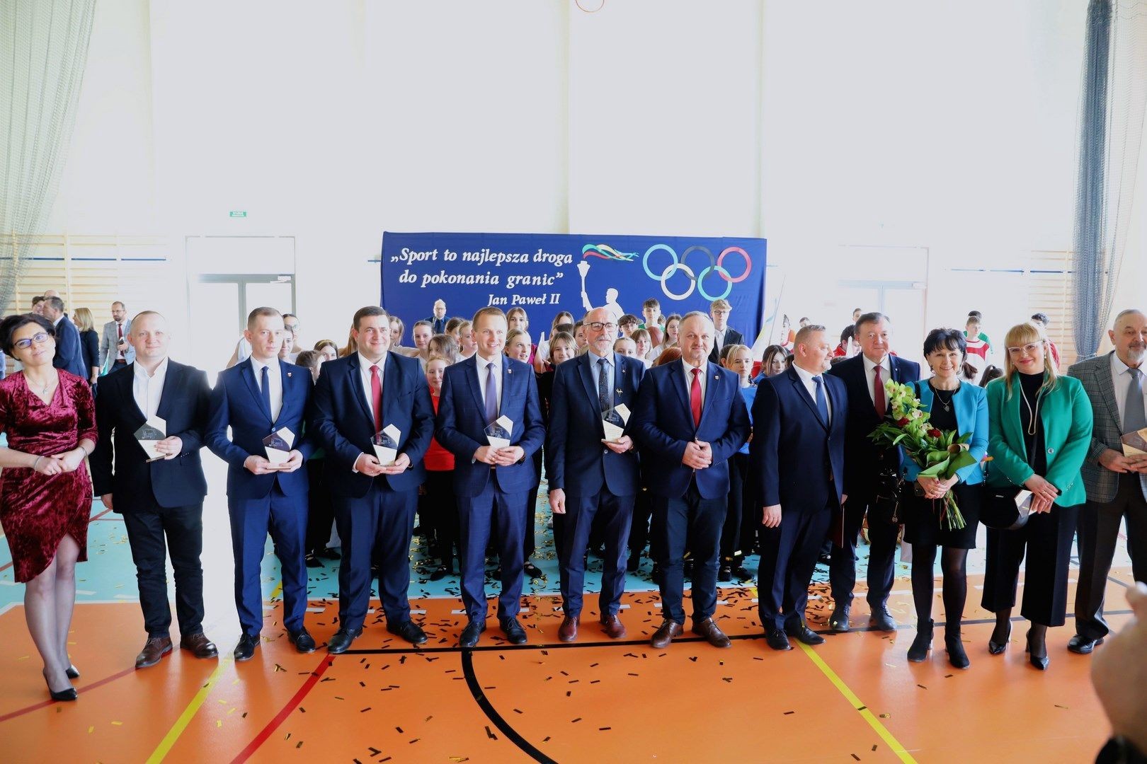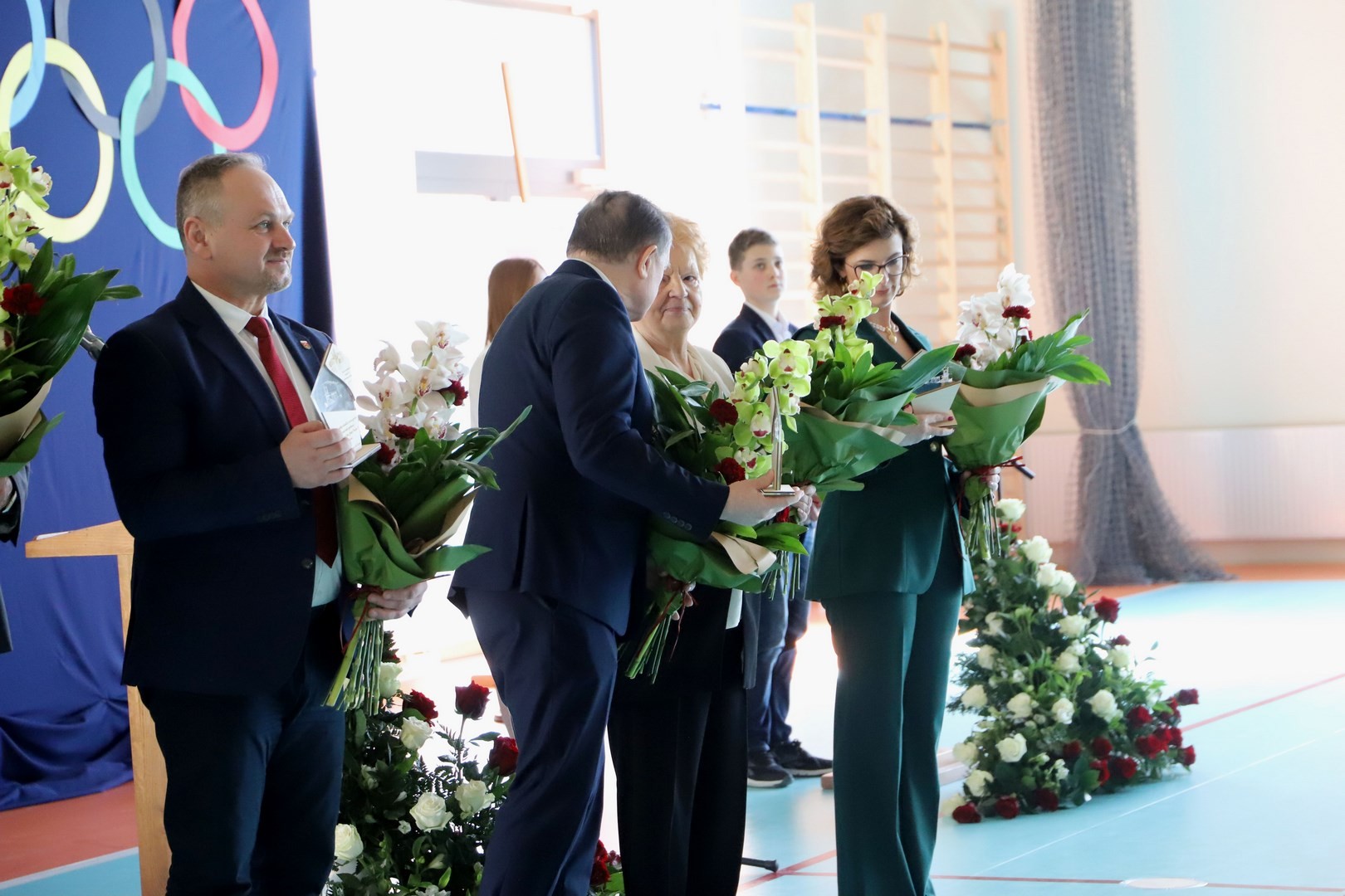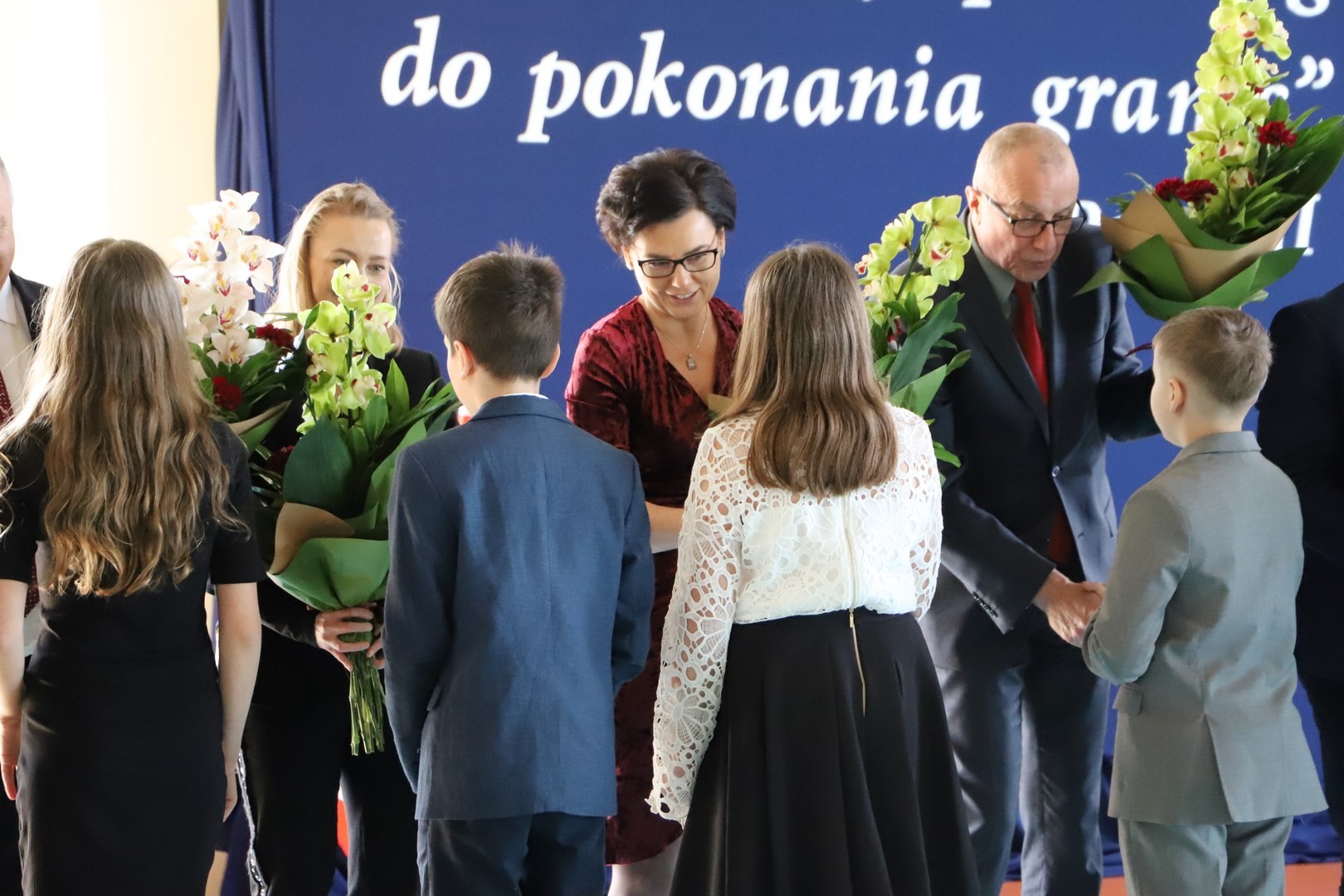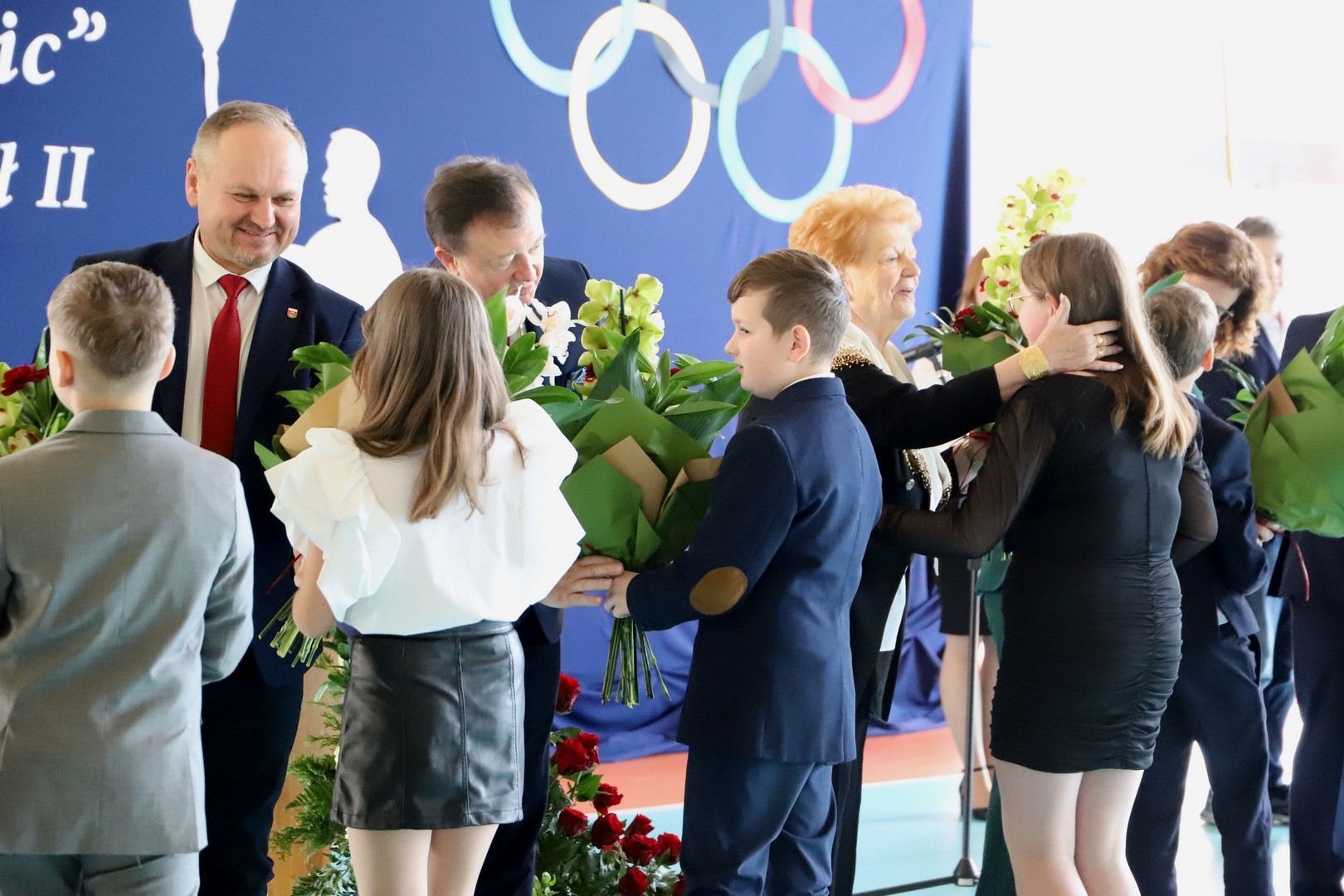 Zwieńczeniem uroczystości były podziękowania, wręczenie kwiatów oraz pamiątkowych statuetek zaproszonym gościom. Na scenie pojawili się również wszyscy uczniowie, biorący udział w występie artystycznym, którzy przy dźwiękach fanfar i wśród wirujących płatków confetti wydali triumfalny okrzyk, po czym na widowni rozbrzmiały gromkie brawa.