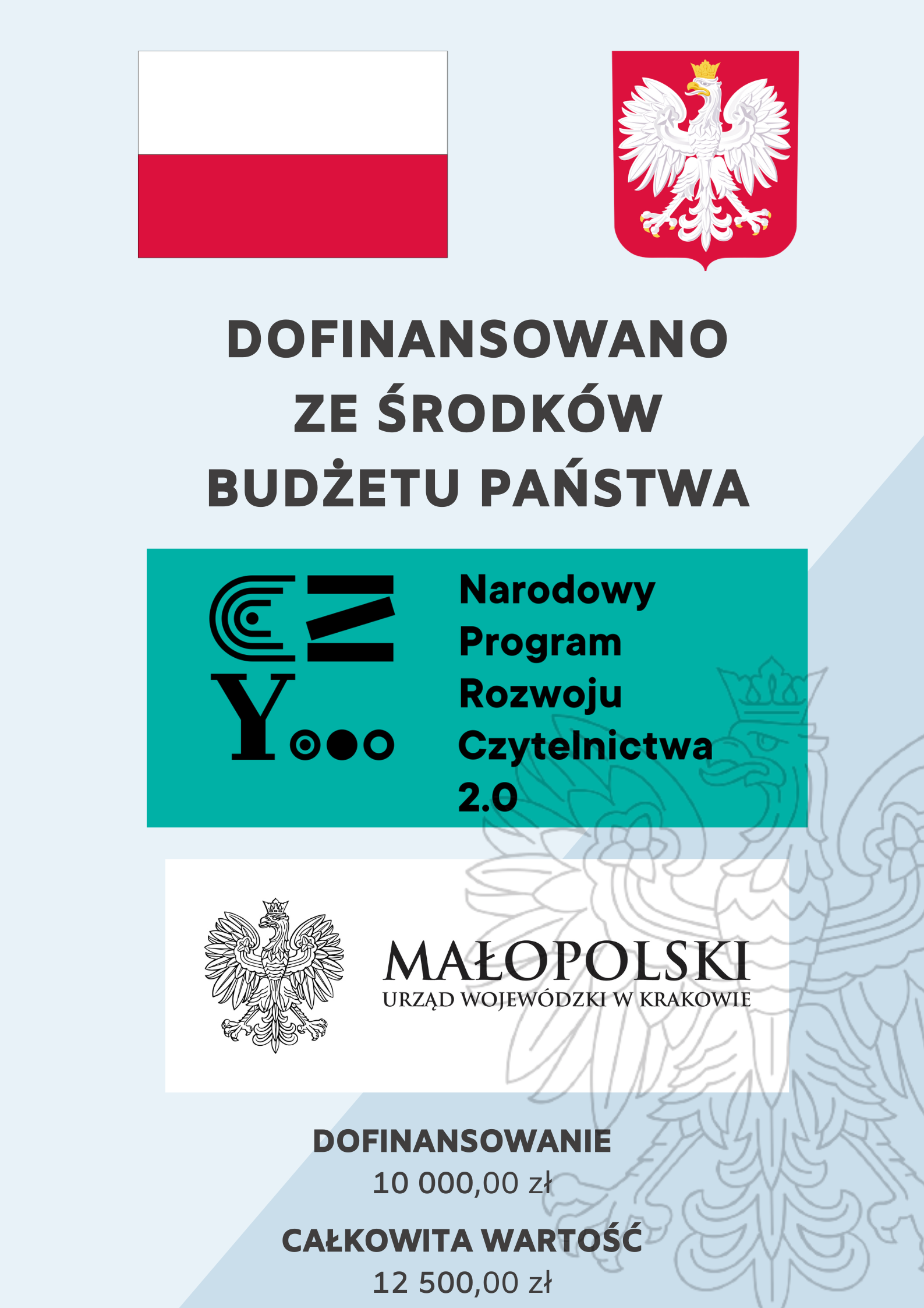 Na zakup książek do szkolnych bibliotek, zakup elementów wyposażenia bibliotek oraz realizację działań promujących czytelnictwo przeznaczona zostanie kwota 12 500,00 zł, z czego 10 000,00 zł to dotacja z Małopolskiego Urzędu Wojewódzkiego, a kwota 2 500,00 zł to wkład własny gminy.