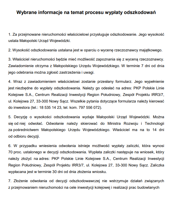 4. Wraz z zawiadomieniem właścicielowi zostanie przesłany formularz. Jego wypełnienie jest niezbędne do wypłaty odszkodowania. Należy go odesłać na adres: PKP Polskie Linie Kolejowe S.A., Centrum Realizacji Inwestycji Region Południowy, Zespół Projektu IRR3/7, ul. Kolejowa 27, 33-300 Nowy Sącz.