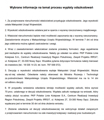 Przedstawiamy Państwu informację, otrzymaną od PKP Polskie Linie Kolejowe S.A, dotyczącą procedur wypłat odszkodowań oraz wykupu "resztówek' gruntów od mieszkańców objętych realizacją zadania „Zaprojektowanie ( w zakresie branży SRK) i kompleksowe wykonanie robót budowlanych na linii kolejowej104 na odcinku D Limanowa - bocznica Klęczany".