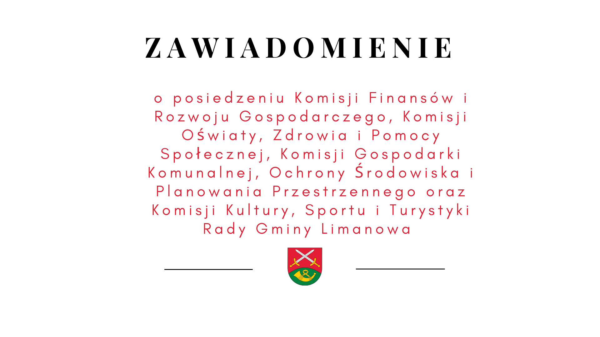Na podstawie § 60 ust. 1, ust. 3 i ust. 7 uchwały Nr XXIX/278/2018 Rady Gminy Limanowa z dnia 6 września 2018 r. w sprawie Statutu Gminy Limanowa (Dz. Urz. Woj. Mał. z 2018 r. poz. 6395) zapraszam na wspólne posiedzenie Komisji Finansów i Rozwoju Gospodarczego, Komisji Oświaty, Zdrowia i Pomocy Społecznej, Komisji Gospodarki Komunalnej, Ochrony Środowiska i Planowania Przestrzennego oraz Komisji Kultury, Sportu i Turystyki Rady Gminy Limanowa, które odbędzie się w dniu