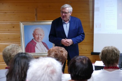 Zasługi Papieża przypomniał jezuita, ksiądz Stanisław Cieślak SJ z Krakowa, który w poruszający sposób przedstawił życie, nauki oraz duchowe dziedzictwo Jana Pawła II. Podkreślił znaczenie jego pontyfikatu nie tylko dla Kościoła katolickiego, ale także dla całego świata. Akcentował jego głęboką wiarę, niezłomną postawę wobec trudności oraz nadmieniał o licznych inicjatywach podejmowanych na rzecz pokoju i dialogu międzykulturowego. Jezuita wskazał także na osobistą więź, jaką wielu ludzi na całym świecie odczuwało i nadal odczuwa wobec świętego Papieża. Kapłan zwrócił uwagę na przełomowe wydarzenia, takie jak: zamach na Papieża, śmierć, beatyfikacja i kanonizacja. Szczególne miejsce w swoim wystąpieniu poświęcił pielgrzymkom Jana Pawła II do Polski, podczas których padały mocne, jakże aktualne słowa i apel do rodaków.