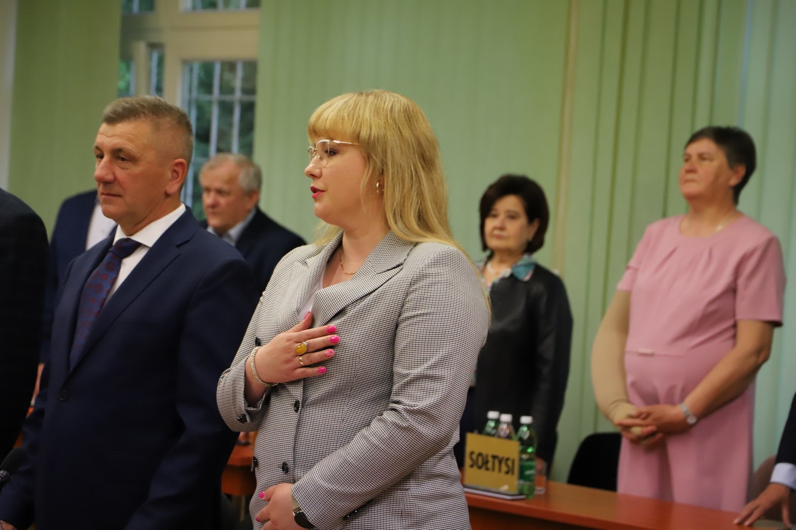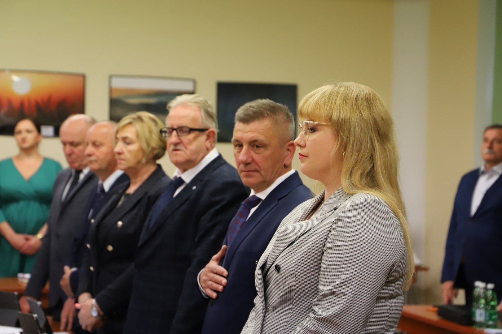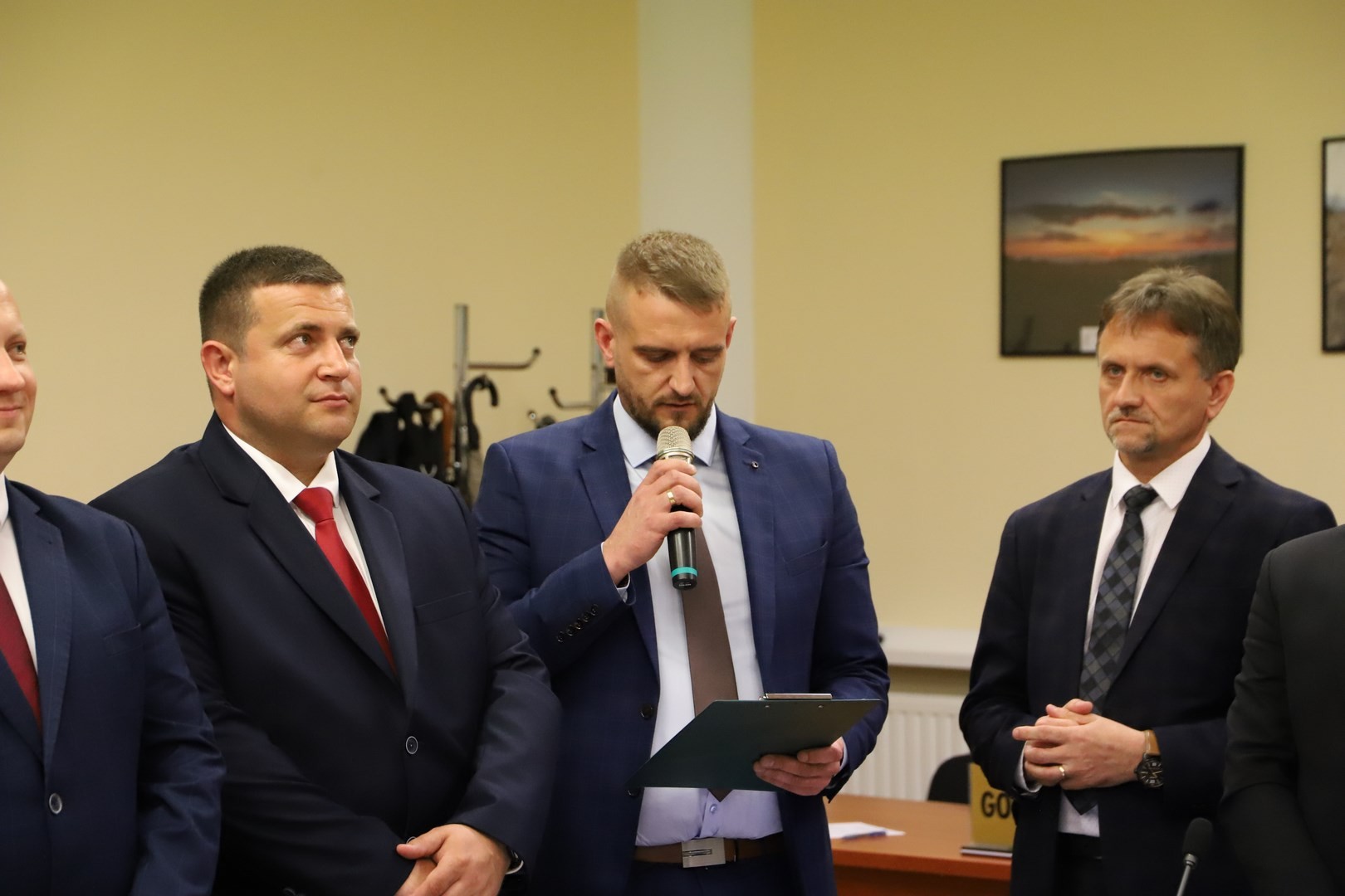 „Wierny Konstytucji i prawu Rzeczypospolitej Polskiej, ślubuję uroczyście obowiązki radnego sprawować godnie, rzetelnie i uczciwie, mając na względzie dobro mojej gminy i jej mieszkańców”, kolejno każdy radny gminy złożył ślubowanie wypowiadając zdanie