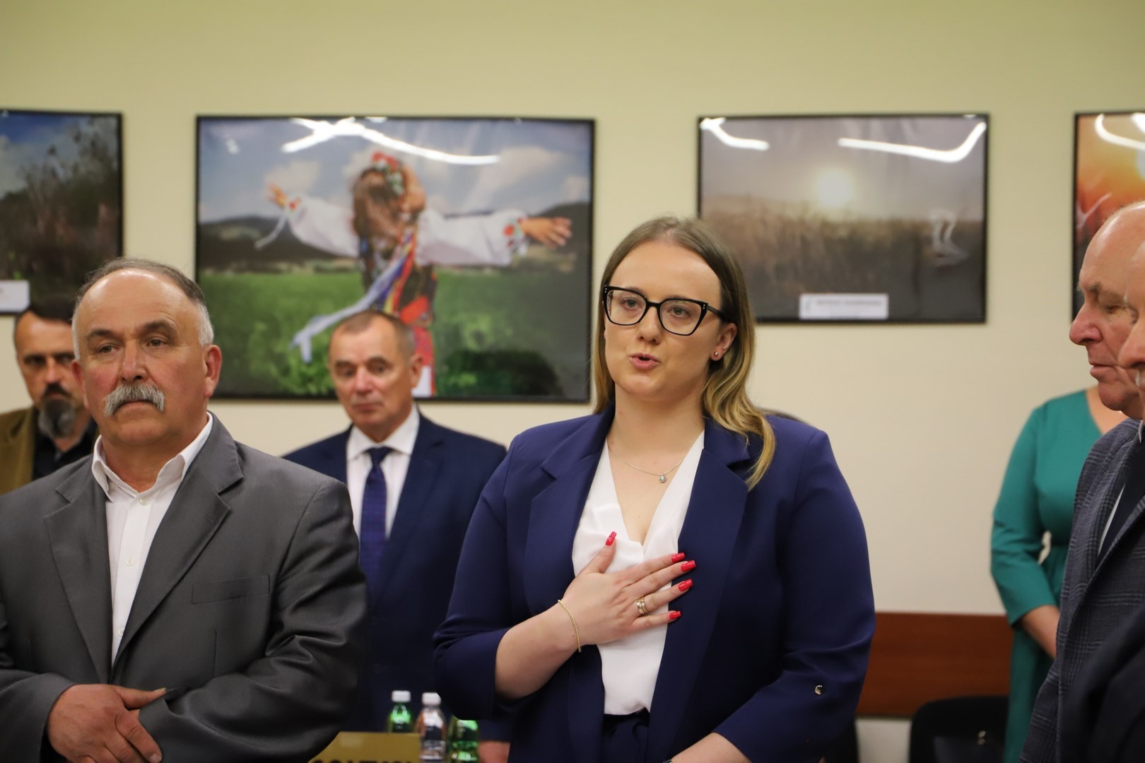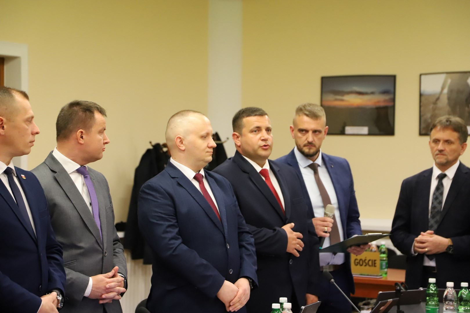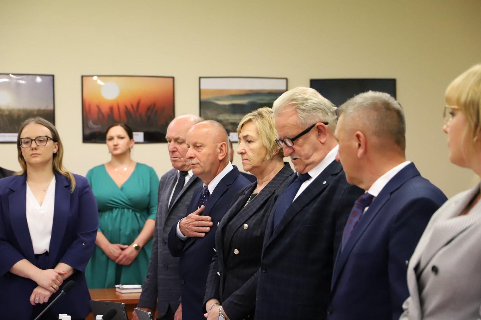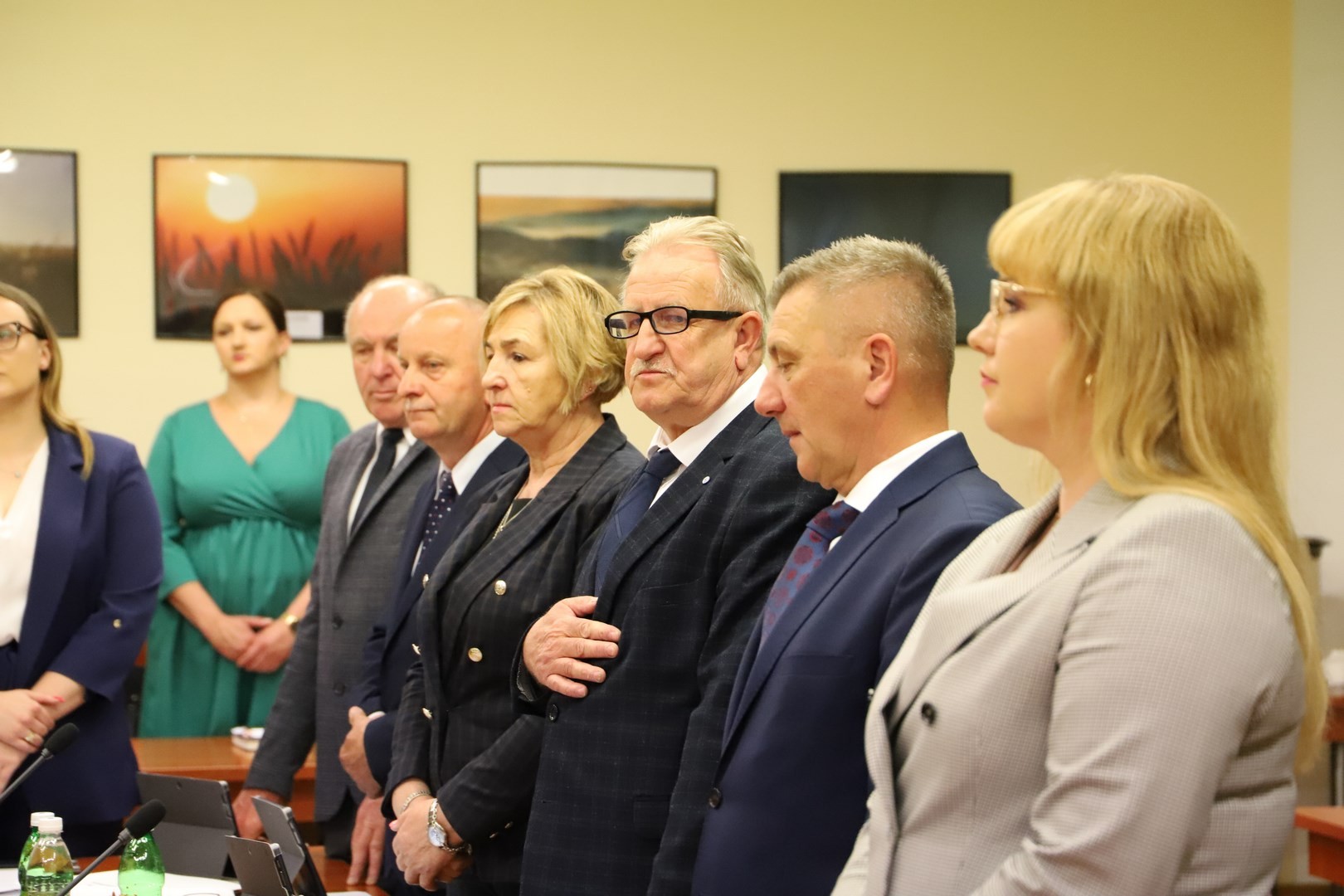 „Wierny Konstytucji i prawu Rzeczypospolitej Polskiej, ślubuję uroczyście obowiązki radnego sprawować godnie, rzetelnie i uczciwie, mając na względzie dobro mojej gminy i jej mieszkańców”, kolejno każdy radny gminy złożył ślubowanie wypowiadając zdanie