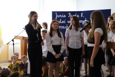 Kolejnym punktem uroczystości był program artystyczny, mający na celu przybliżenie postaci i nauczania Papieża Polaka w wykonaniu naszych utalentowanych uczniów. W klimat wspomnień wprowadziła nas Ania i Kasia z klasy 2 A, które zaśpiewały „Barkę” - ulubioną pieśń Jana Pawła II. To właśnie ten utwór łączył ludzi podczas pielgrzymek do naszego kraju. Piękne recytacje uczniów przeplatały się z wykonaniami utworów muzycznych. Występowi towarzyszyły chwilę wzruszenia, zadumy, refleksji, ale również dobrego humoru. Dopełnieniem działań związanych z obchodami Dnia Patrona były lekcje wychowawcze dotyczące życia i twórczości Jana Pawła II.