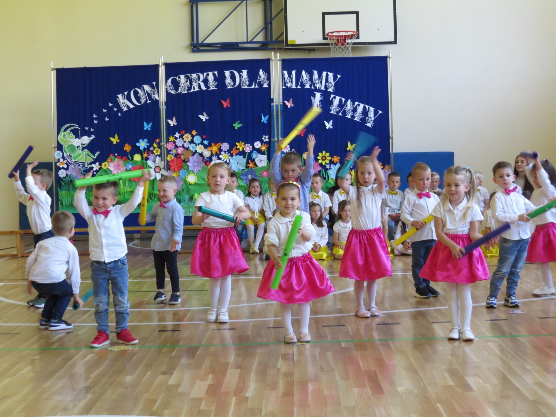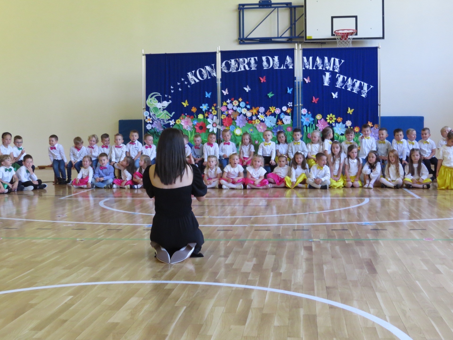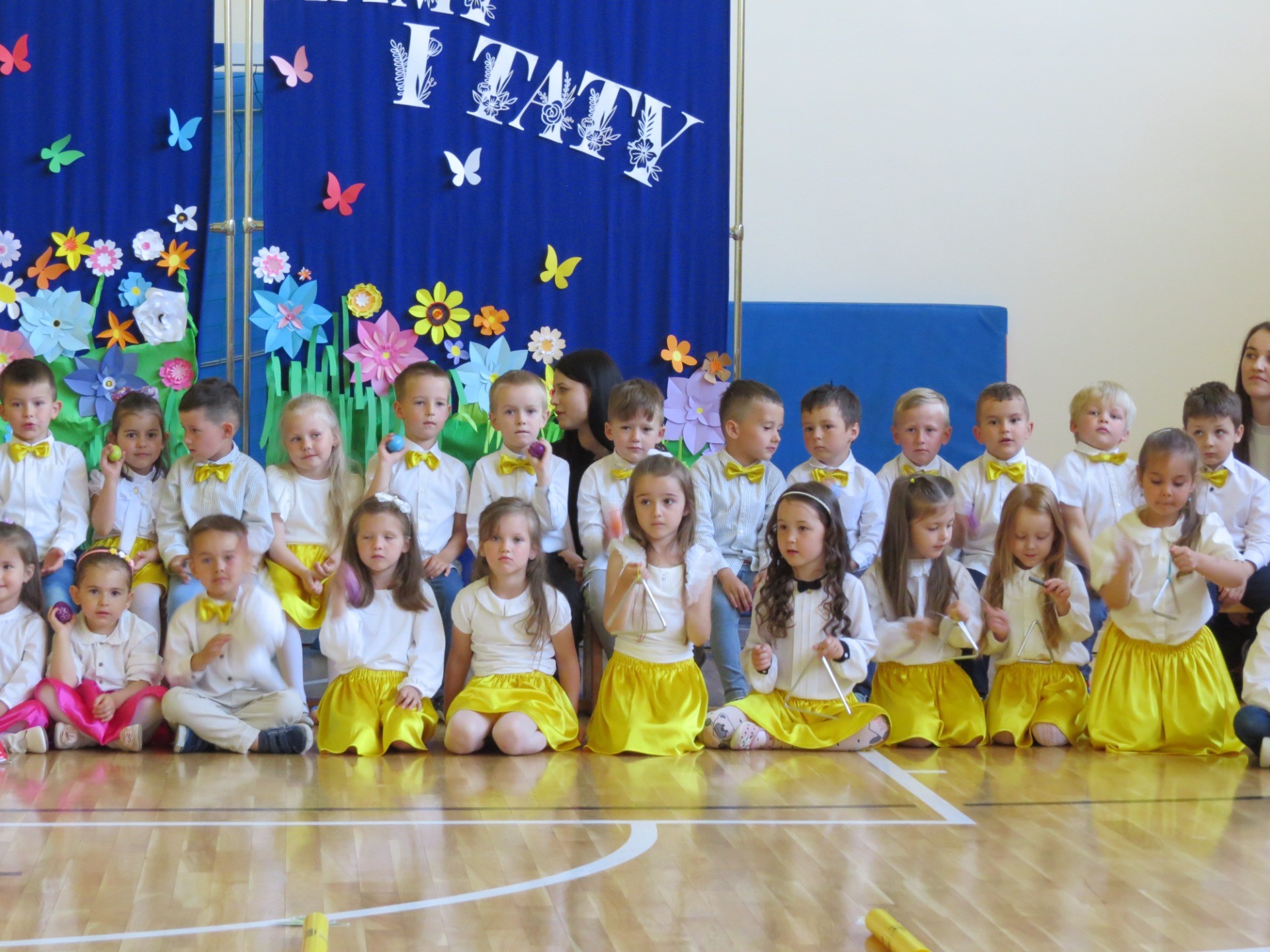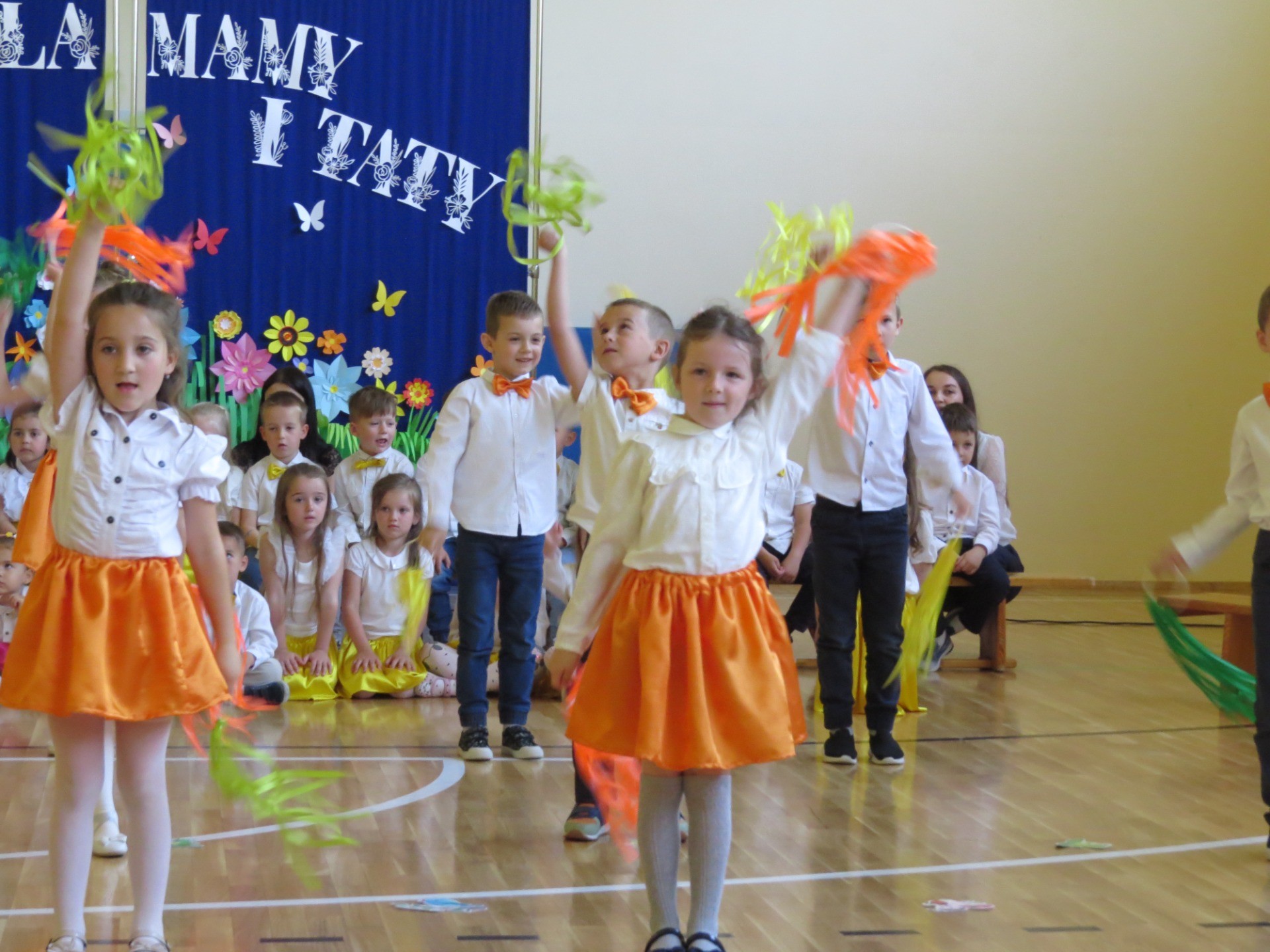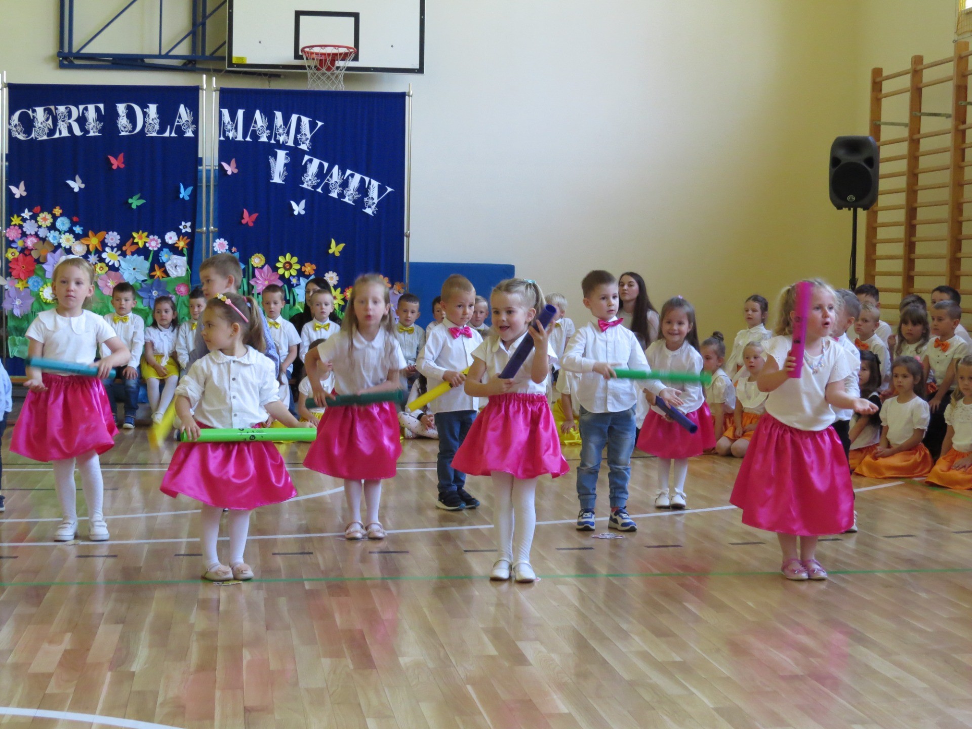 „Koncert dla mamy i taty”. Zebranych gości serdecznie przywitała Dyrektor Natalia Kordeczka, po czym głos zabrały dzieci. Przedszkolaki ubrane w kolorowe stroje pięknie śpiewały, grały i tańczyły, a następne składały życzenia swoim rodzicom i obdarowywały ich kwiatami oraz samodzielnie wykonanymi laurkami.