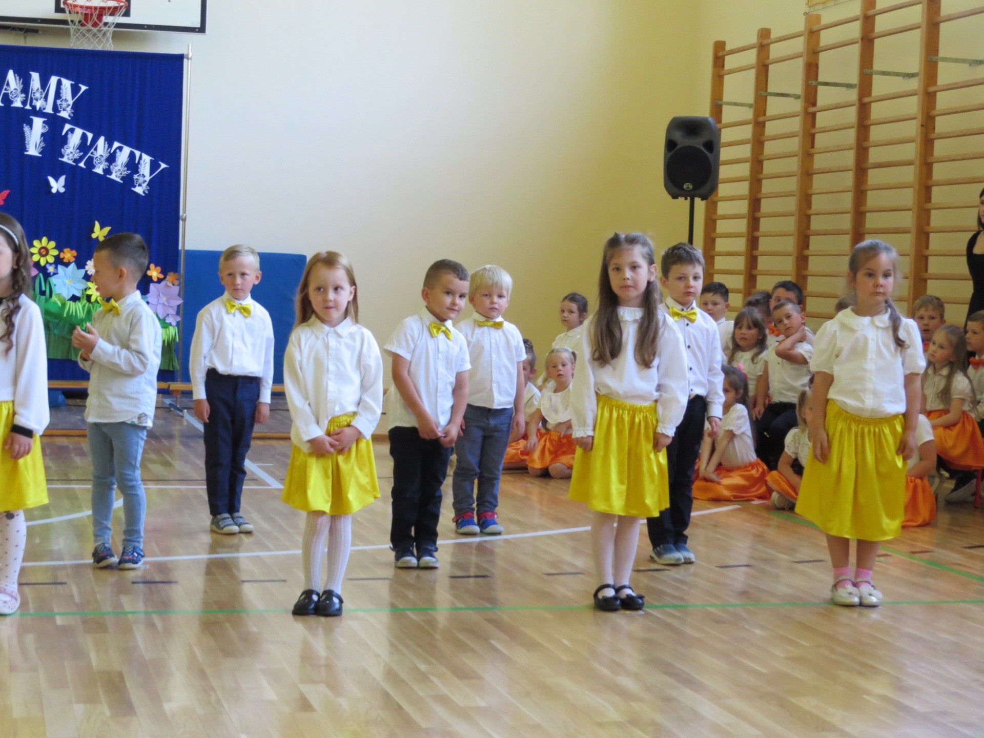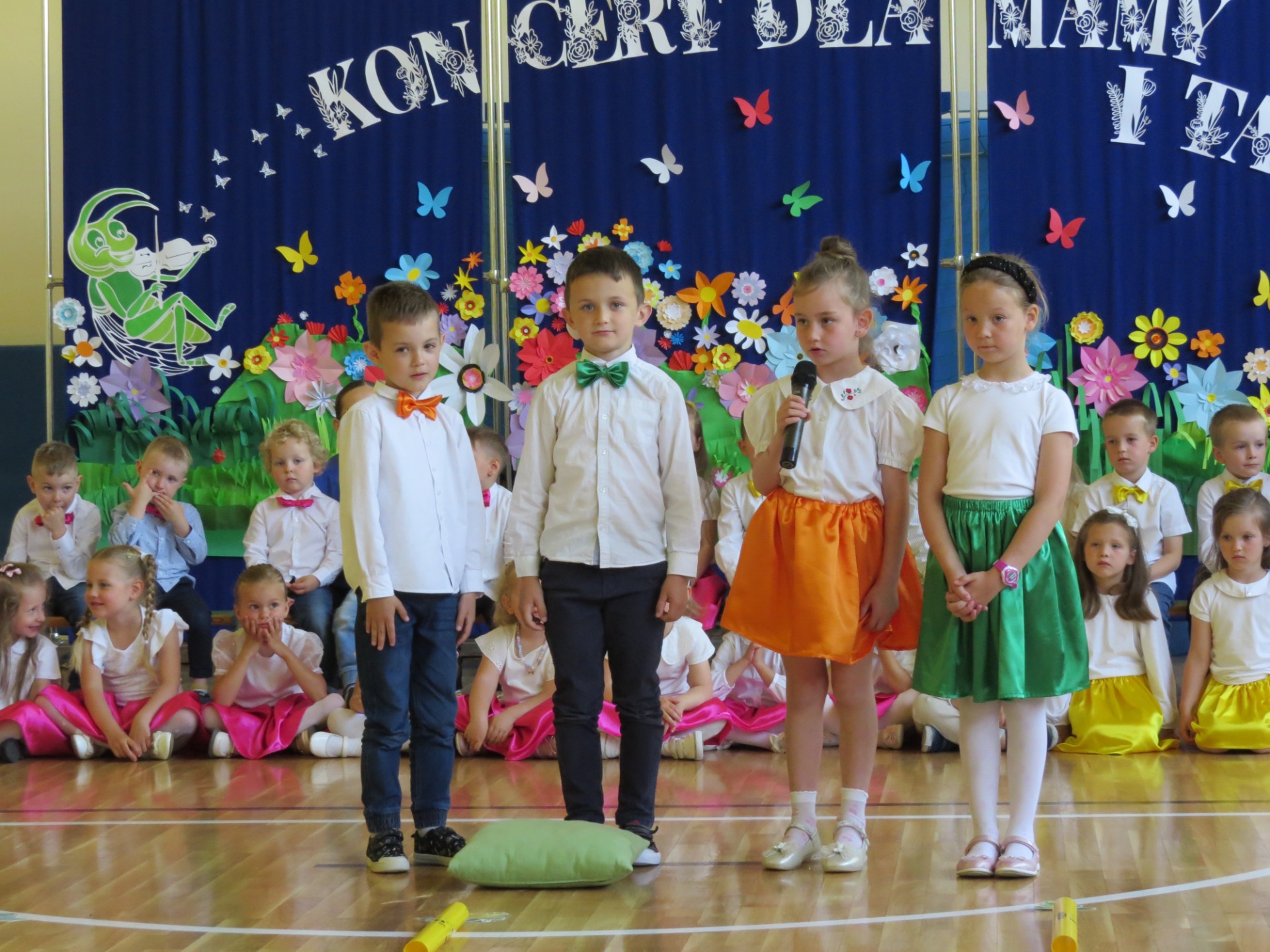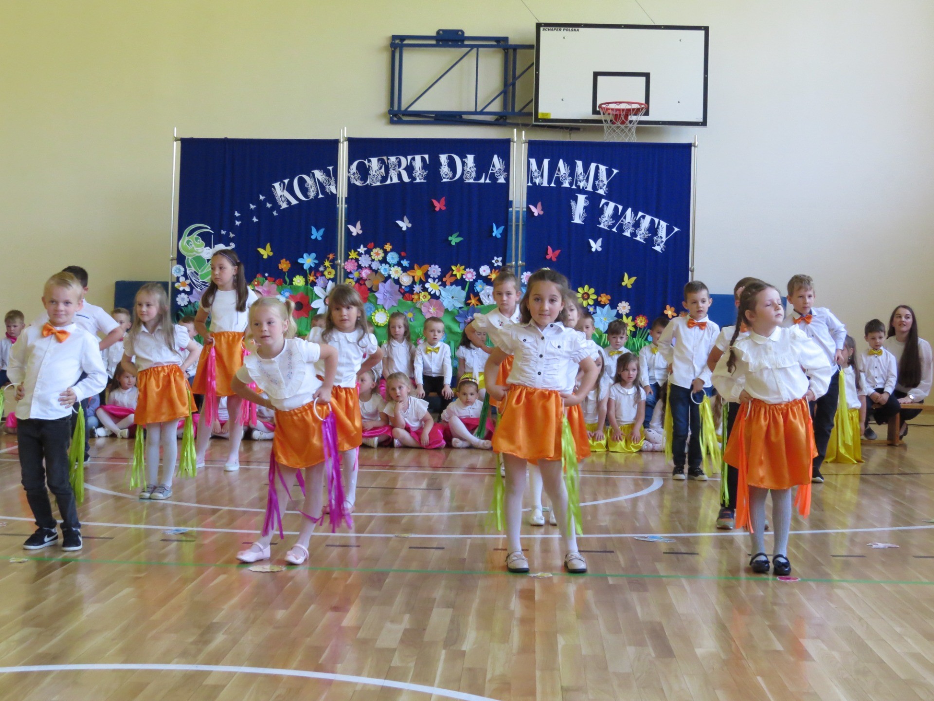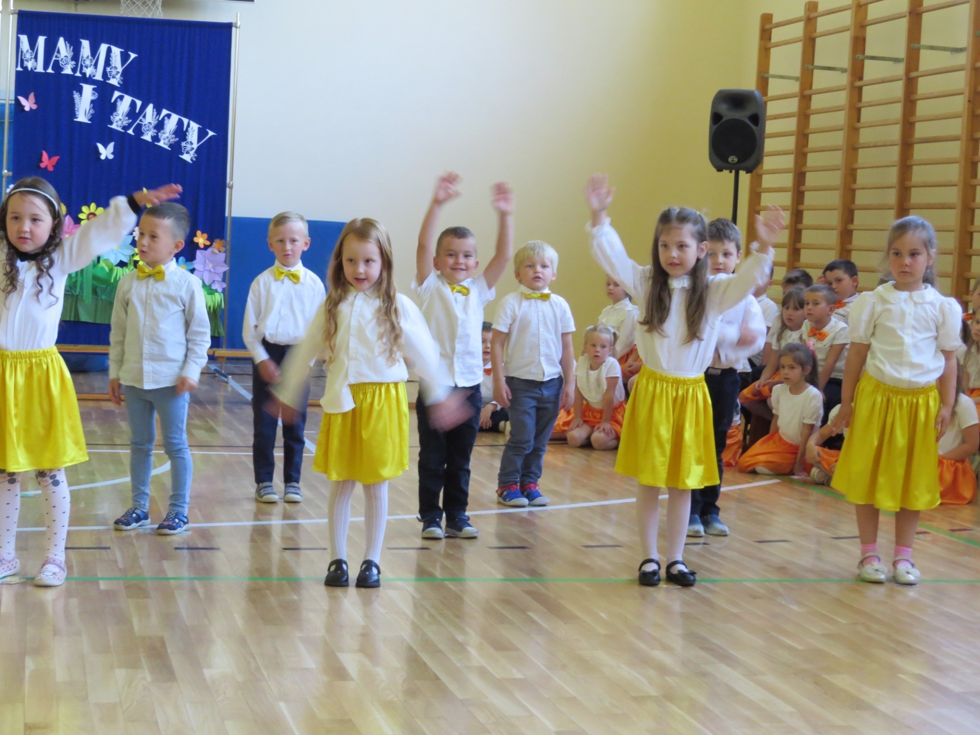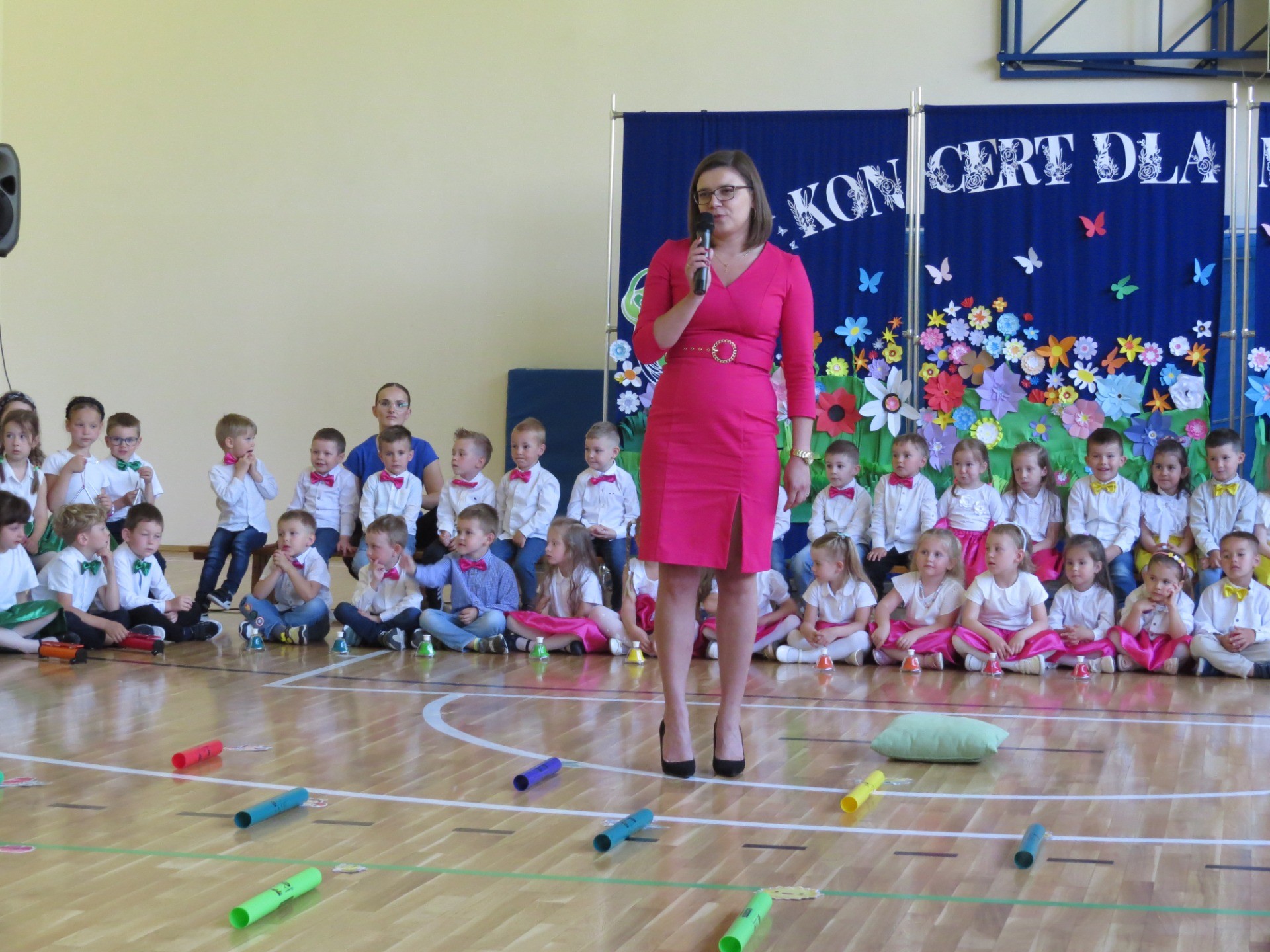 „Koncert dla mamy i taty”. Zebranych gości serdecznie przywitała Dyrektor Natalia Kordeczka, po czym głos zabrały dzieci. Przedszkolaki ubrane w kolorowe stroje pięknie śpiewały, grały i tańczyły, a następne składały życzenia swoim rodzicom i obdarowywały ich kwiatami oraz samodzielnie wykonanymi laurkami.