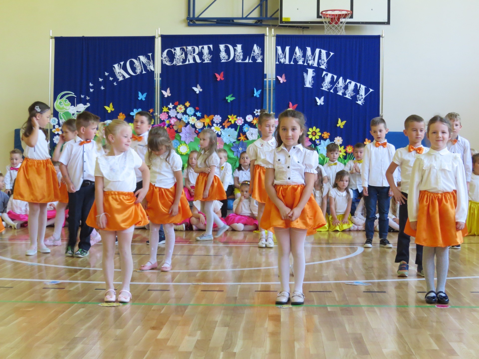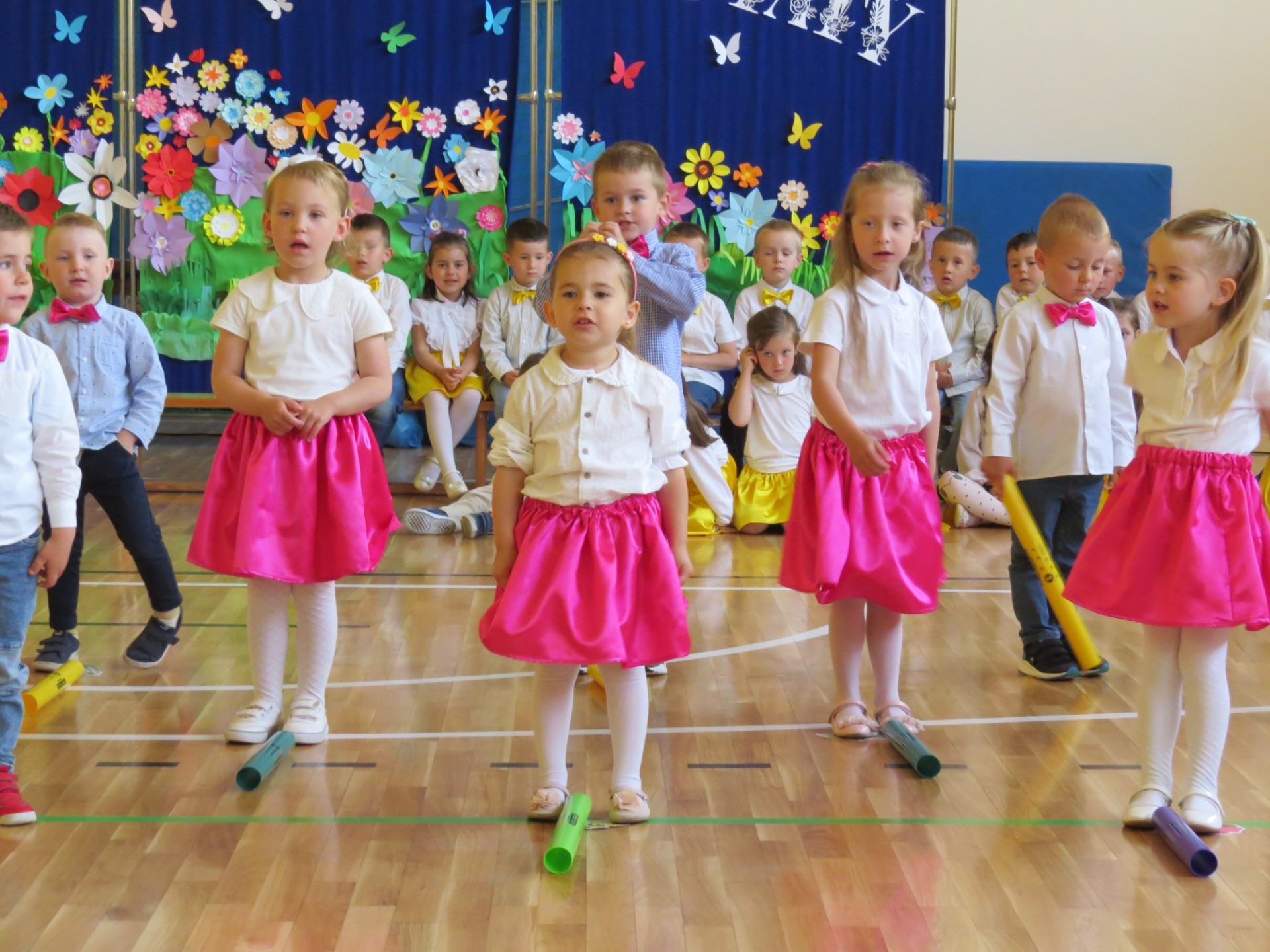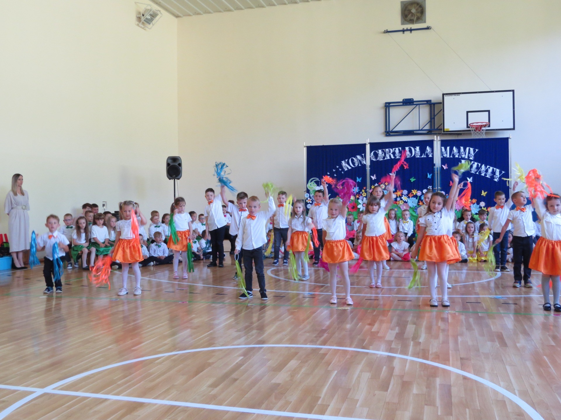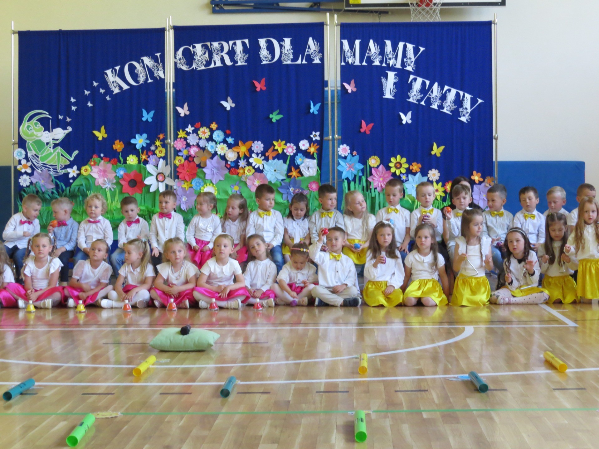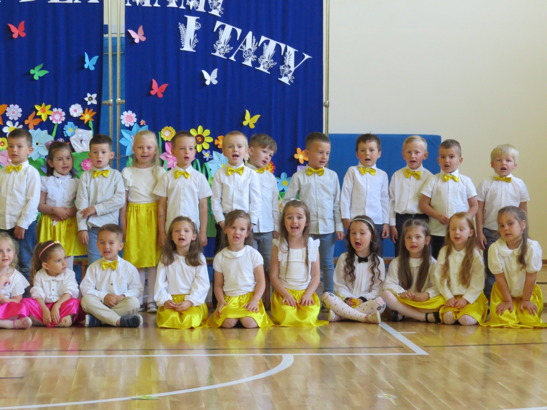 „Koncert dla mamy i taty”. Zebranych gości serdecznie przywitała Dyrektor Natalia Kordeczka, po czym głos zabrały dzieci. Przedszkolaki ubrane w kolorowe stroje pięknie śpiewały, grały i tańczyły, a następne składały życzenia swoim rodzicom i obdarowywały ich kwiatami oraz samodzielnie wykonanymi laurkami.
