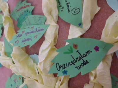Dzieci z klas I – III przez tydzień podejmowały drobne działania , które przyczyniły się do ochrony środowiska naturalnego. Swoje dobre uczynki dla matki Ziemi zapisywały na zielonych listkach, które następne zostały umieszczone na symbolicznych drzewach. Stanowiło to imponującą i ciekawą dekorację szkolnych korytarzy a także źródło inspiracji.