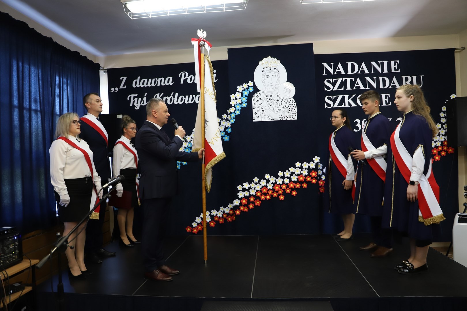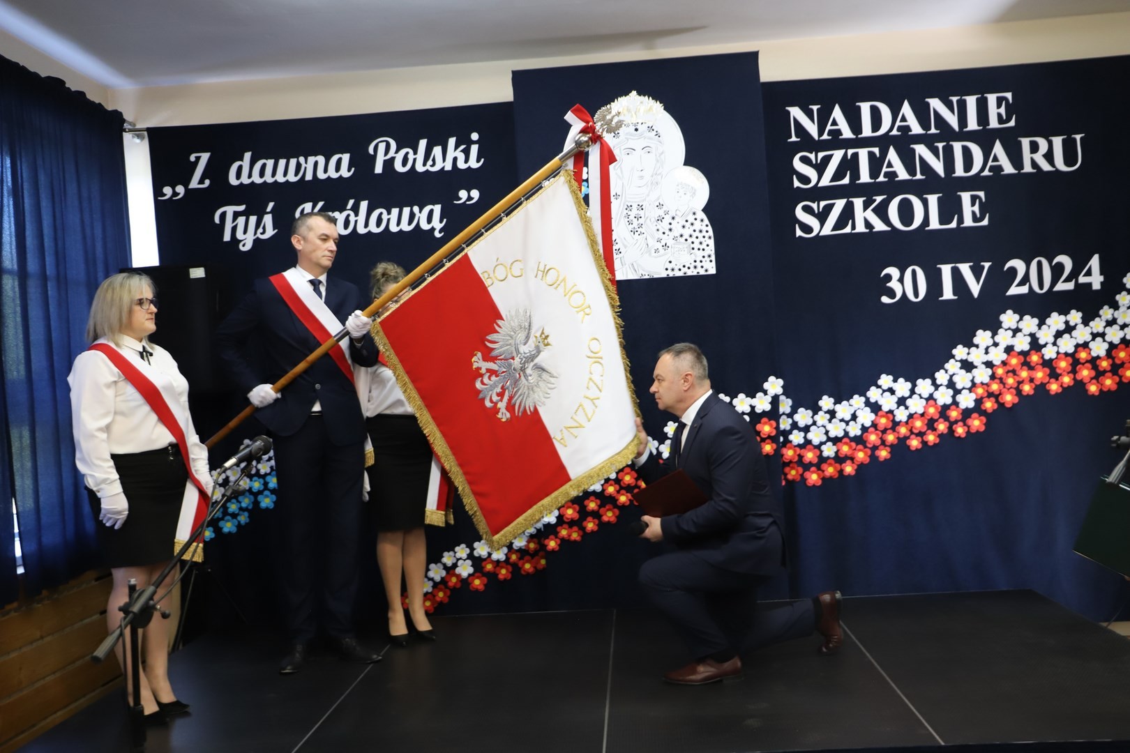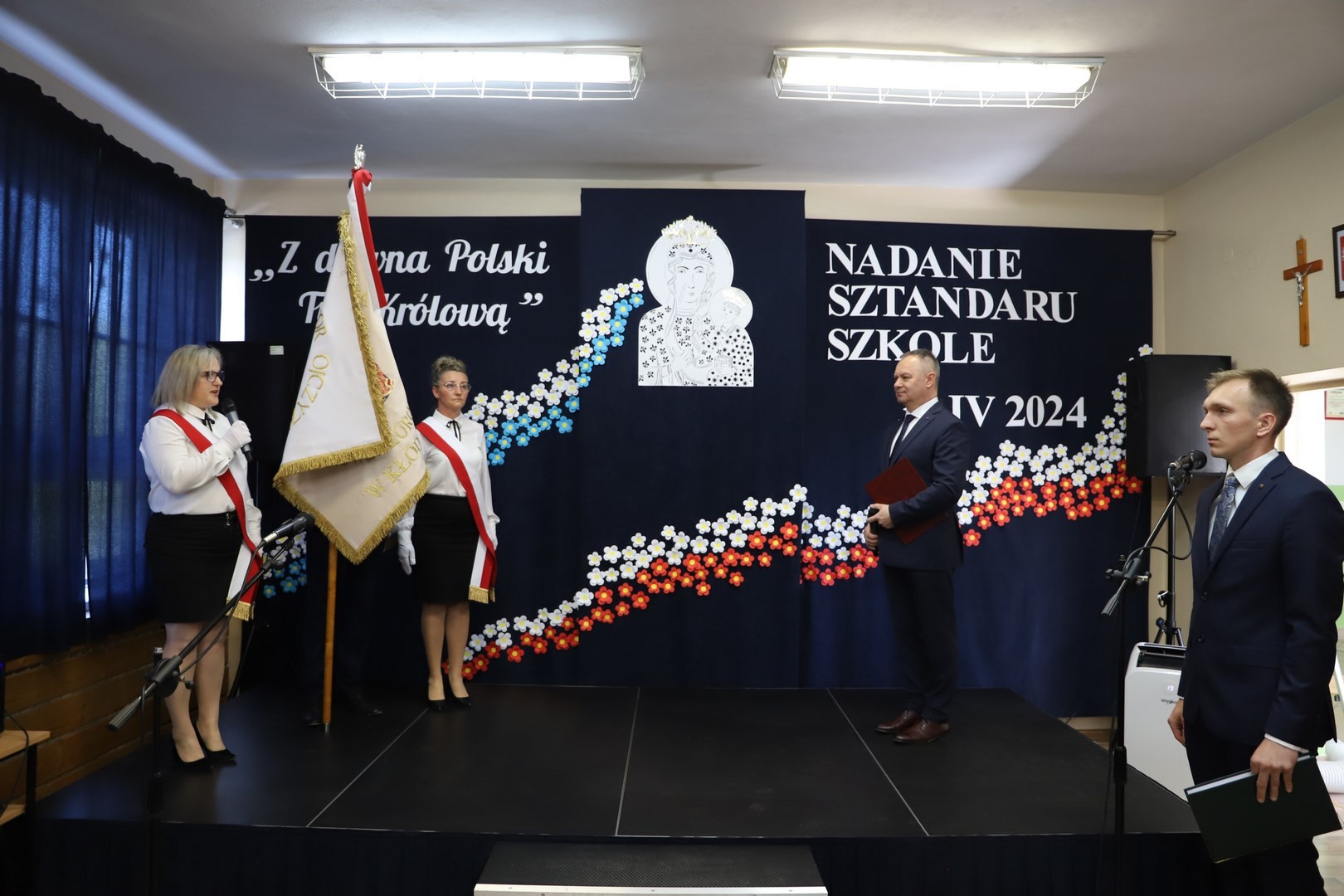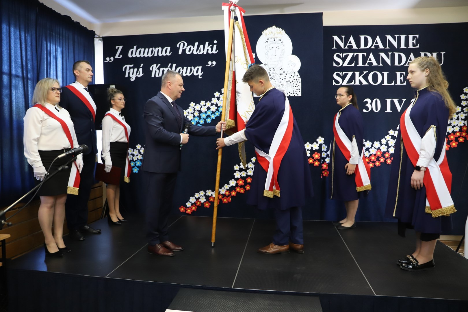 Poświęcenia sztandaru szkoły dokonał ksiądz biskup Leszek Leszkiewicz w czasie mszy św. w kościele parafialnym w Chomranicach, a następnie już w szkole nastąpił uroczysty akt przekazania sztandaru przez rodziców na ręce dyrektora szkoły, Romana Ciesielczyka, który z kolei wręczył sztandar uczniom. Po odśpiewaniu hymnu szkoły wszyscy zgromadzeni mogli obejrzeć część artystyczną w wykonaniu uczniów szkoły, którzy przez swój występ chcieli godnie uczcić ten szczególny dzień. Przedstawili zgromadzonym historię przyjęcia przez szkołę Patronki, wyjaśnili, jak doszło do nadania Matce Bożej tytułu Królowej Korony Polskiej oraz nawiązali do rocznicy uchwalenia Konstytucji 3 Maja. Historyczne wydarzenia były przeplatane wierszami tematycznymi oraz pieśniami ku czci Patronki szkoły w wykonaniu szkolnego chóru. Na podsumowanie tej części wszyscy odśpiewali hymn państwowy.