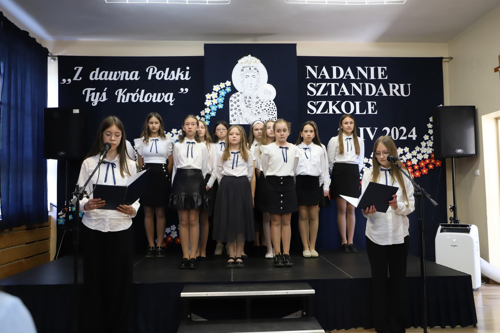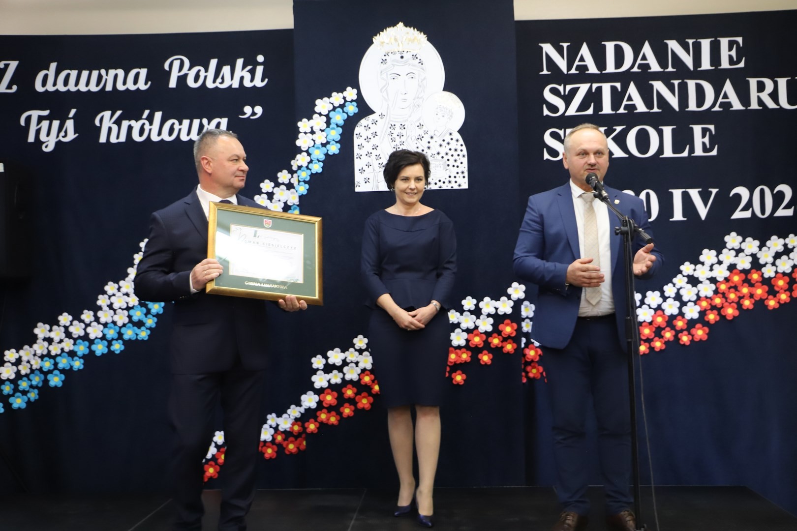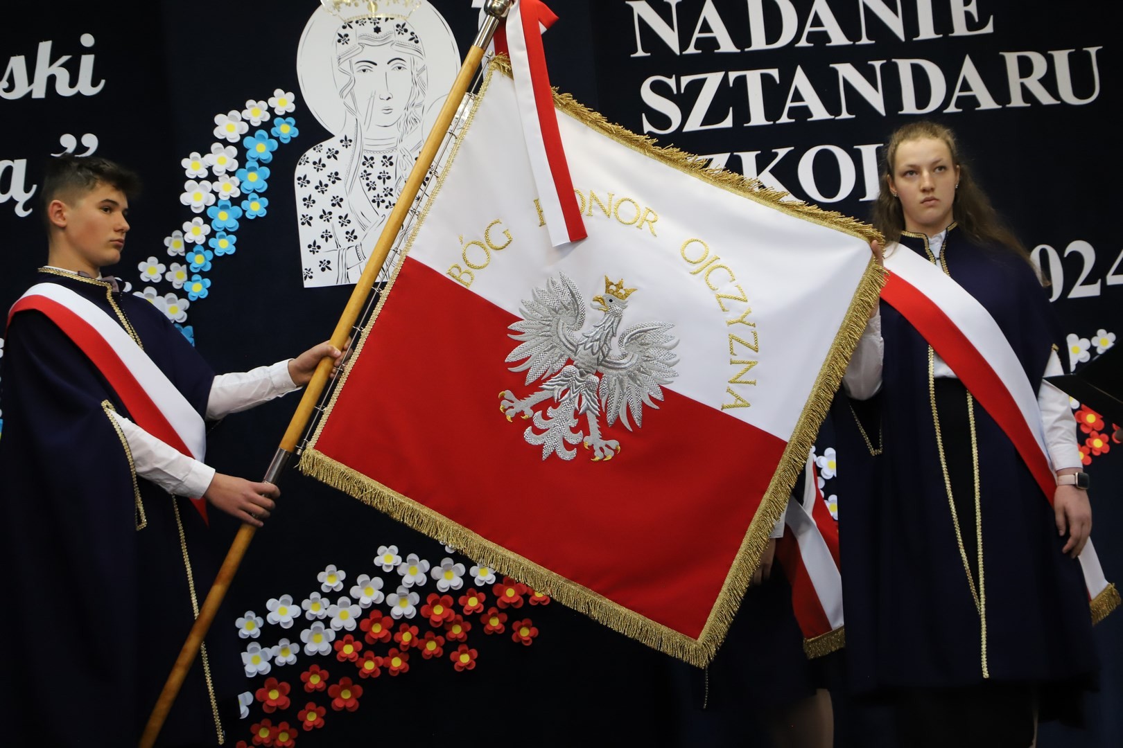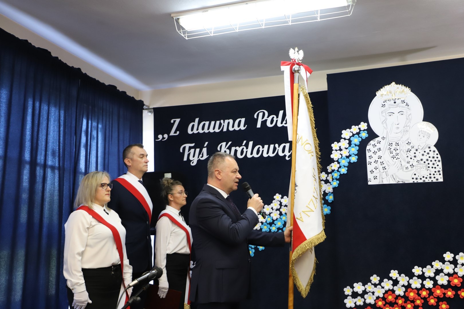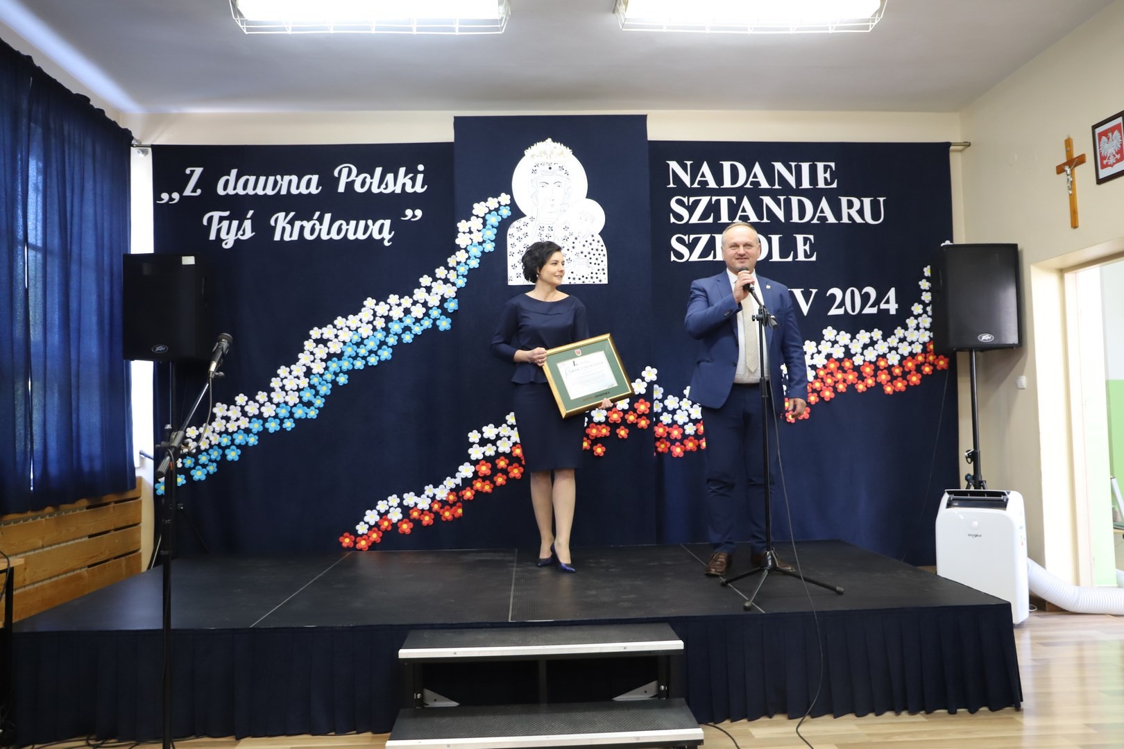 Poświęcenia sztandaru szkoły dokonał ksiądz biskup Leszek Leszkiewicz w czasie mszy św. w kościele parafialnym w Chomranicach, a następnie już w szkole nastąpił uroczysty akt przekazania sztandaru przez rodziców na ręce dyrektora szkoły, Romana Ciesielczyka, który z kolei wręczył sztandar uczniom. Po odśpiewaniu hymnu szkoły wszyscy zgromadzeni mogli obejrzeć część artystyczną w wykonaniu uczniów szkoły, którzy przez swój występ chcieli godnie uczcić ten szczególny dzień. Przedstawili zgromadzonym historię przyjęcia przez szkołę Patronki, wyjaśnili, jak doszło do nadania Matce Bożej tytułu Królowej Korony Polskiej oraz nawiązali do rocznicy uchwalenia Konstytucji 3 Maja. Historyczne wydarzenia były przeplatane wierszami tematycznymi oraz pieśniami ku czci Patronki szkoły w wykonaniu szkolnego chóru. Na podsumowanie tej części wszyscy odśpiewali hymn państwowy.