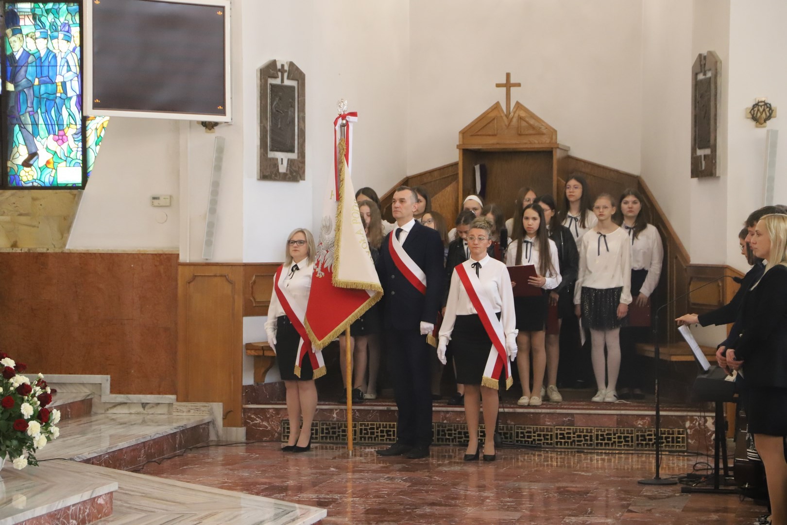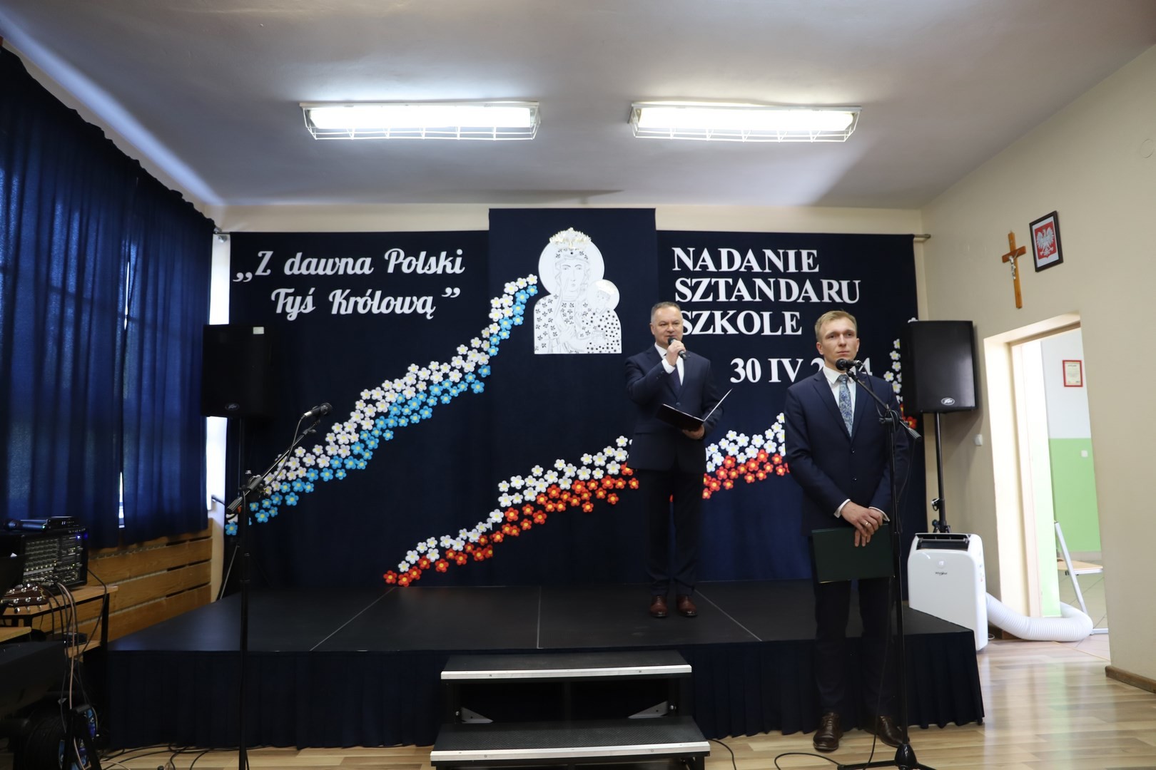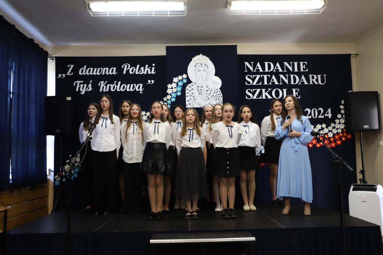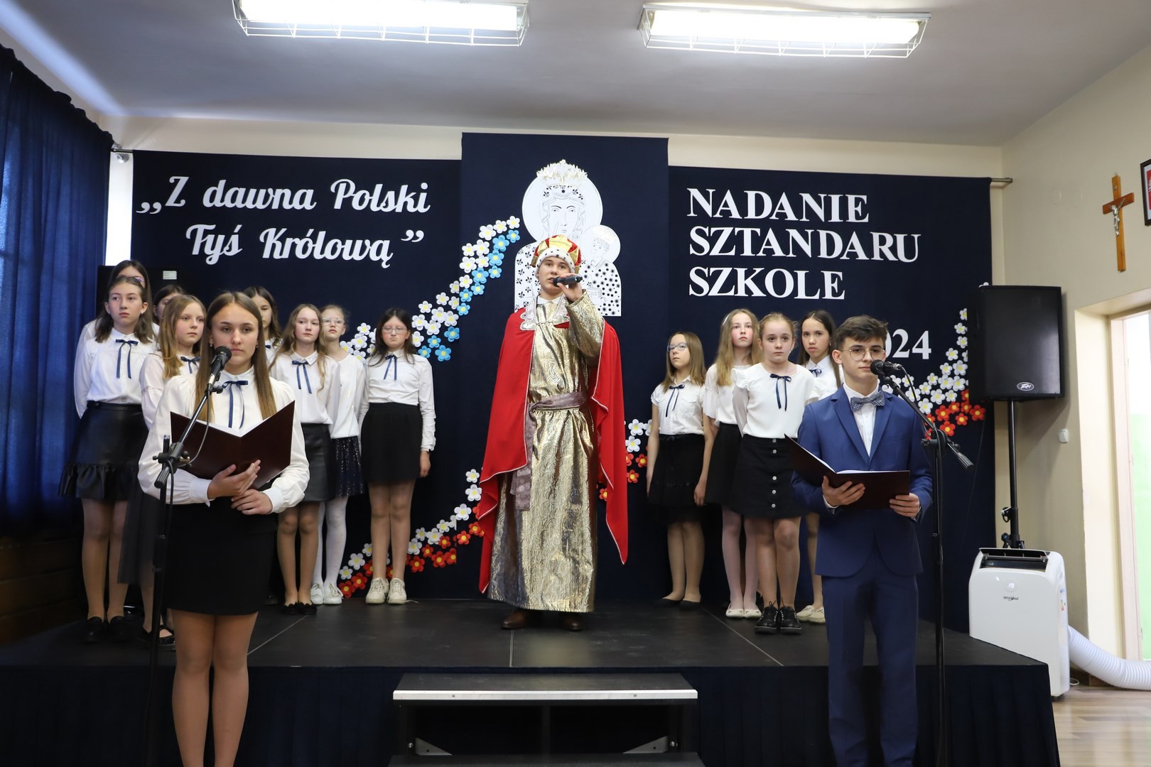Poświęcenia sztandaru szkoły dokonał ksiądz biskup Leszek Leszkiewicz w czasie mszy św. w kościele parafialnym w Chomranicach, a następnie już w szkole nastąpił uroczysty akt przekazania sztandaru przez rodziców na ręce dyrektora szkoły, Romana Ciesielczyka, który z kolei wręczył sztandar uczniom. Po odśpiewaniu hymnu szkoły wszyscy zgromadzeni mogli obejrzeć część artystyczną w wykonaniu uczniów szkoły, którzy przez swój występ chcieli godnie uczcić ten szczególny dzień. Przedstawili zgromadzonym historię przyjęcia przez szkołę Patronki, wyjaśnili, jak doszło do nadania Matce Bożej tytułu Królowej Korony Polskiej oraz nawiązali do rocznicy uchwalenia Konstytucji 3 Maja. Historyczne wydarzenia były przeplatane wierszami tematycznymi oraz pieśniami ku czci Patronki szkoły w wykonaniu szkolnego chóru. Na podsumowanie tej części wszyscy odśpiewali hymn państwowy.