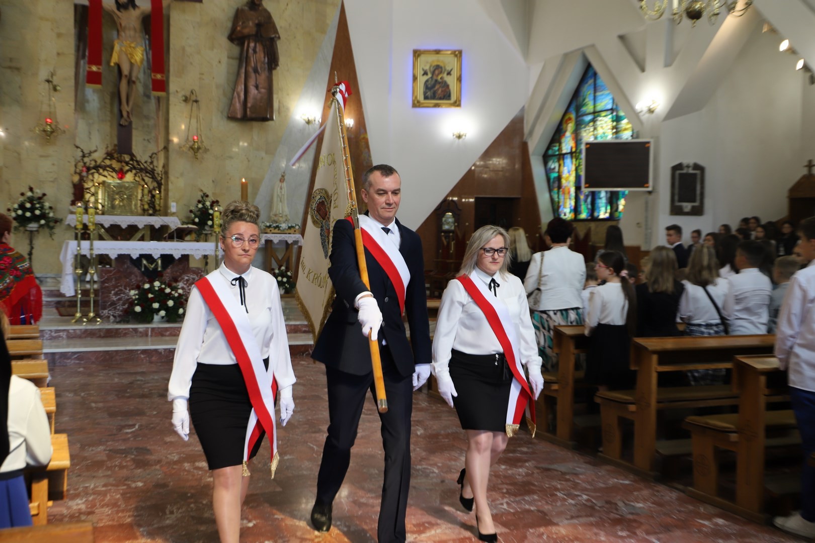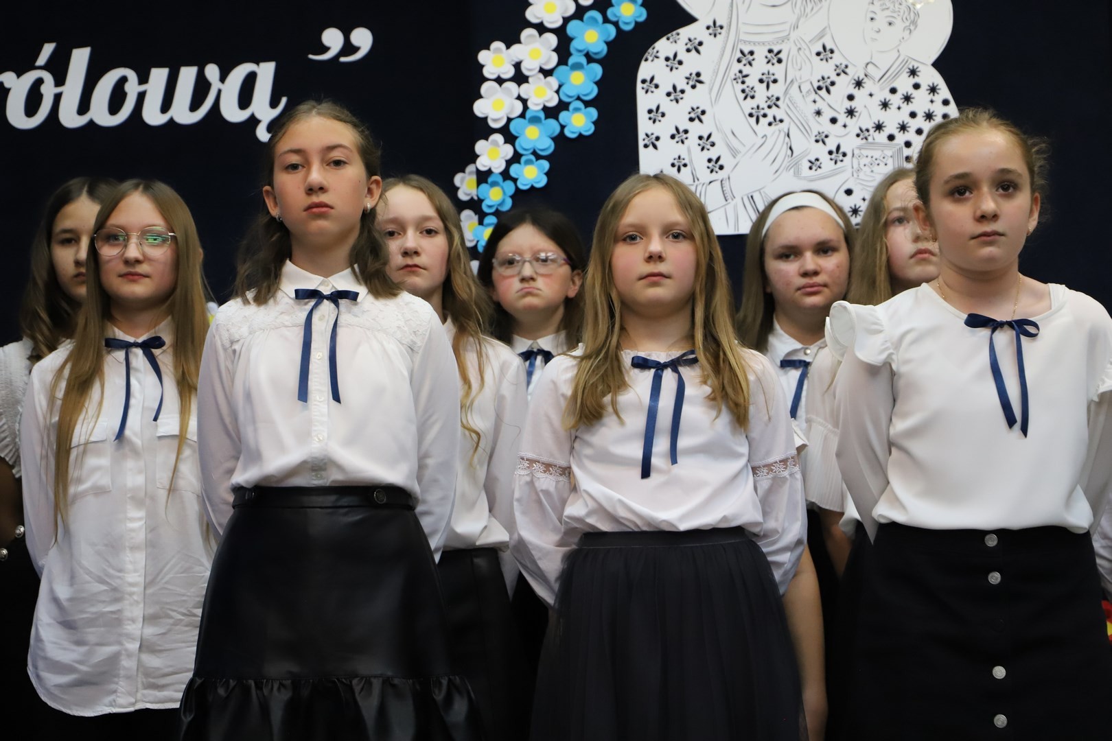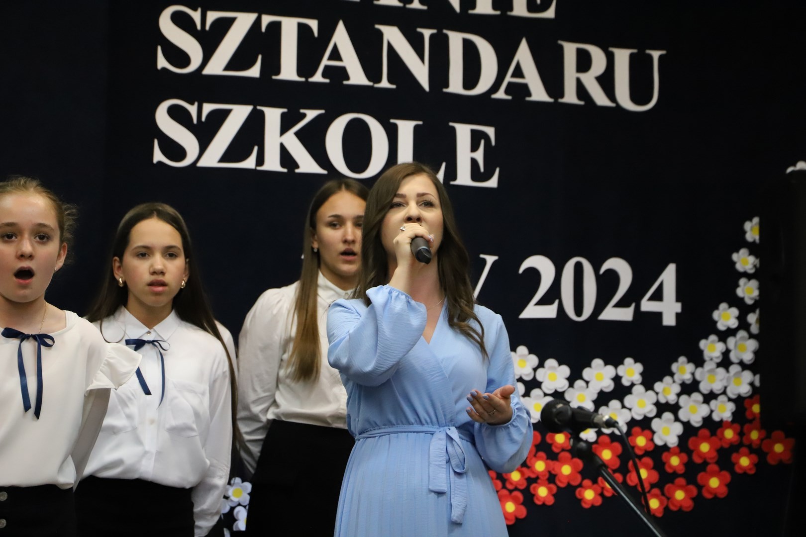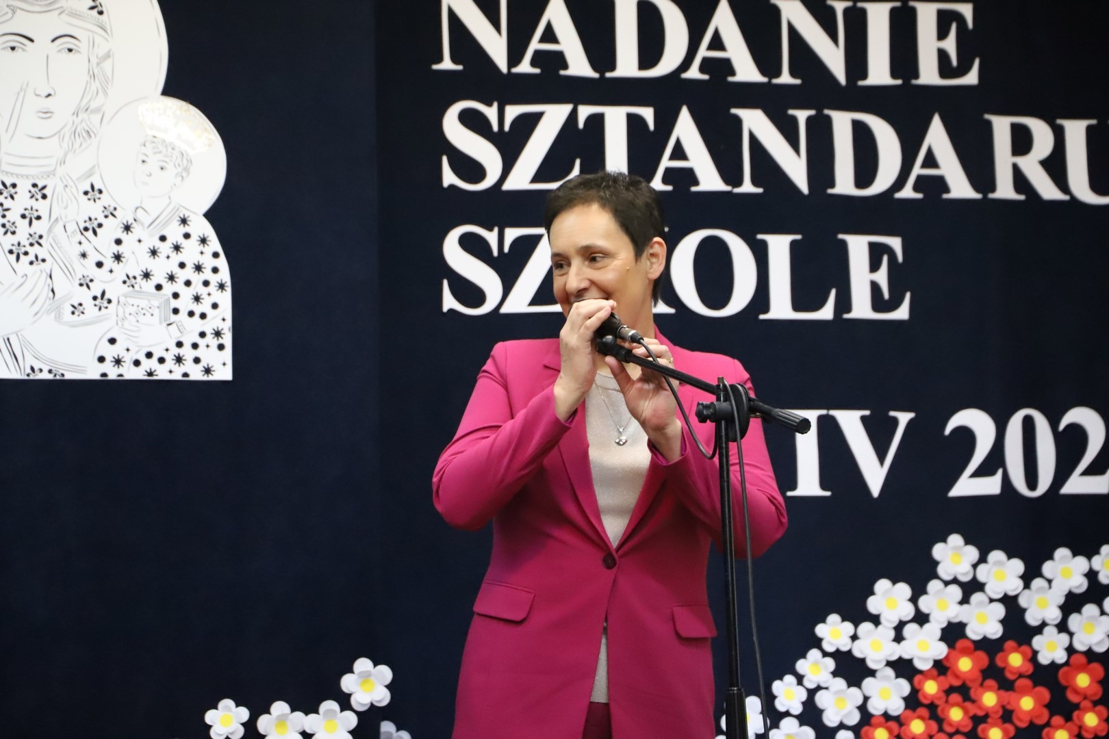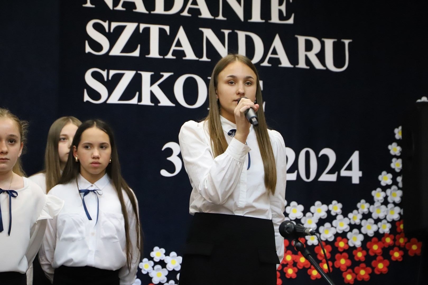 Poświęcenia sztandaru szkoły dokonał ksiądz biskup Leszek Leszkiewicz w czasie mszy św. w kościele parafialnym w Chomranicach, a następnie już w szkole nastąpił uroczysty akt przekazania sztandaru przez rodziców na ręce dyrektora szkoły, Romana Ciesielczyka, który z kolei wręczył sztandar uczniom. Po odśpiewaniu hymnu szkoły wszyscy zgromadzeni mogli obejrzeć część artystyczną w wykonaniu uczniów szkoły, którzy przez swój występ chcieli godnie uczcić ten szczególny dzień. Przedstawili zgromadzonym historię przyjęcia przez szkołę Patronki, wyjaśnili, jak doszło do nadania Matce Bożej tytułu Królowej Korony Polskiej oraz nawiązali do rocznicy uchwalenia Konstytucji 3 Maja. Historyczne wydarzenia były przeplatane wierszami tematycznymi oraz pieśniami ku czci Patronki szkoły w wykonaniu szkolnego chóru. Na podsumowanie tej części wszyscy odśpiewali hymn państwowy.