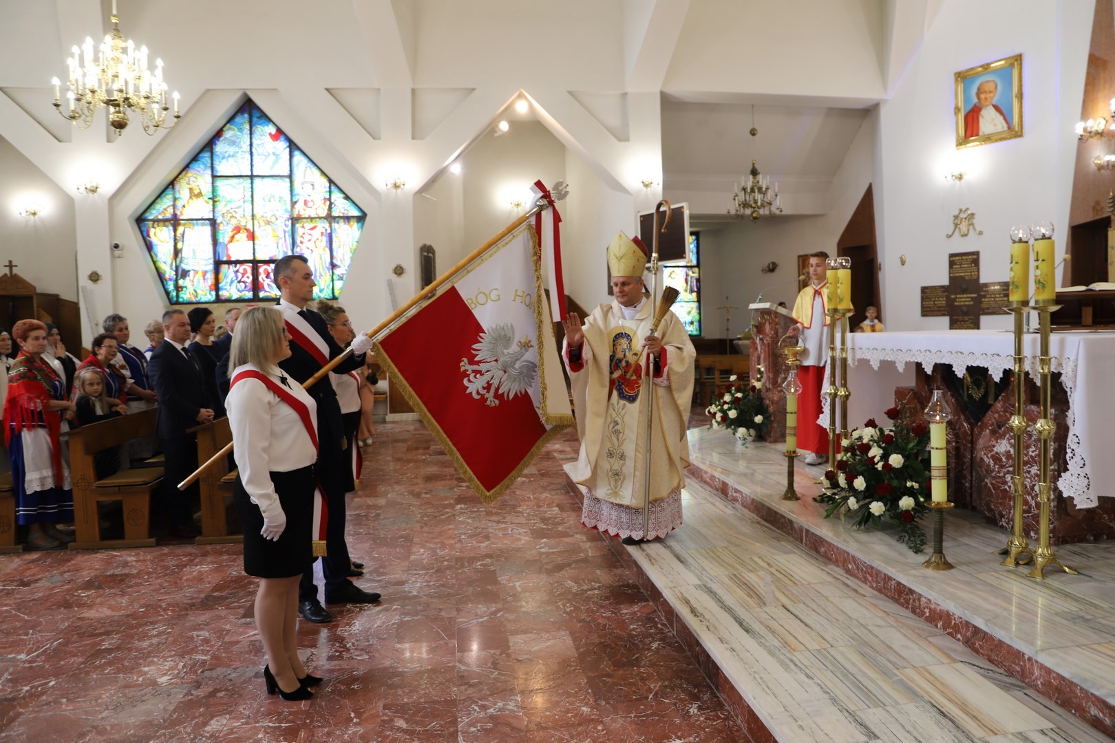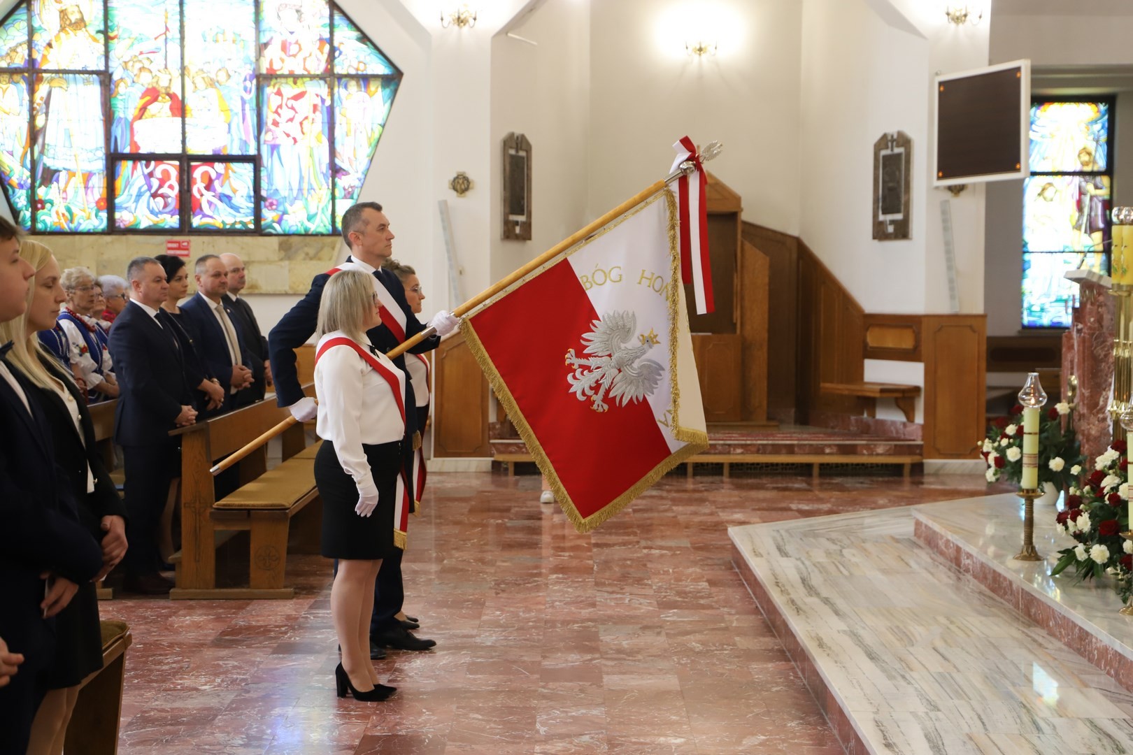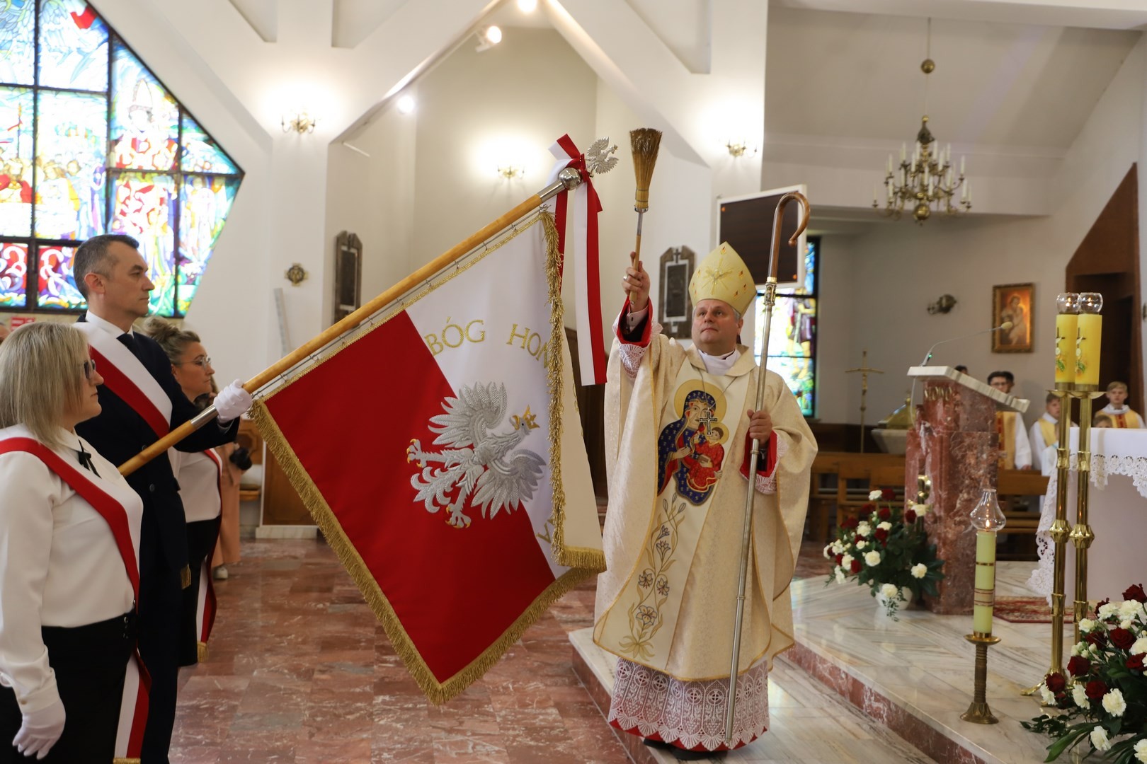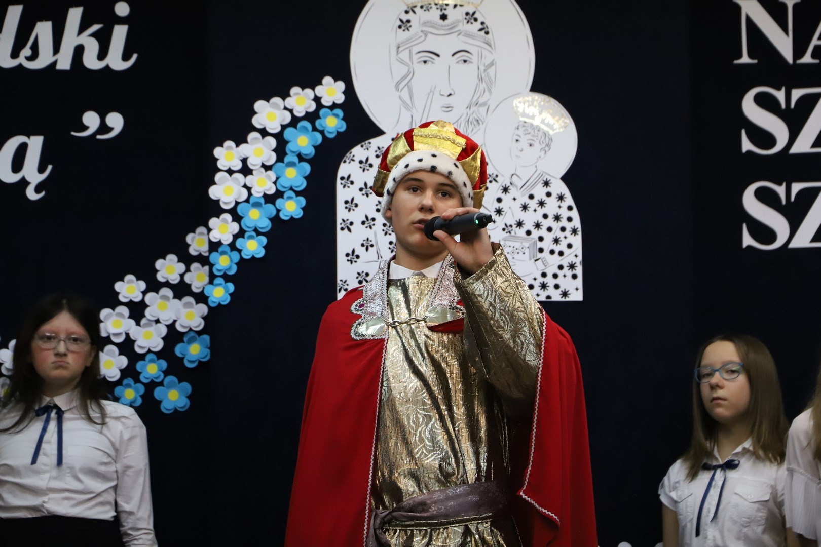 Poświęcenia sztandaru szkoły dokonał ksiądz biskup Leszek Leszkiewicz w czasie mszy św. w kościele parafialnym w Chomranicach, a następnie już w szkole nastąpił uroczysty akt przekazania sztandaru przez rodziców na ręce dyrektora szkoły, Romana Ciesielczyka, który z kolei wręczył sztandar uczniom. Po odśpiewaniu hymnu szkoły wszyscy zgromadzeni mogli obejrzeć część artystyczną w wykonaniu uczniów szkoły, którzy przez swój występ chcieli godnie uczcić ten szczególny dzień. Przedstawili zgromadzonym historię przyjęcia przez szkołę Patronki, wyjaśnili, jak doszło do nadania Matce Bożej tytułu Królowej Korony Polskiej oraz nawiązali do rocznicy uchwalenia Konstytucji 3 Maja. Historyczne wydarzenia były przeplatane wierszami tematycznymi oraz pieśniami ku czci Patronki szkoły w wykonaniu szkolnego chóru. Na podsumowanie tej części wszyscy odśpiewali hymn państwowy.