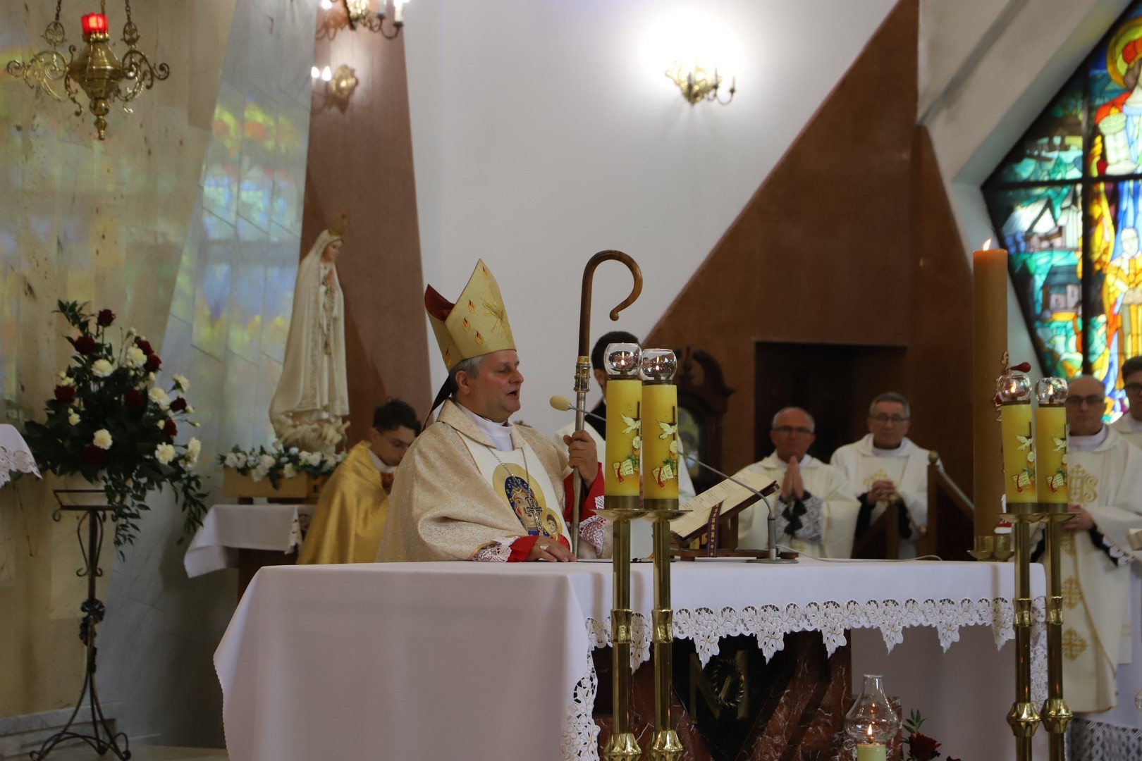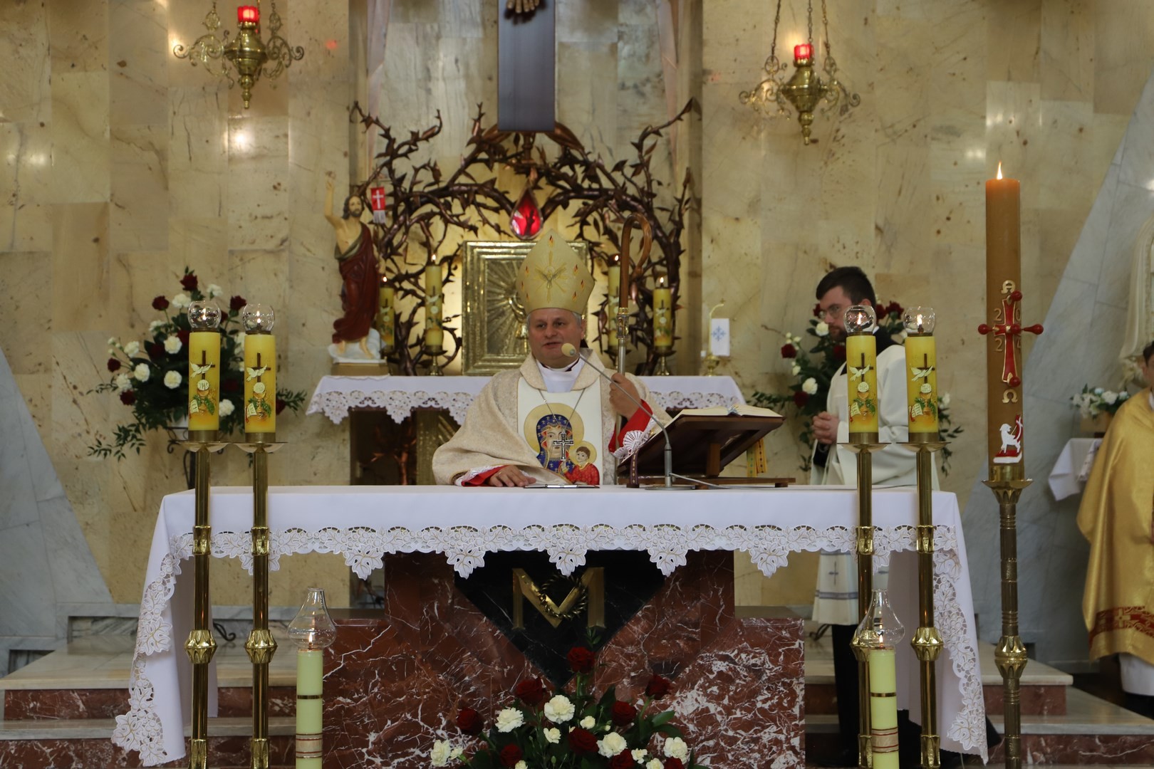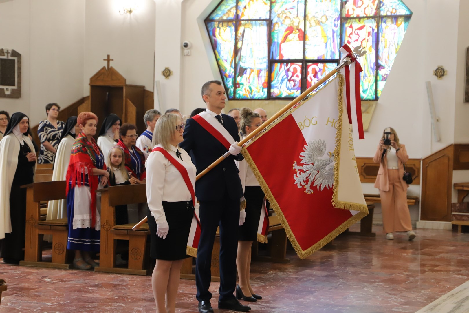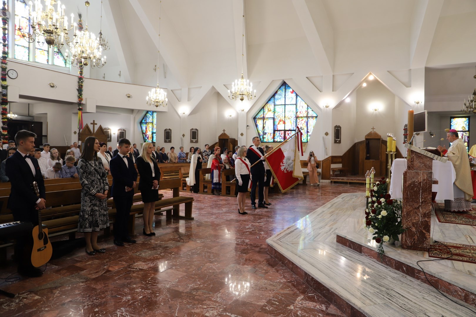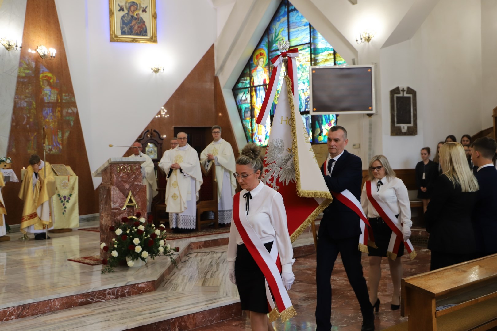 Poświęcenia sztandaru szkoły dokonał ksiądz biskup Leszek Leszkiewicz w czasie mszy św. w kościele parafialnym w Chomranicach, a następnie już w szkole nastąpił uroczysty akt przekazania sztandaru przez rodziców na ręce dyrektora szkoły, Romana Ciesielczyka, który z kolei wręczył sztandar uczniom. Po odśpiewaniu hymnu szkoły wszyscy zgromadzeni mogli obejrzeć część artystyczną w wykonaniu uczniów szkoły, którzy przez swój występ chcieli godnie uczcić ten szczególny dzień. Przedstawili zgromadzonym historię przyjęcia przez szkołę Patronki, wyjaśnili, jak doszło do nadania Matce Bożej tytułu Królowej Korony Polskiej oraz nawiązali do rocznicy uchwalenia Konstytucji 3 Maja. Historyczne wydarzenia były przeplatane wierszami tematycznymi oraz pieśniami ku czci Patronki szkoły w wykonaniu szkolnego chóru. Na podsumowanie tej części wszyscy odśpiewali hymn państwowy.
