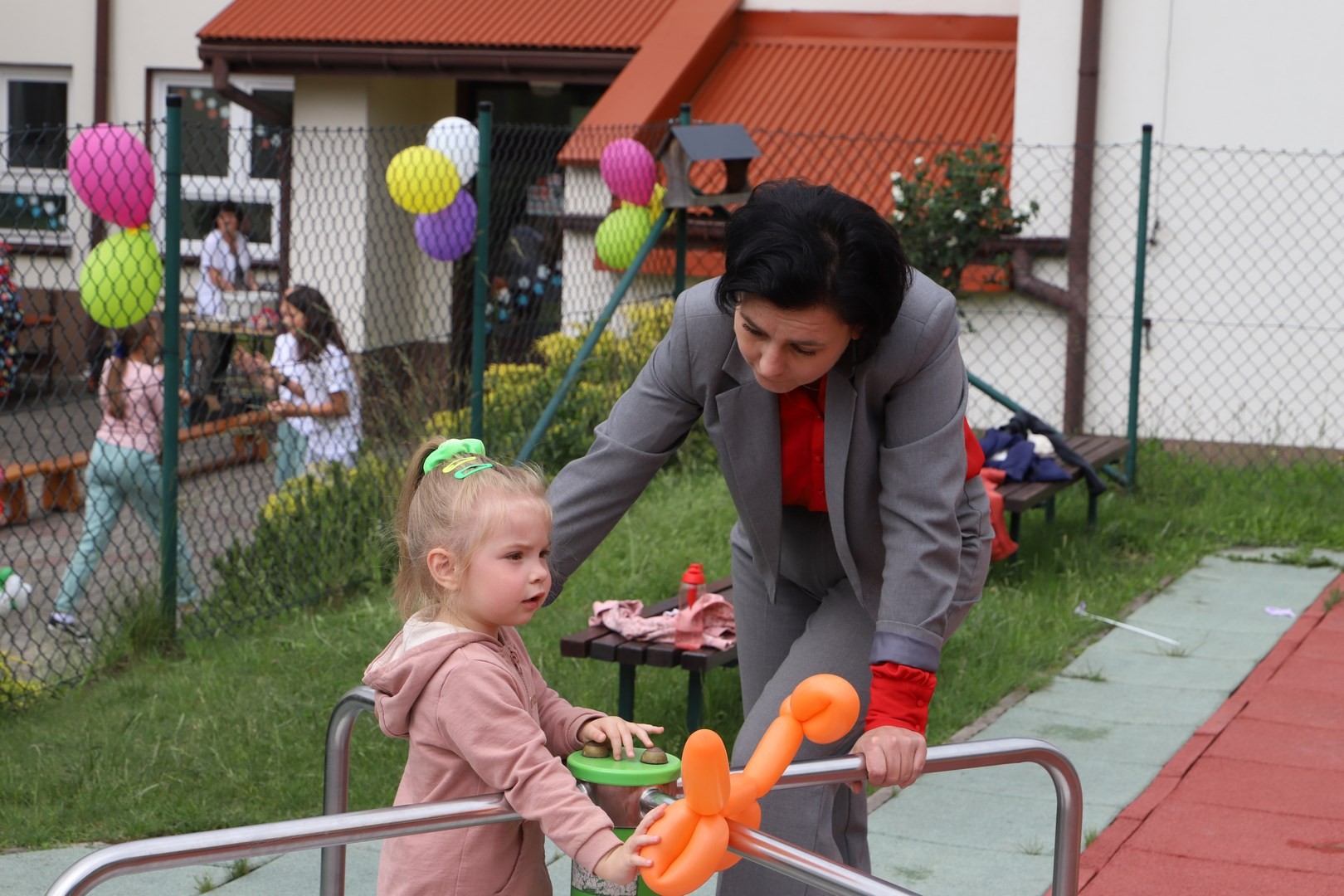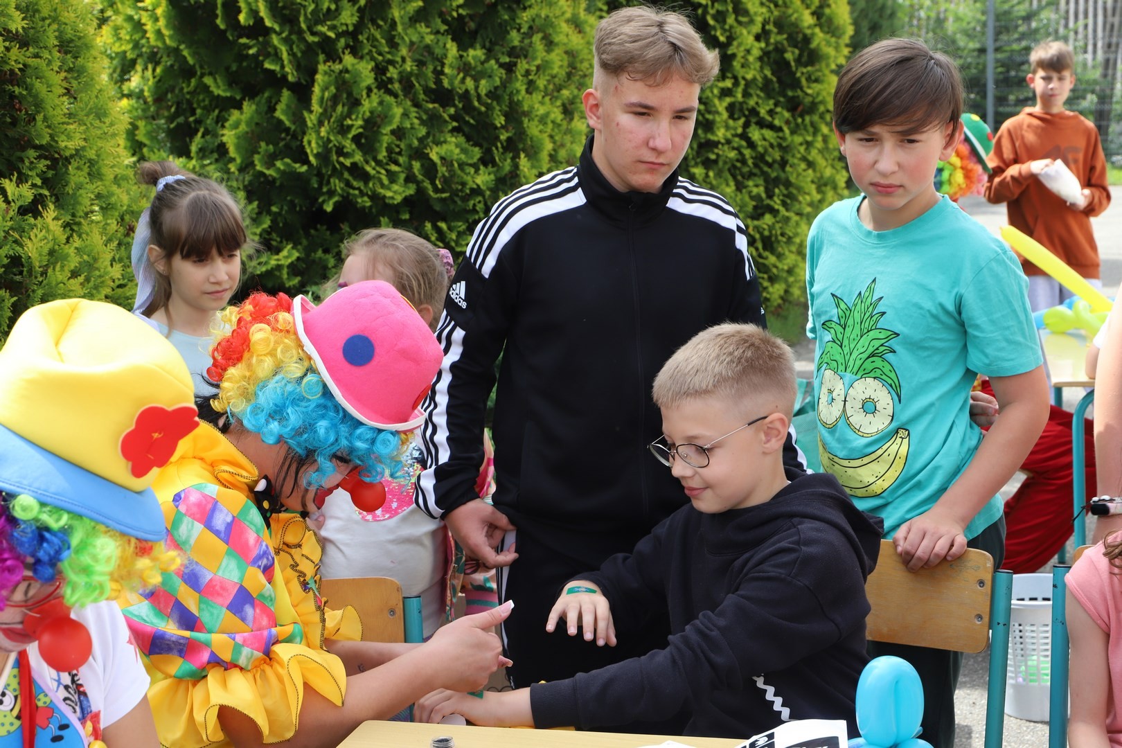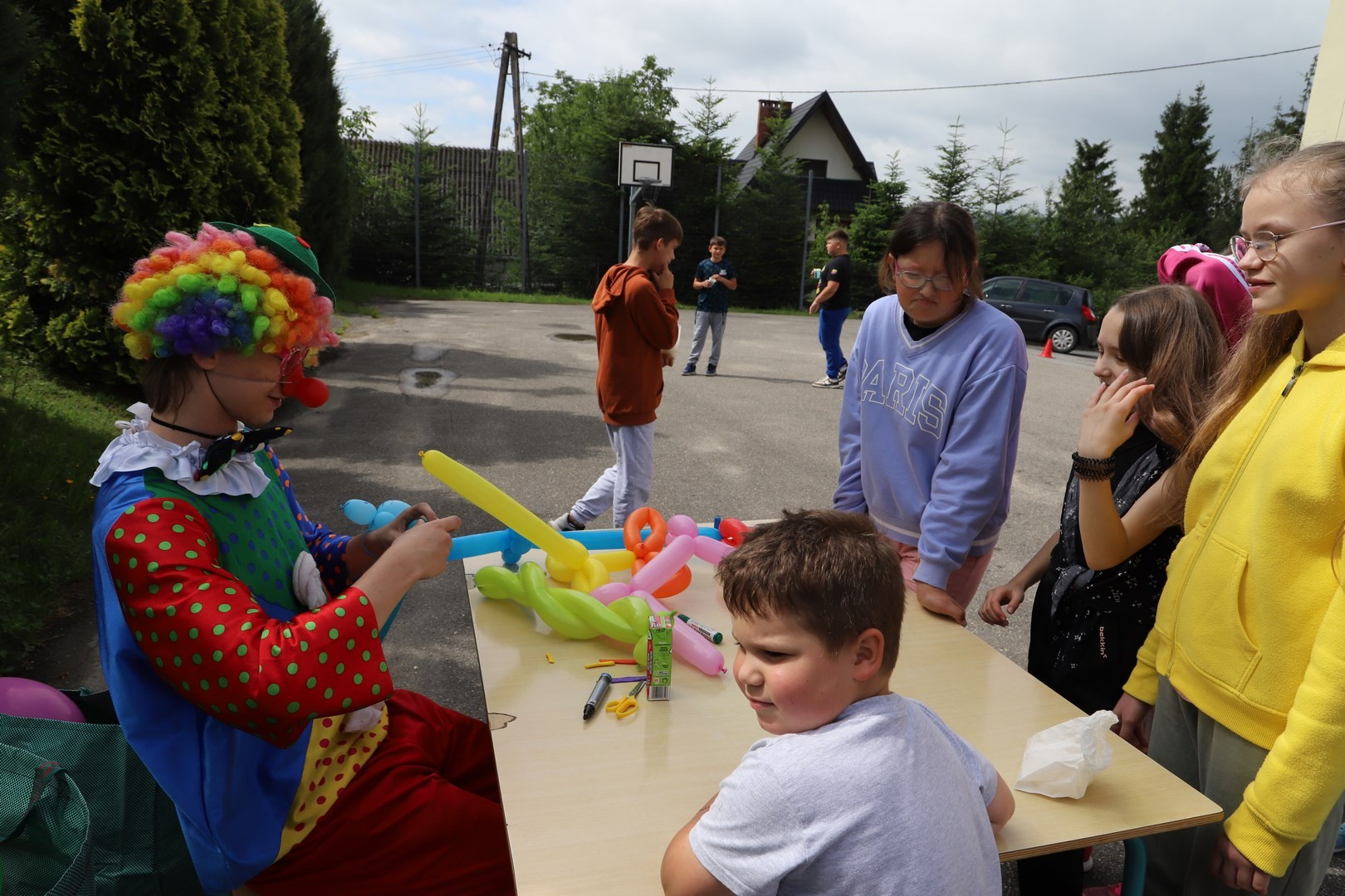 Na łasuchów czekały różnego rodzaju przekąski m.in. wata cukrowa, soczki, lody i popcorn, a w ramach obiadu była kiełbaska z grilla. We wszystkich atrakcjach towarzyszyły i wspomagały w ich organizacji mamy z Rady Rodziców, w przepięknych, kolorowych strojach klaunów.