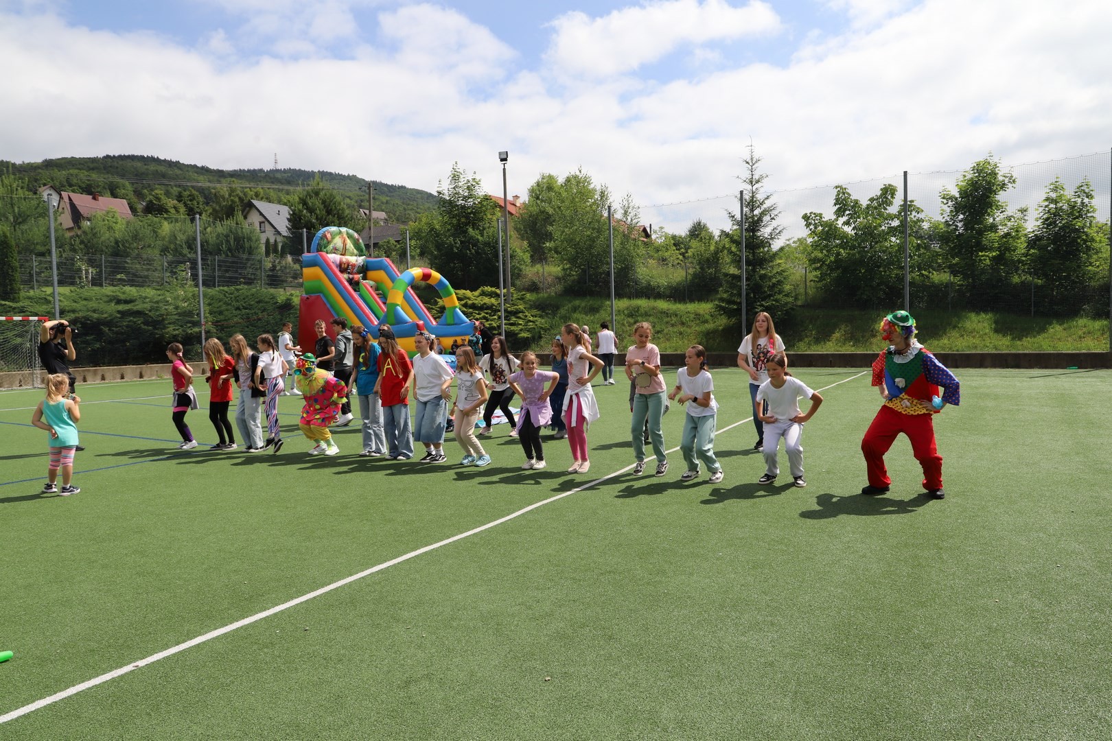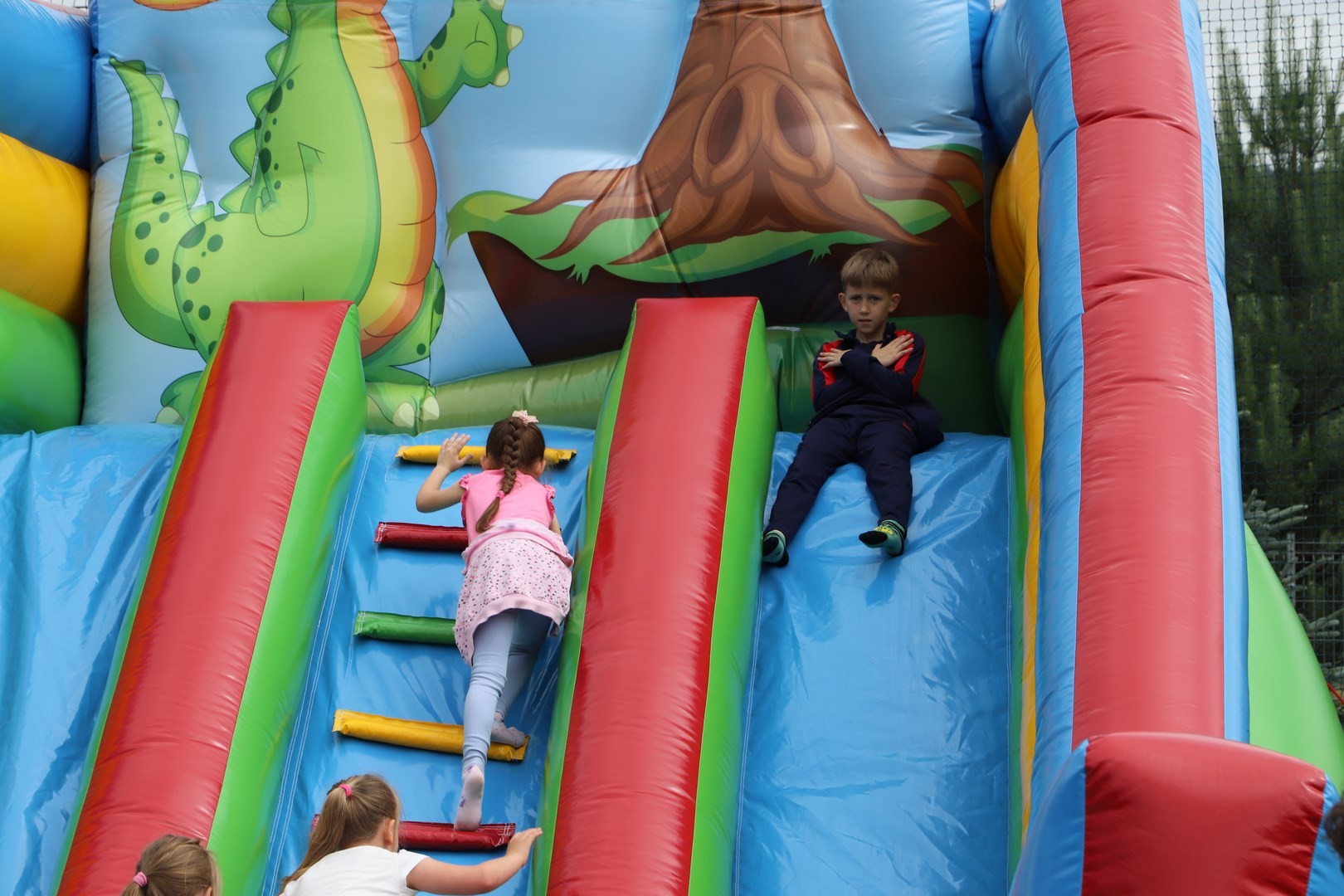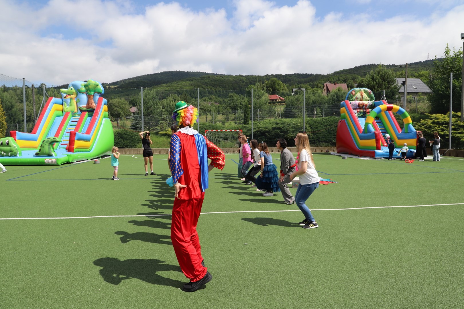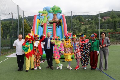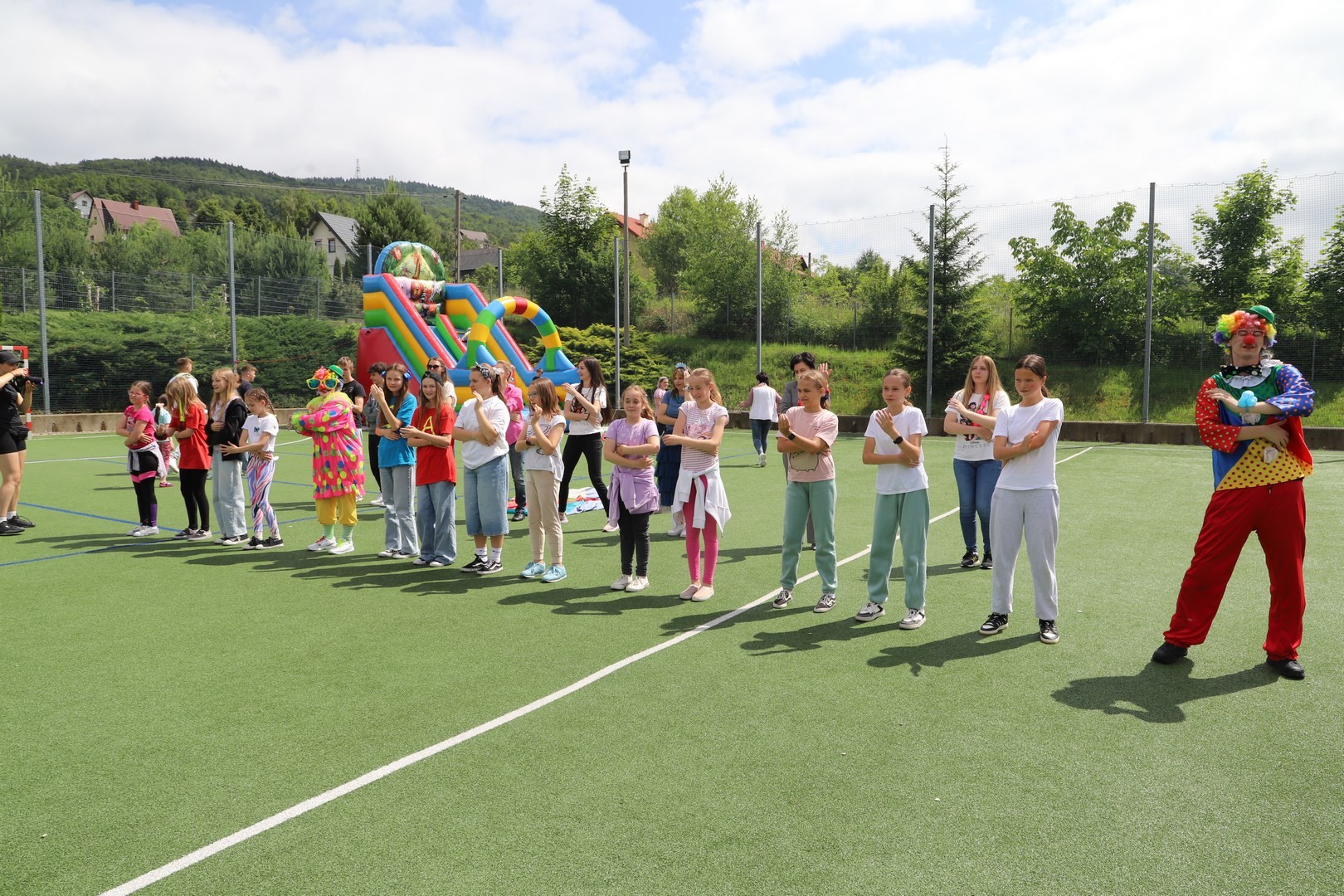 Dyrektor powitał wszystkich zgromadzonych, a następnie zostały przedstawione zasady bezpiecznego korzystania z dostępnych rozrywek. Na uczniów czekała cała masa atrakcji, a każdy mógł znaleźć coś ciekawego dla siebie. Zarówno starsi, jak i najmłodsze dzieci z oddziału przedszkolnego mogły korzystać ze wszystkich dostępnych zabaw. Dużym zainteresowaniem cieszyły się m.in. dmuchane zjeżdżalnie oraz zabawy z chustą animacyjną.