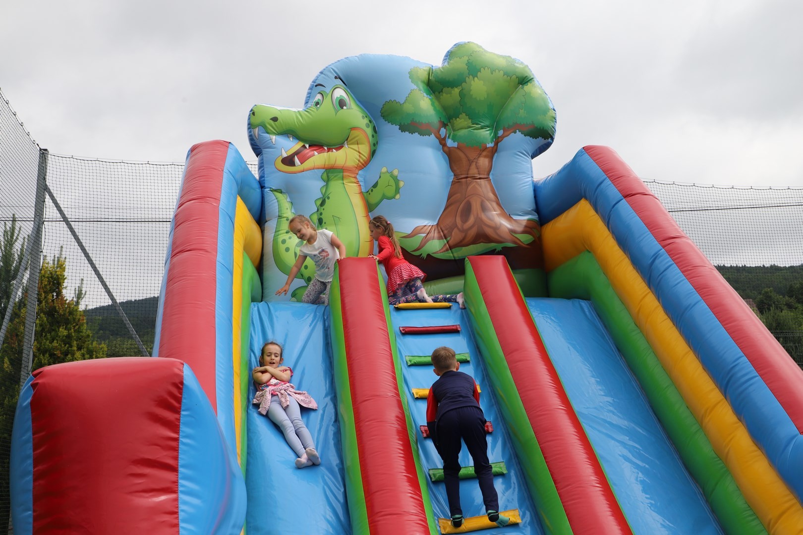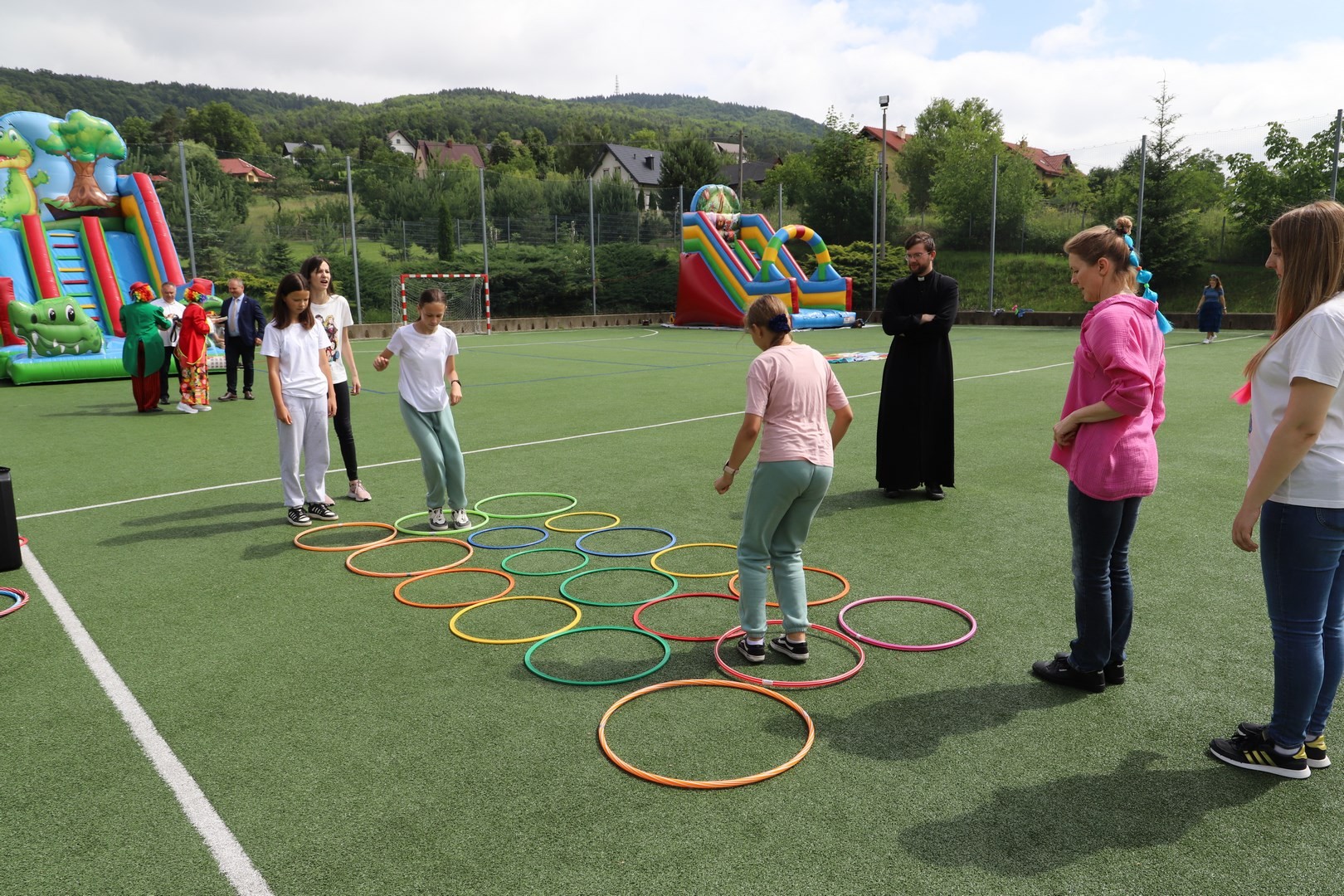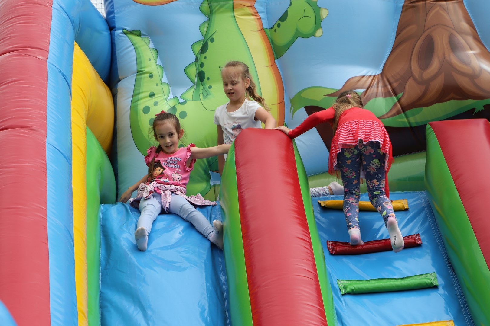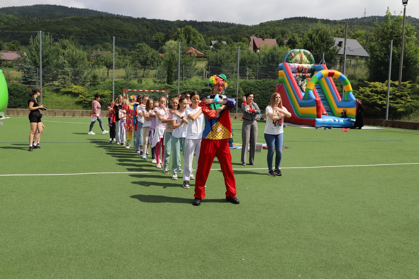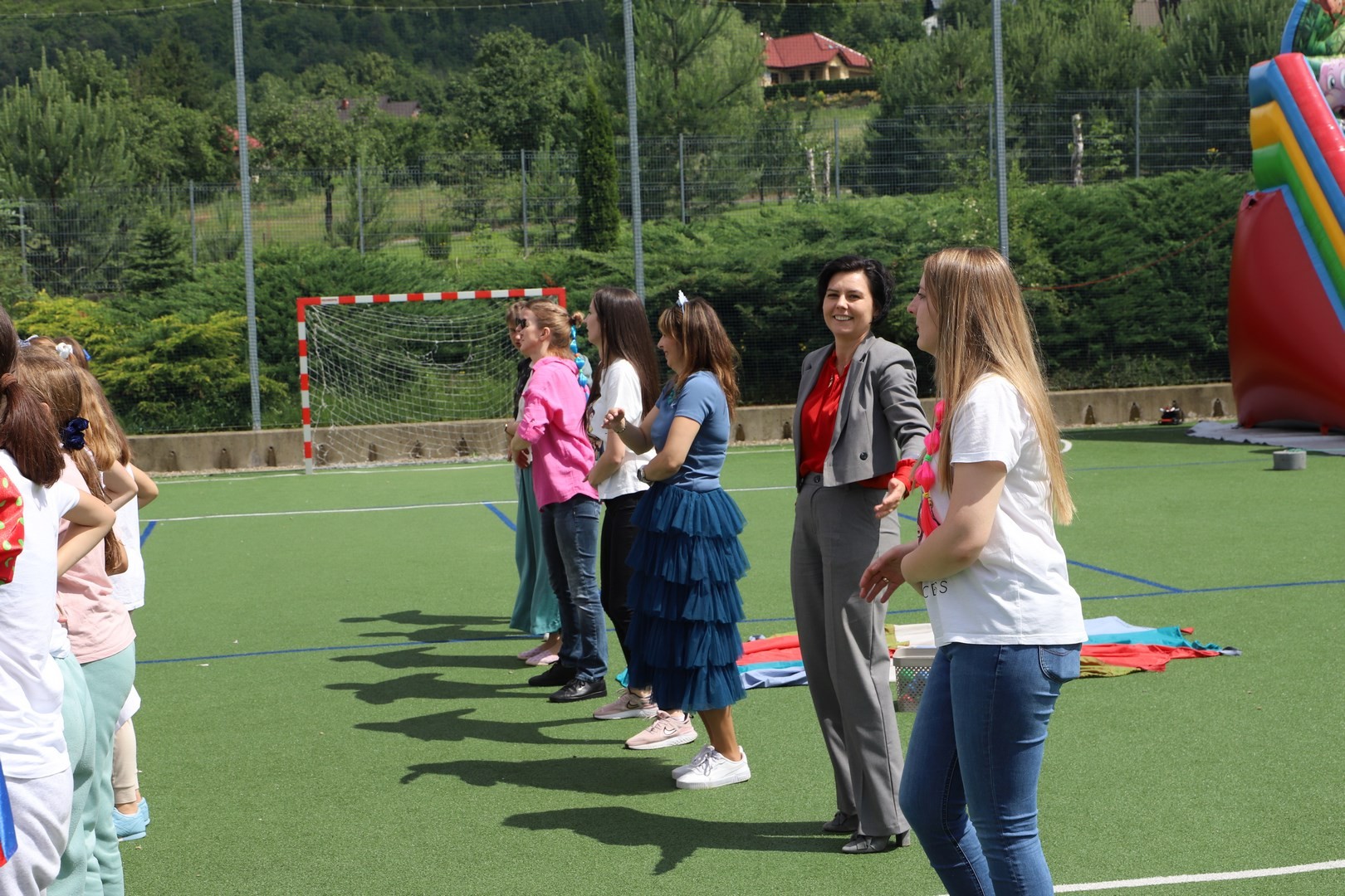 Dyrektor powitał wszystkich zgromadzonych, a następnie zostały przedstawione zasady bezpiecznego korzystania z dostępnych rozrywek. Na uczniów czekała cała masa atrakcji, a każdy mógł znaleźć coś ciekawego dla siebie. Zarówno starsi, jak i najmłodsze dzieci z oddziału przedszkolnego mogły korzystać ze wszystkich dostępnych zabaw. Dużym zainteresowaniem cieszyły się m.in. dmuchane zjeżdżalnie oraz zabawy z chustą animacyjną.